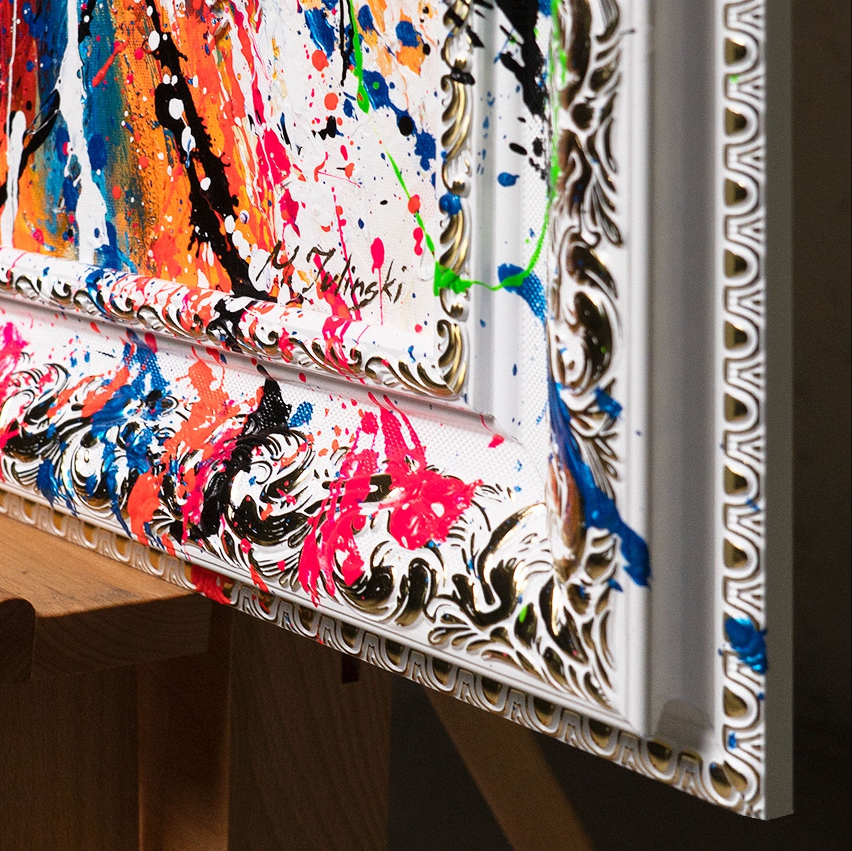 • Seitlicher Blick auf das Gemälde mit Rahmen