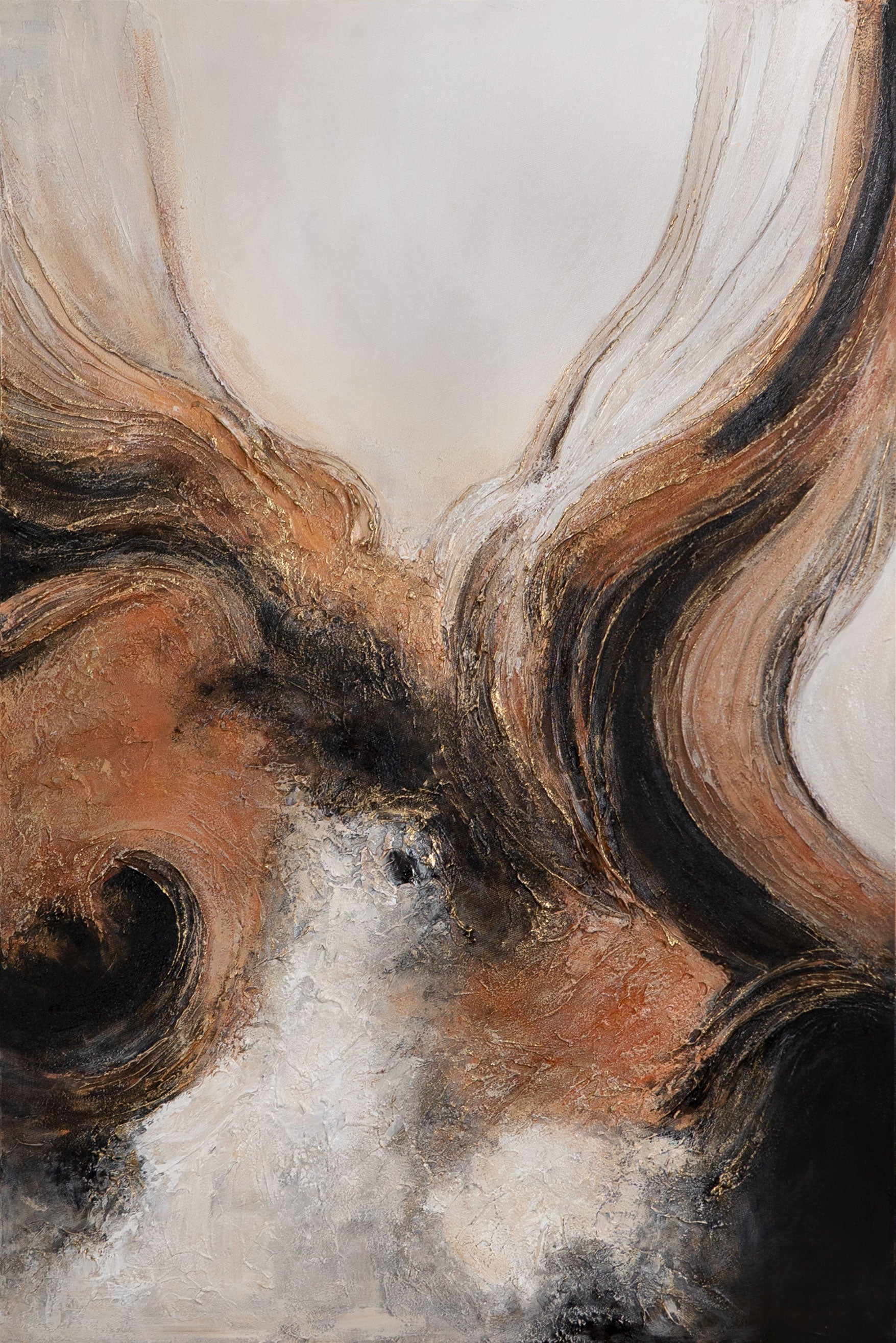 „Elementti liikkeessä“ on käsinmaalattu akryylimaalaus, joka kiehtoo dynaamisella muotokielellään ja voimakkailla värivivahteillaan. Tummat mustat aksentit sulautuvat lämpimiin ruskean ja beigen sävyihin, kun taas rakenteellinen pinta luo syvyyttä ja elävyyttä. Reliefimäinen toteutus tuo liikkeen tuntua ja tekee teoksesta modernin seinätaiteen katseenvangitsijan.