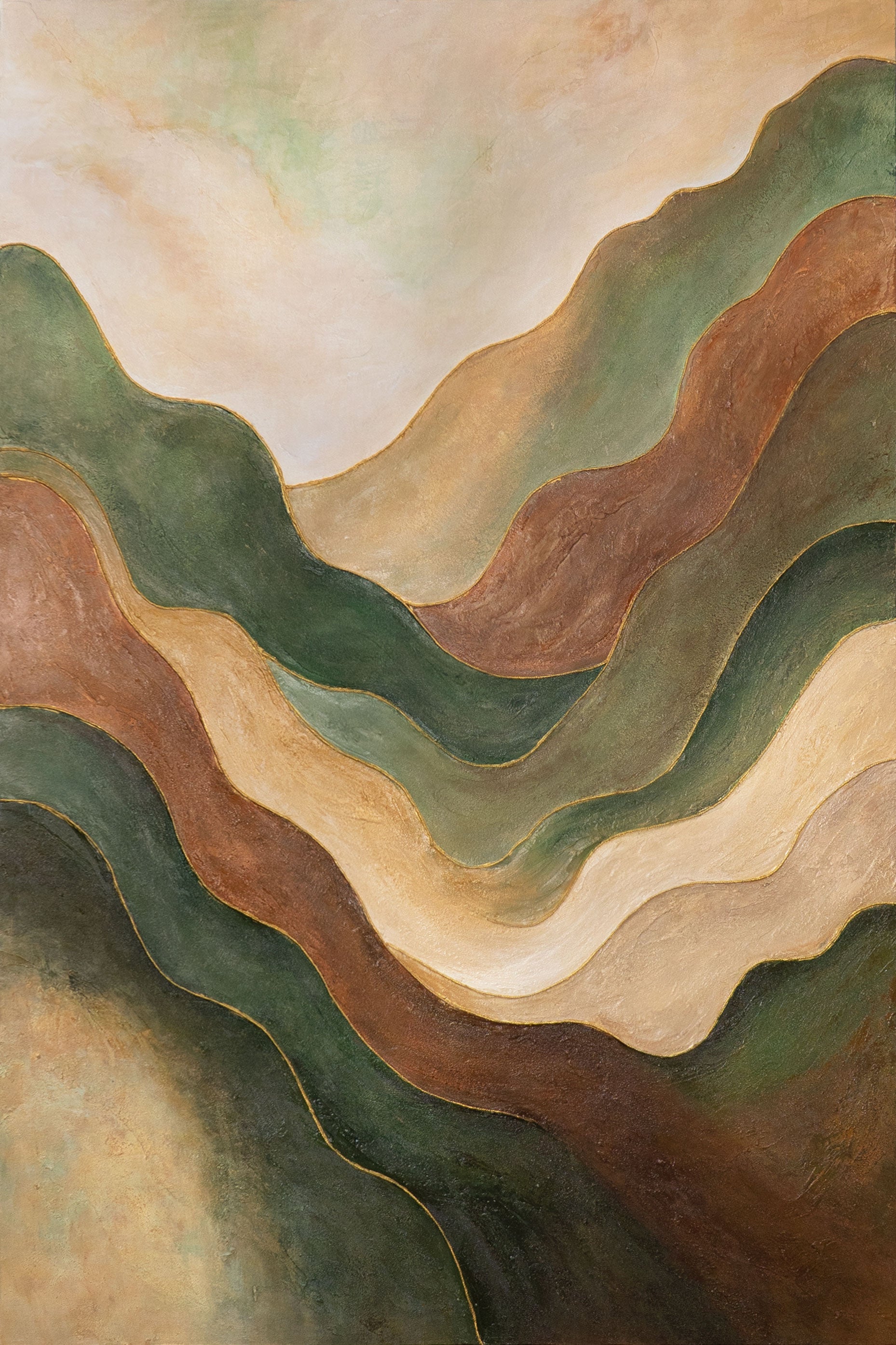 "Kukkuloiden tanssi" on tunnelmallinen akryylityö, joka vangitsee kumpuilevan maiseman pehmeät liikkeet. Vihreät, ruskeat ja beigen sävyt muodostavat harmonisen aaltoilevan rakenteen, joka huokuu luonnonläheisyyttä ja rauhaa. Rakenteellinen maalaustapa antaa teokselle syvyyttä ja erityisen kosketeltavan laadun.