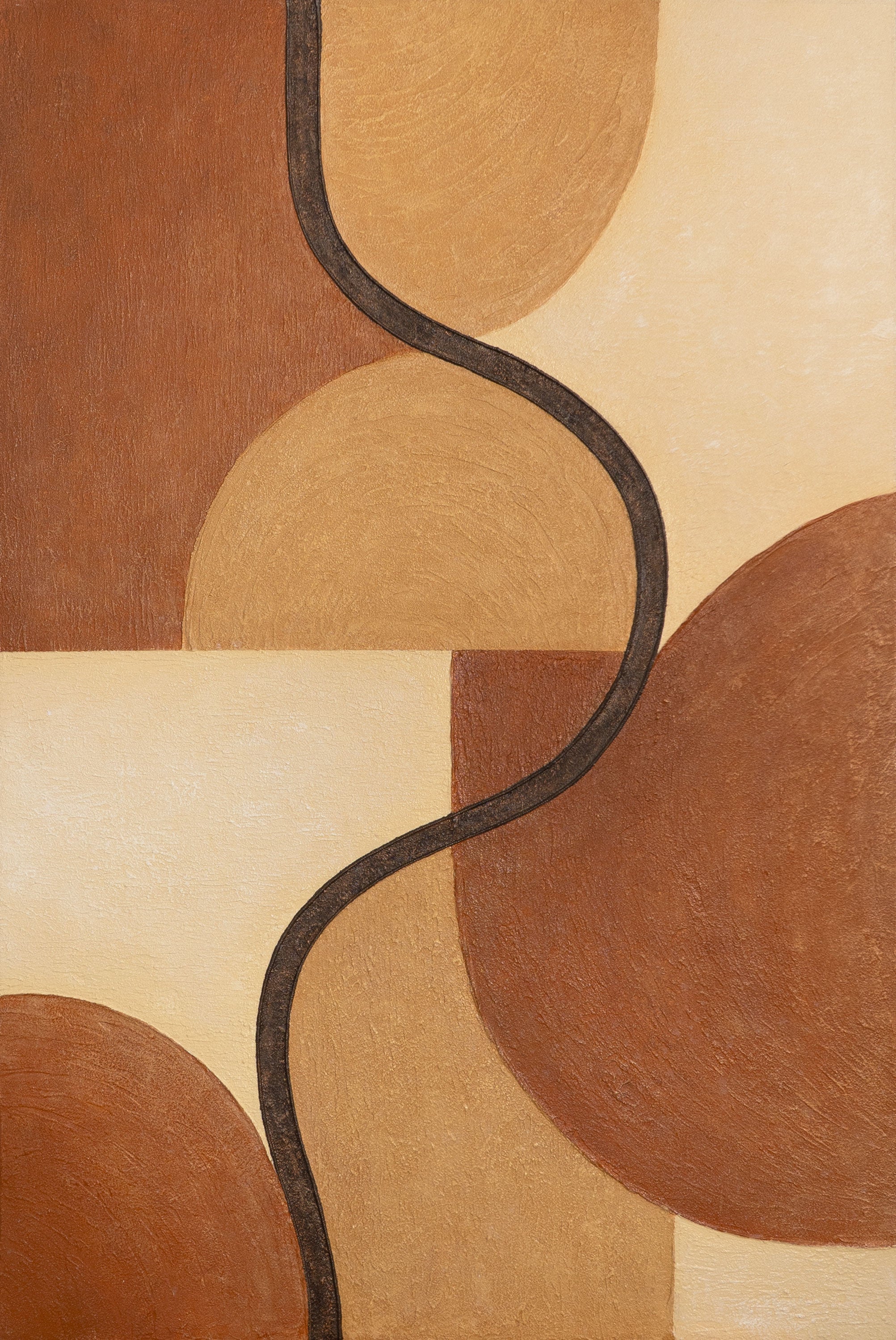 „Muotojen kudelma“ on käsinmaalattu akryylimaalaus, joka kiehtoo viivojen ja pintojen harmonisella yhdistelmällä. Sävyiltään lämmin koostumus – ruskean, beigen ja okran sävyissä – luo luonnollista syvyyttä ja liikkeen tuntua. Rakenteellinen pinta tuo dynaamisuutta geometrisiin muotoihin ja antaa teokselle modernin, kosketeltavan ilmeen.