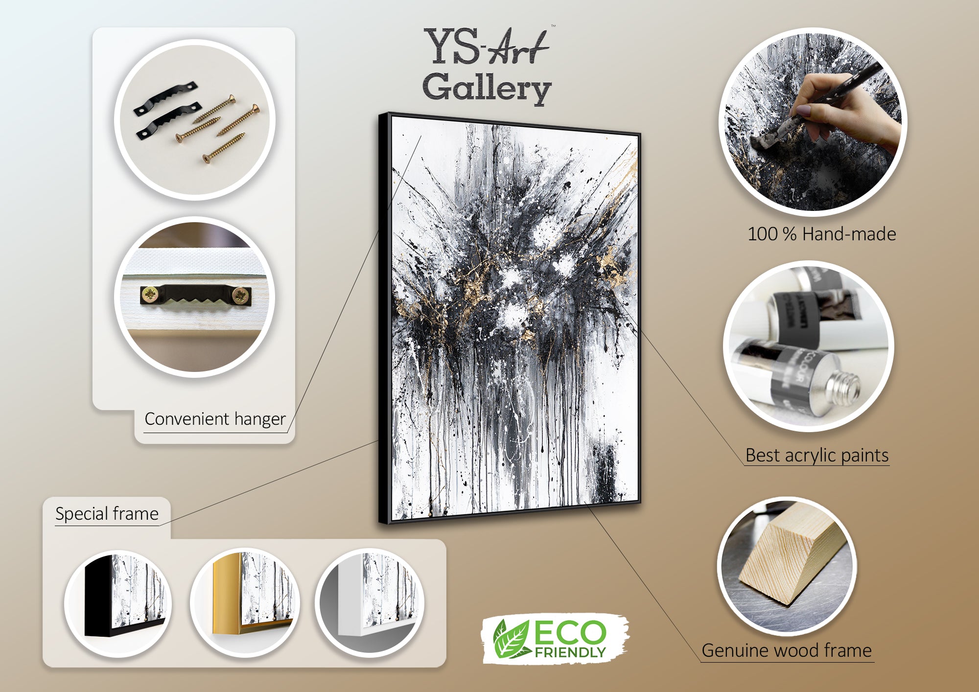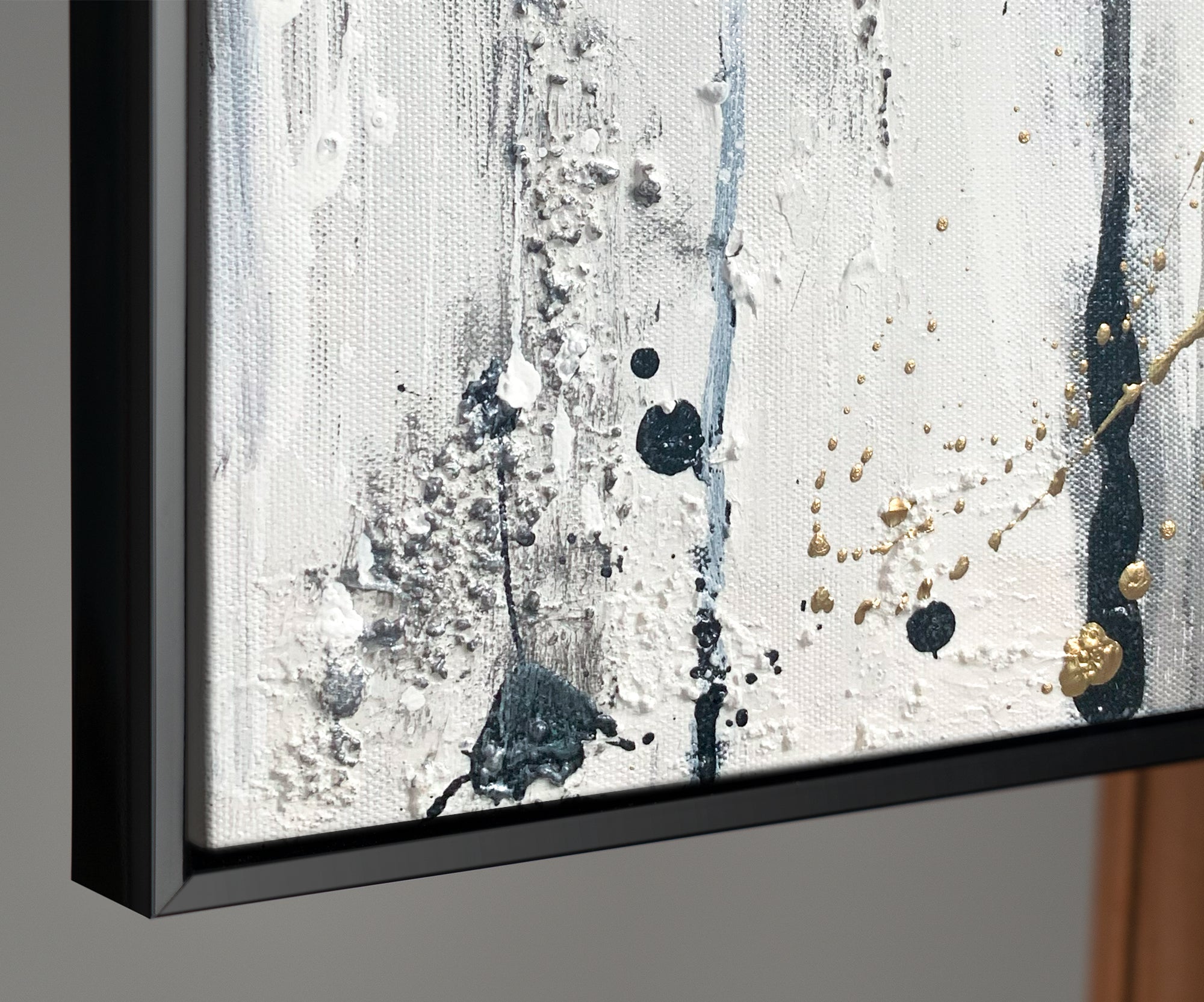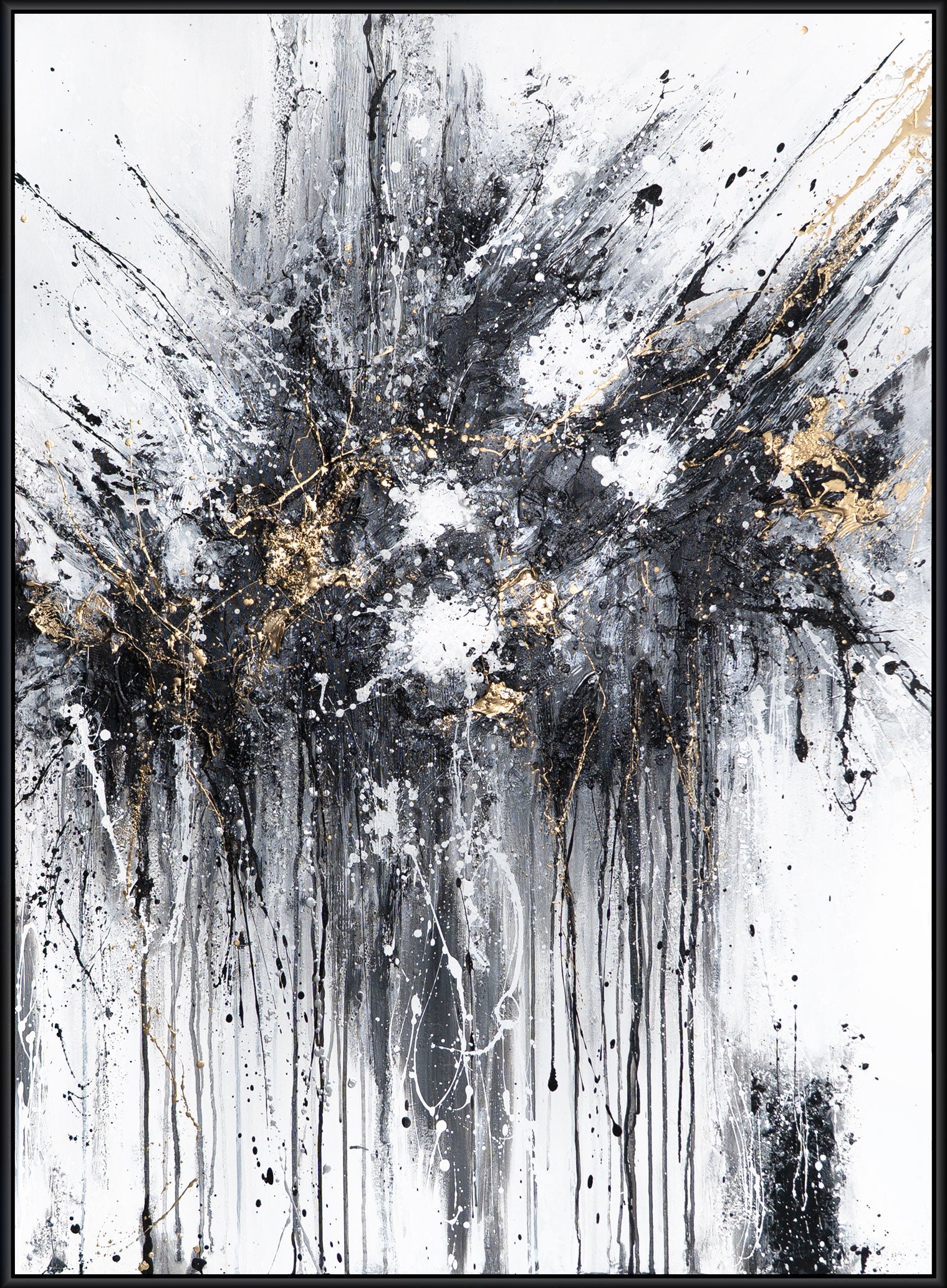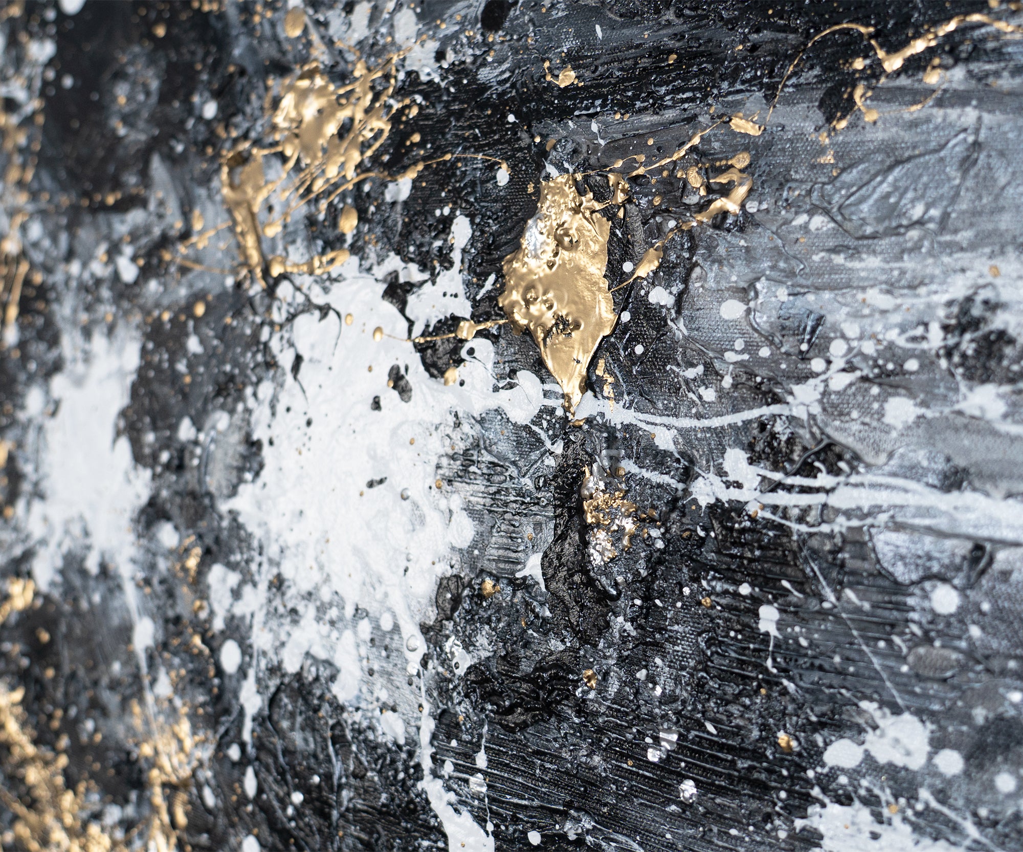 Dynaaminen viivojen, pisaroiden ja värien räjähdysten purske hallitsee tätä abstraktia taideteosta mustana, valkoisena ja kultaisena. Maalaus näyttää spontaanilta energianpurkaukselta kankaalla – voimakkaalta, hallitsemattomalta, mutta harmoniselta vuorovaikutuksessaan. Kultaiset yksityiskohdat lisäävät sommitelmaan ripauksen eleganssia ja syvyyttä, kun taas teksturoitu pinta heijastaa valoa eri tavoin. Tämä moderni canvas taulu sopii erinomaisesti puristisiin, minimalistisiin tai teollisiin sisätiloihin. Olipa kyseessä olohuone, eteinen tai toimisto – maalaus tekee vahvan visuaalisen vaikutelman.