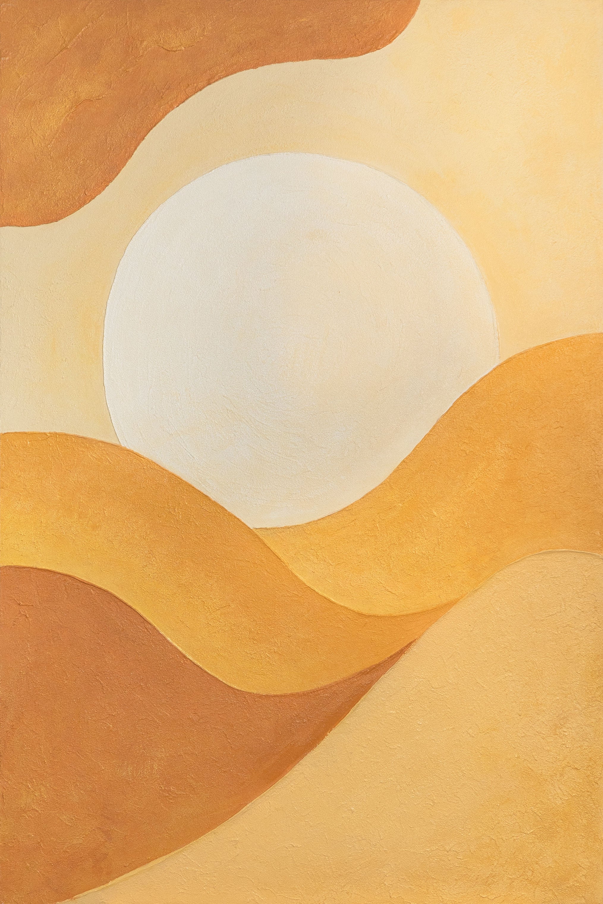 Tämä abstrakti kangasmaalaus tuo valoa ja turvallisuuden tunnetta moderneihin sisustuksiin. Se sopii täydellisesti olohuoneeseen, makuuhuoneeseen tai toimistoon ja luo tilaan rauhallisen, auringonvalosta hehkuvan ilmapiirin. Turvallisen toimituksen ja ilmaisen toimituksen ansiosta saat uniikin käsinmaalatun taideteoksen, joka yhdistää taiteen ja luonnollisuuden.