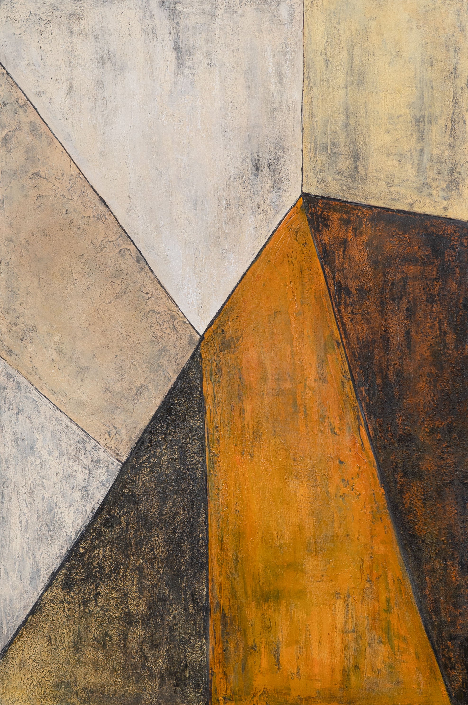 „Tasojen kohtaaminen“ on käsinmaalattu akryylimaalaus, joka yhdistää geometriset muodot ja pehmeän rakenteen harmoniseen tasapainoon. Kontrastinen väripaletti – lämmin oranssi, hillitty musta ja vaalea beige – antaa sommitelmalle syvyyttä ja dynaamisuutta. Rakenteellinen pinta heijastaa valoa hienovaraisesti ja luo vivahteikkaan leikin muodon, värin ja tekstuurin välille.