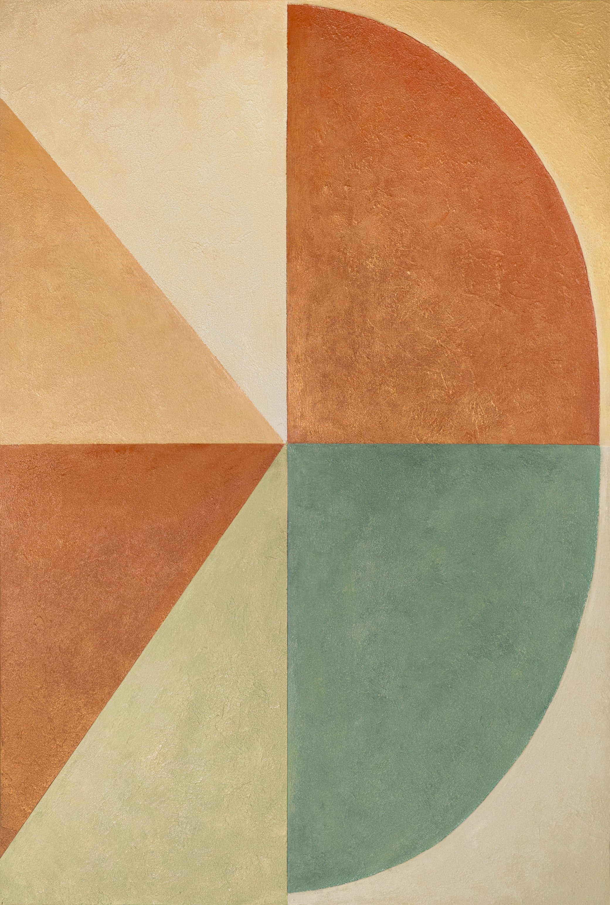 „Muotojen tasapaino“ on käsinmaalattu akryylimaalaus, joka ihastuttaa geometrisilla pinnoillaan ja harmonisella värijaollaan. Lämpimät oranssin ja beigen sävyt kohtaavat viileän vihreän ja pehmeän kerman, muodostaen tasapainoisen kokonaisuuden, joka huokuu rauhaa ja harmoniaa. Rakenteellinen pinta antaa teokselle syvyyttä ja korostaa taiteellista käsityötä.