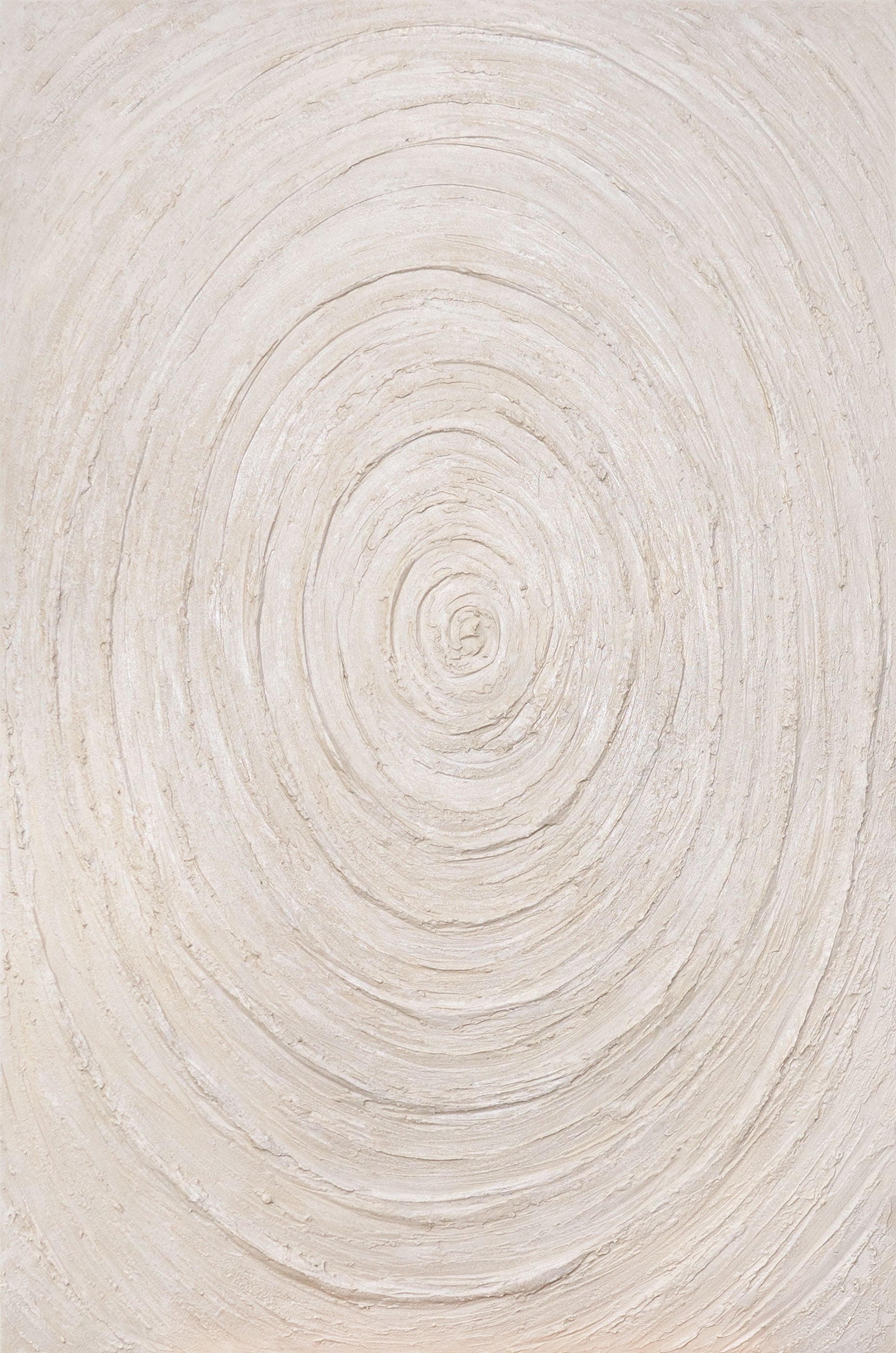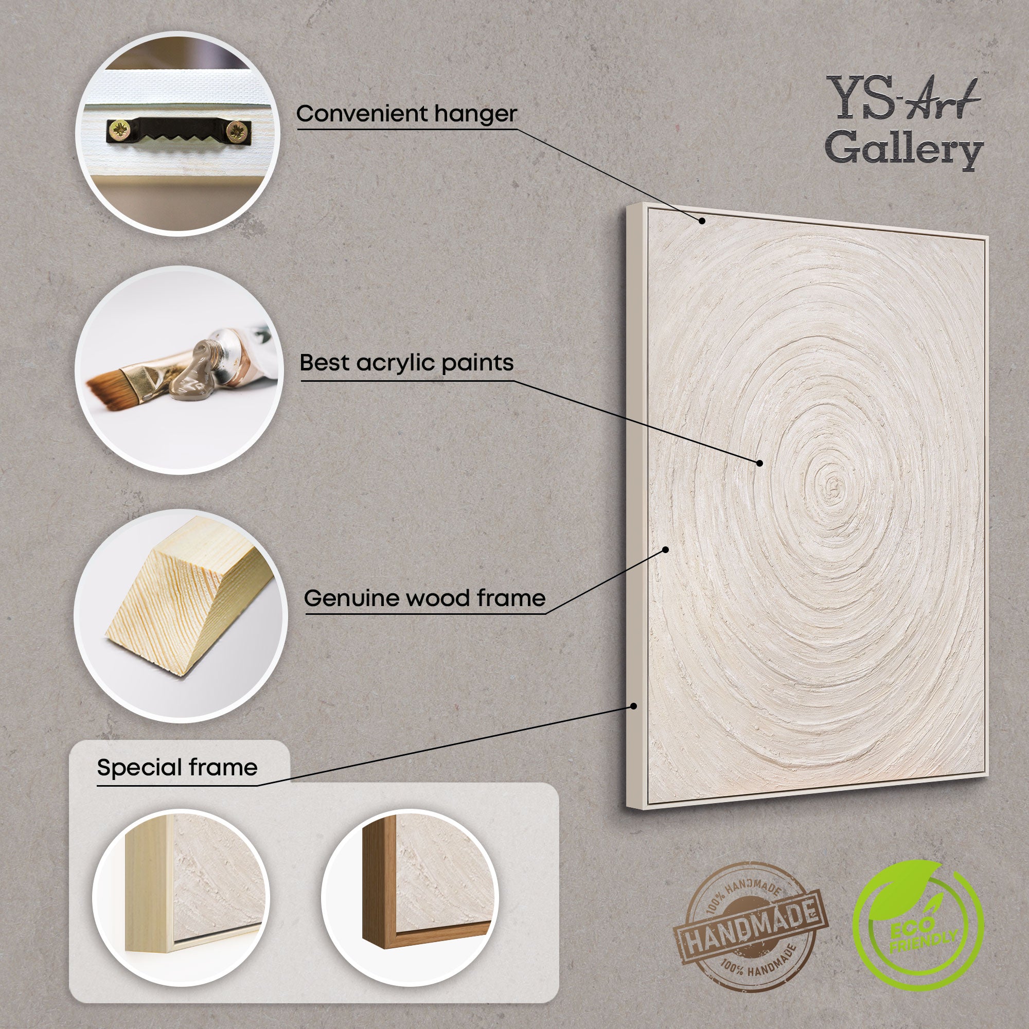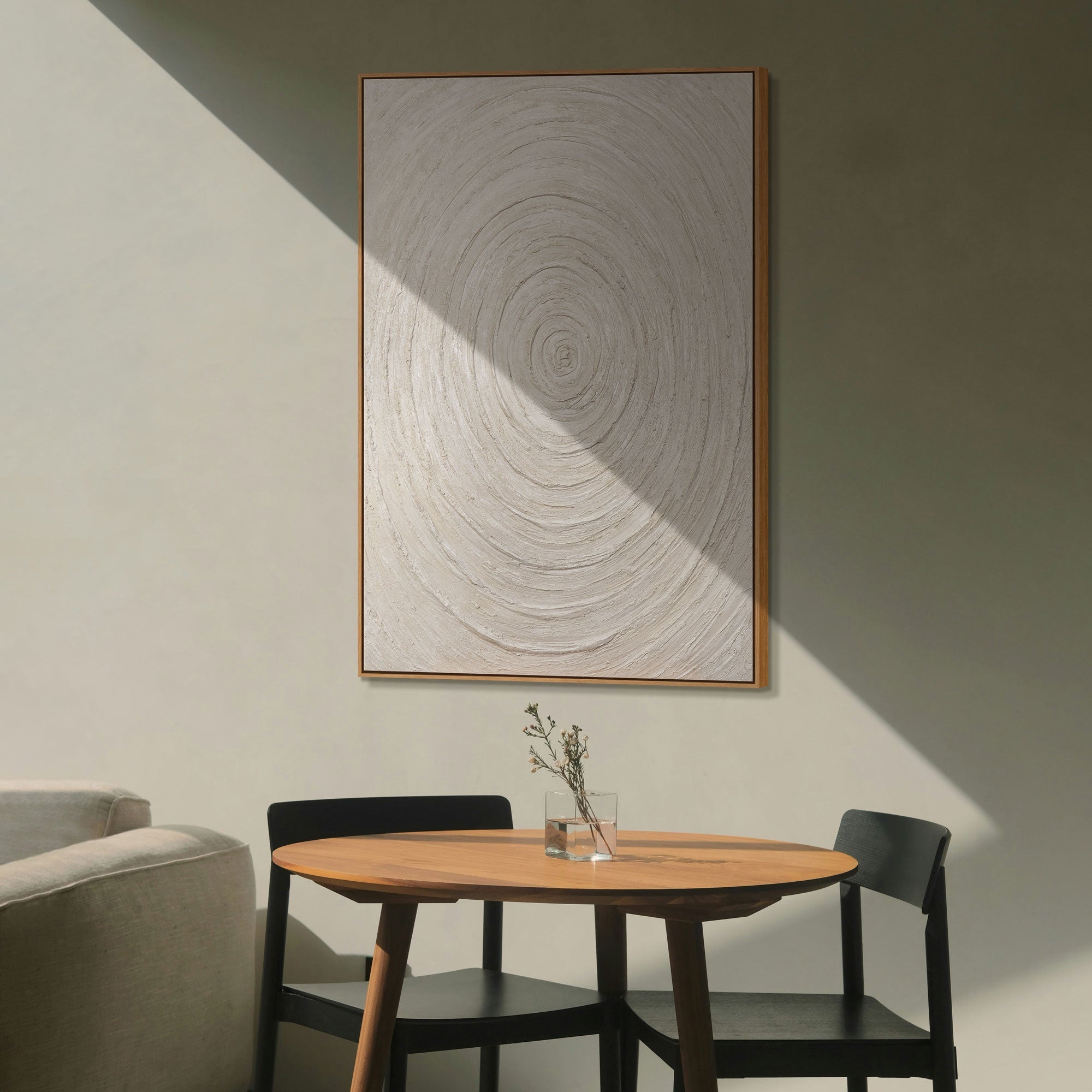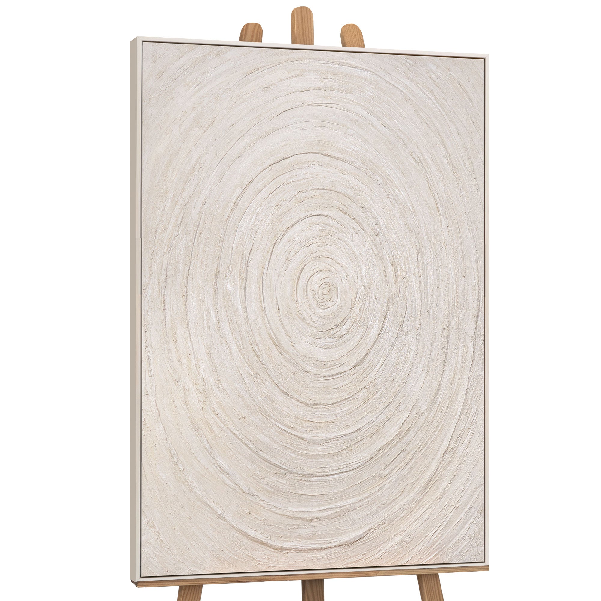 Tuo harmoniaa ja rauhaa kotiisi tällä käsintehdyllä abstrakti taulu -teoksella. Konsentriset ympyrät pehmeissä beigen ja luonnonsävyissä muistuttavat aaltoja tai vuosirenkaita ja antavat taideteokselle erityistä syvyyttä ja symboliikkaa.