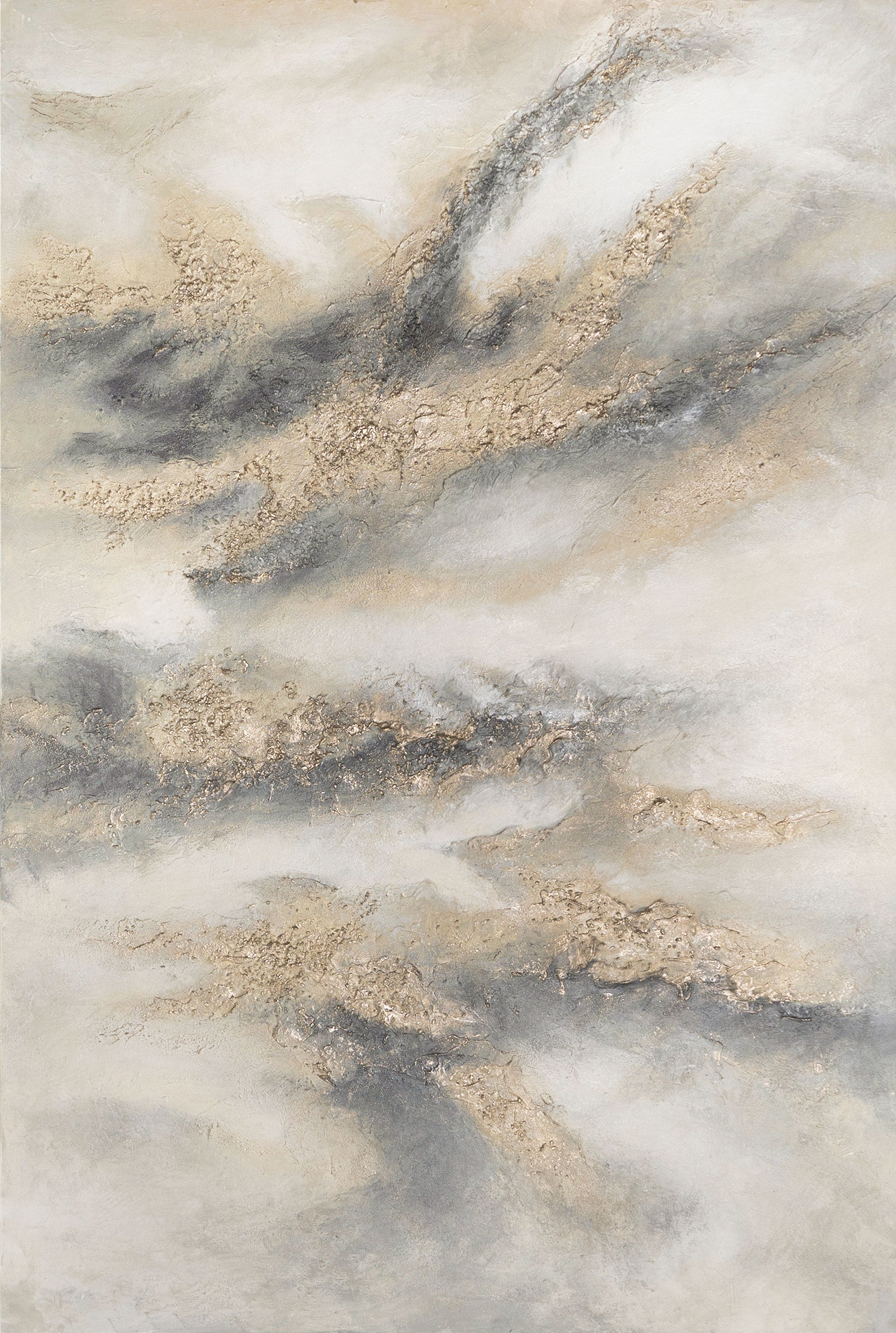 Tuo rauhaa ja eleganssia kotiisi tällä käsinmaalatulla canvas taulu -teoksella. Pehmeät pilvenmuodot harmaassa, beigen ja valkoisen sävyissä sulautuvat harmonisesti kultaisiin yksityiskohtiin ja antavat maalaukselle jalon, lähes leijuvan keveyden. Jokainen siveltimenvedos ja reliefimäinen rakenne tekee tästä työstä ainutlaatuisen taide-esineen.