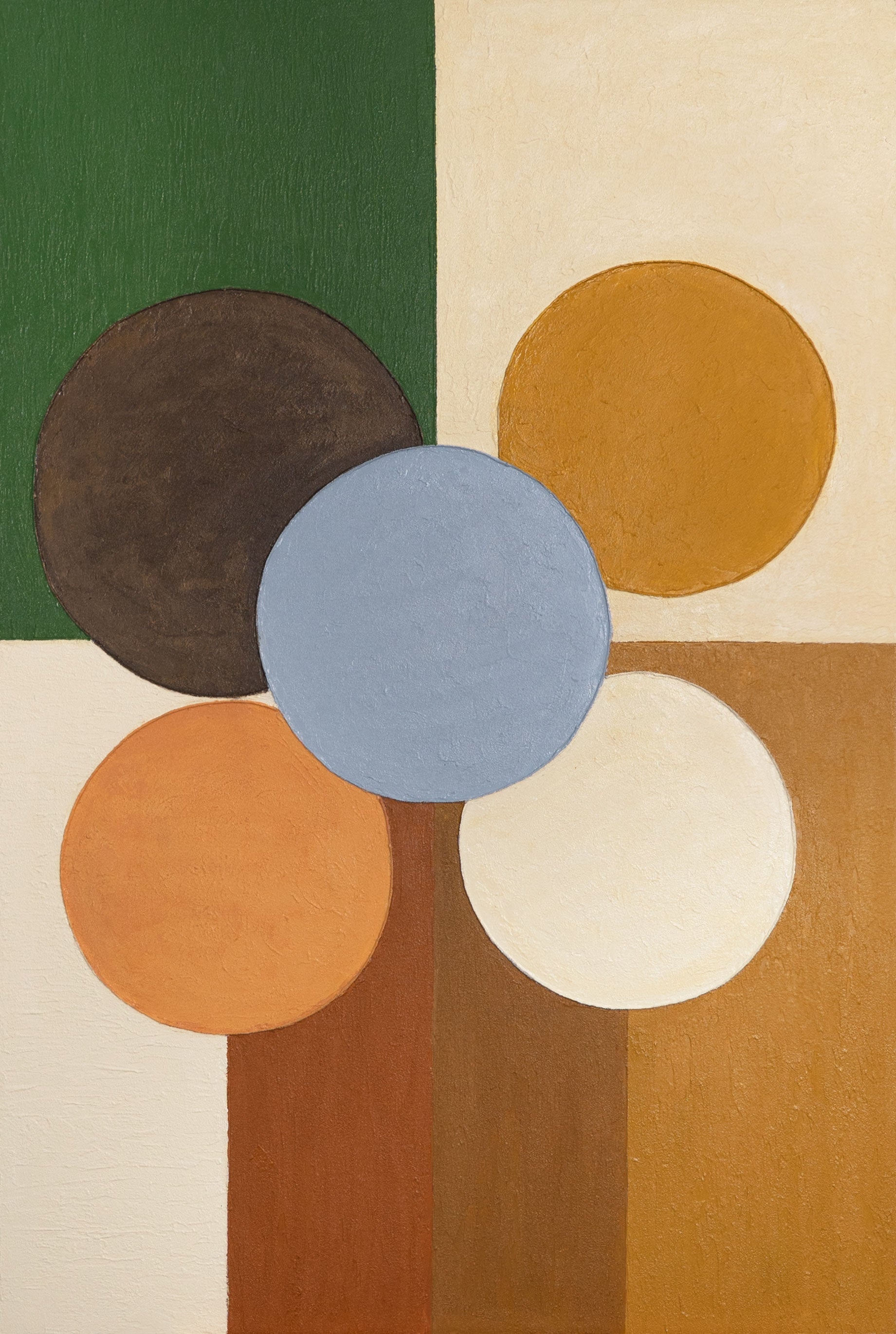 „Tasapainon sfääri“ on moderni, käsinmaalattu akryylimaalaus kankaalle, joka kiehtoo selkeillä geometrisilla muodoillaan ja harmonisilla väripinnoillaan. Maanläheiset ruskean ja beigen sävyt yhdistyvät pehmeään vihreään, hehkuvaan oranssiin ja viileään siniseen luoden kokonaisuuden, joka huokuu rauhaa ja tasapainoa. Rakenteellinen pinta antaa teokselle syvyyttä ja ainutlaatuisen kosketeltavan elämyksen.