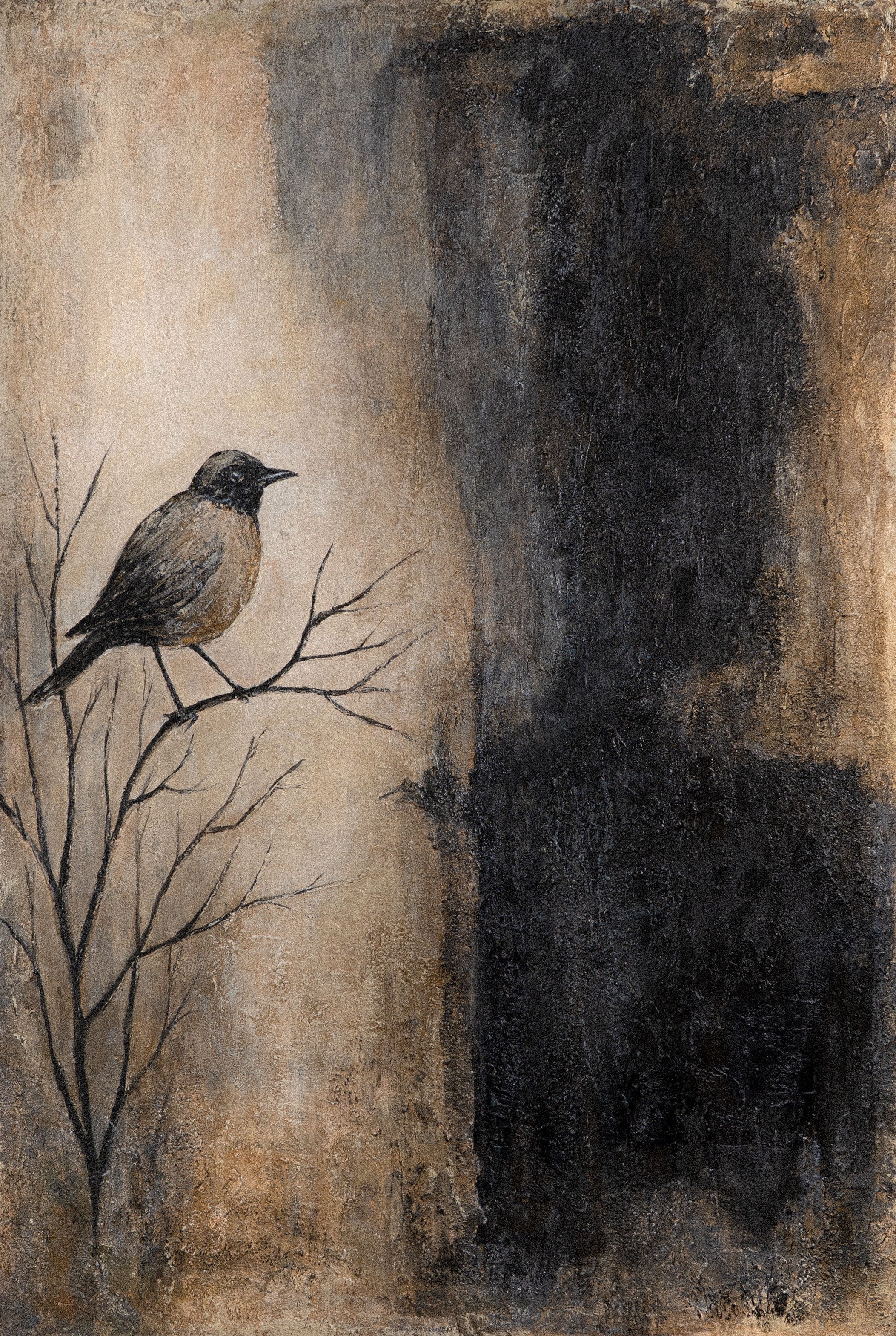 „Oksa ja varjo“ on käsinmaalattu akryylimaalaus, joka hurmaa vahvalla luontoaiheellaan. Yksinäinen lintu istuu paljailla oksilla, upotettuna kontrastiseen sommitelmaan lämpimiä beigen sävyjä, maanläheisiä ruskeita ja syvää mustaa. Rakenteinen pinta antaa teokselle syvyyttä ja elävää tuntua, joka vangitsee katseen.
