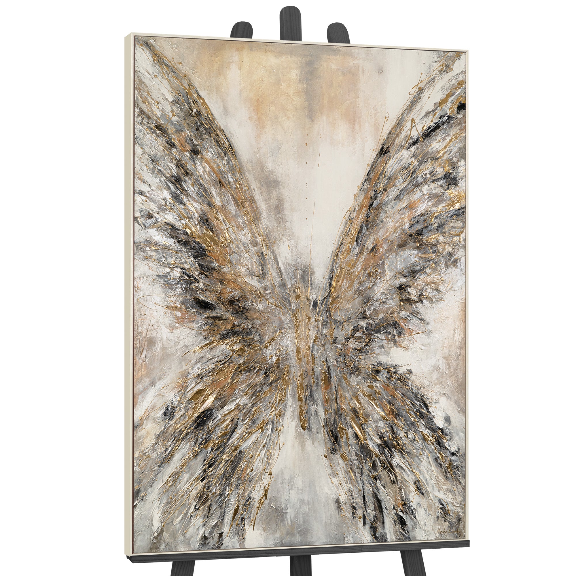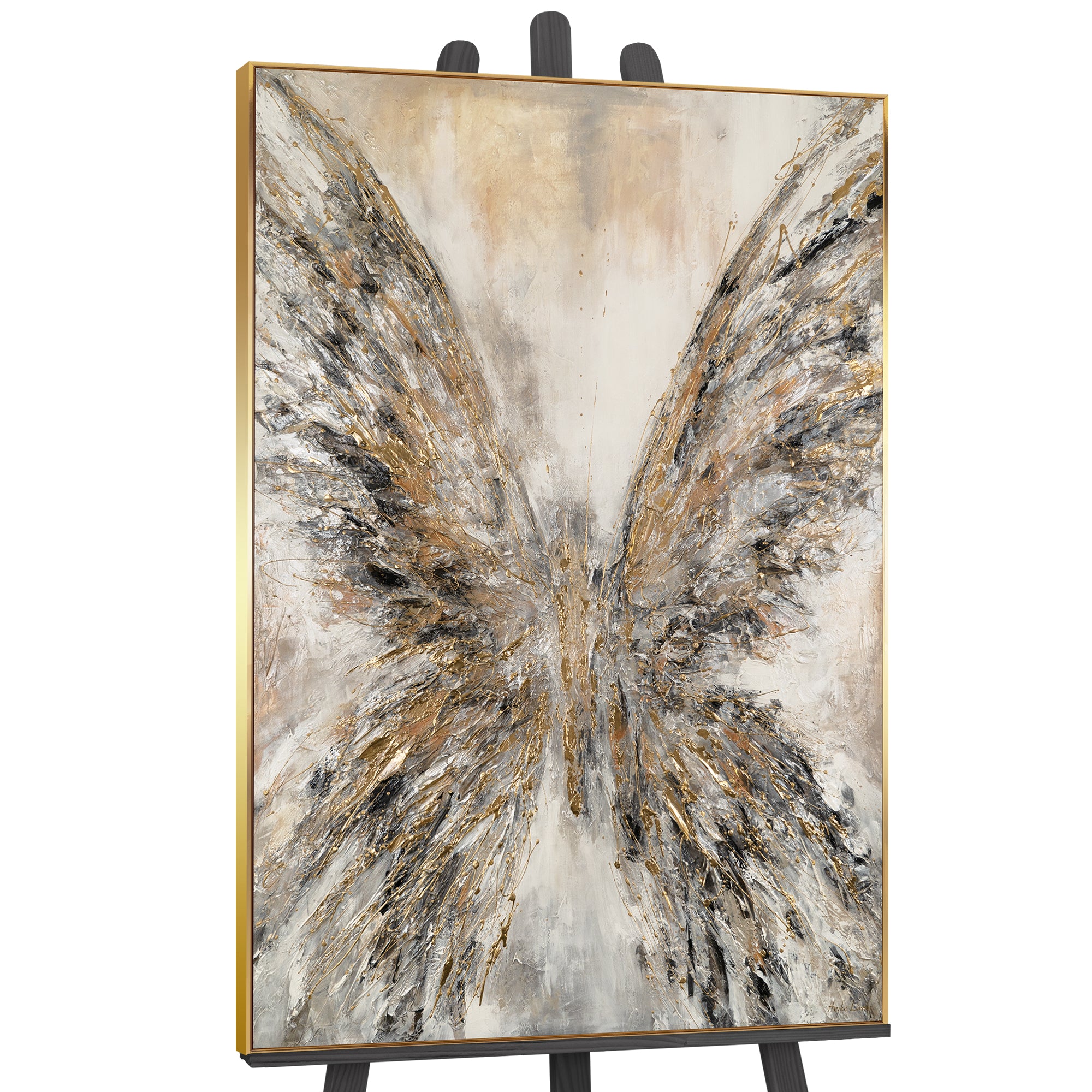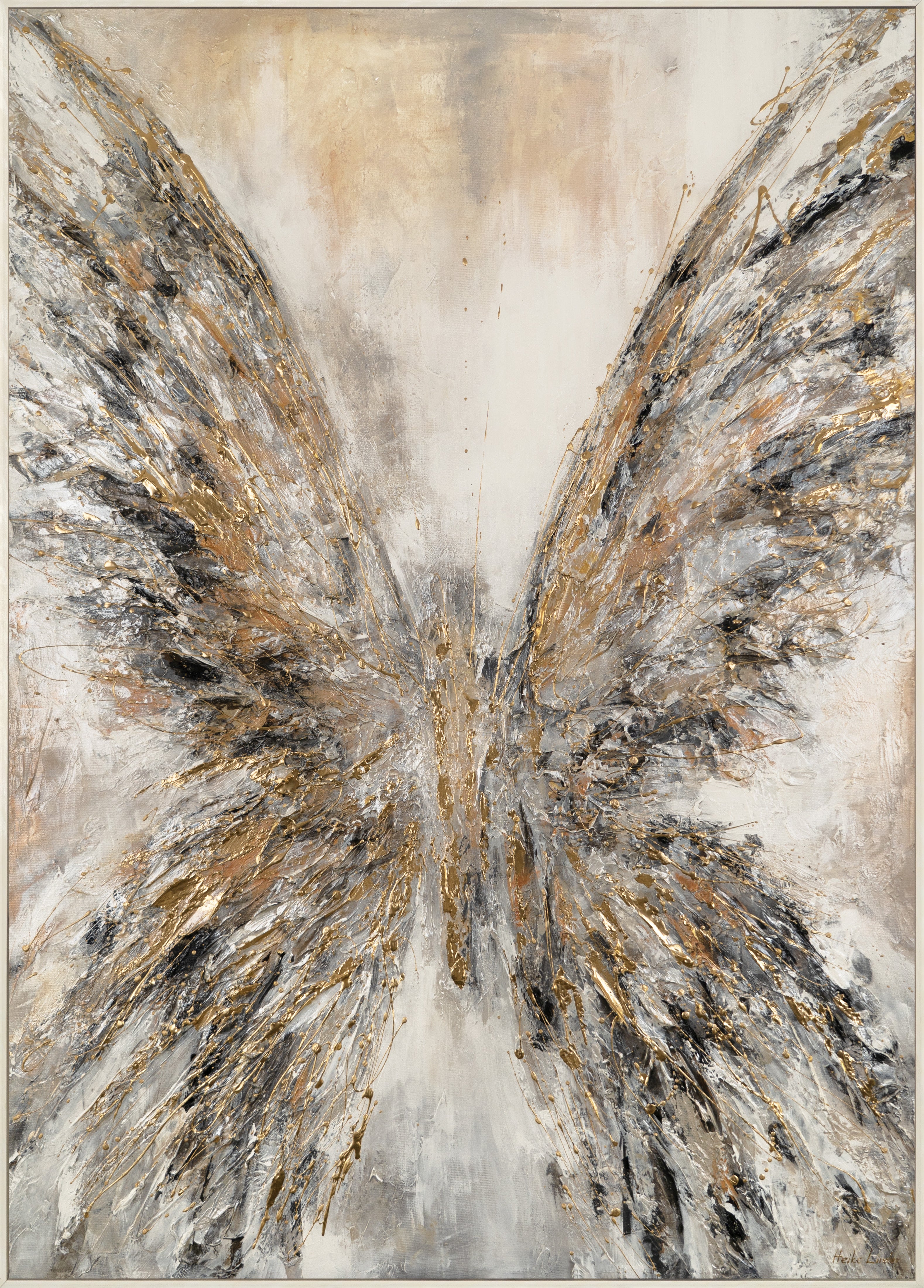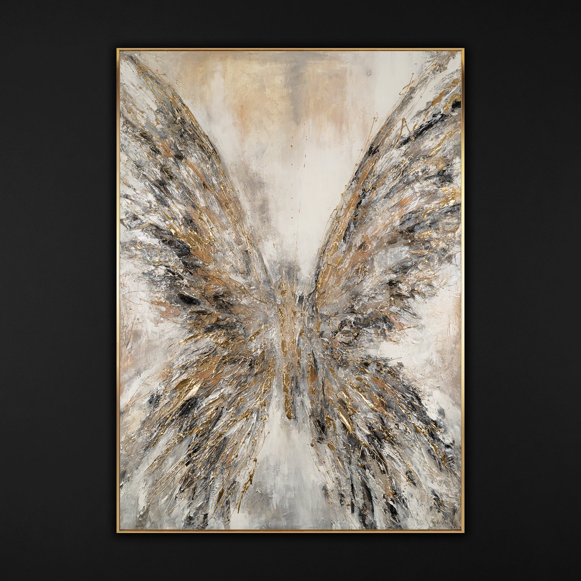 Anna tilallesi ainutlaatuista eleganssia tämän vaikuttavan käsinmaalatun taideteoksen avulla! Abstrakti esitys perhosen siivestä jaloin kultakorostuksin luo kiehtovan syvyysvaikutelman. Luksus-yhdistelmä mustaa, valkoista ja kultaa antaa maalaukselle hienostuneen loisteen, joka tekee vaikutuksen jokaisessa modernissa sisustuksessa.