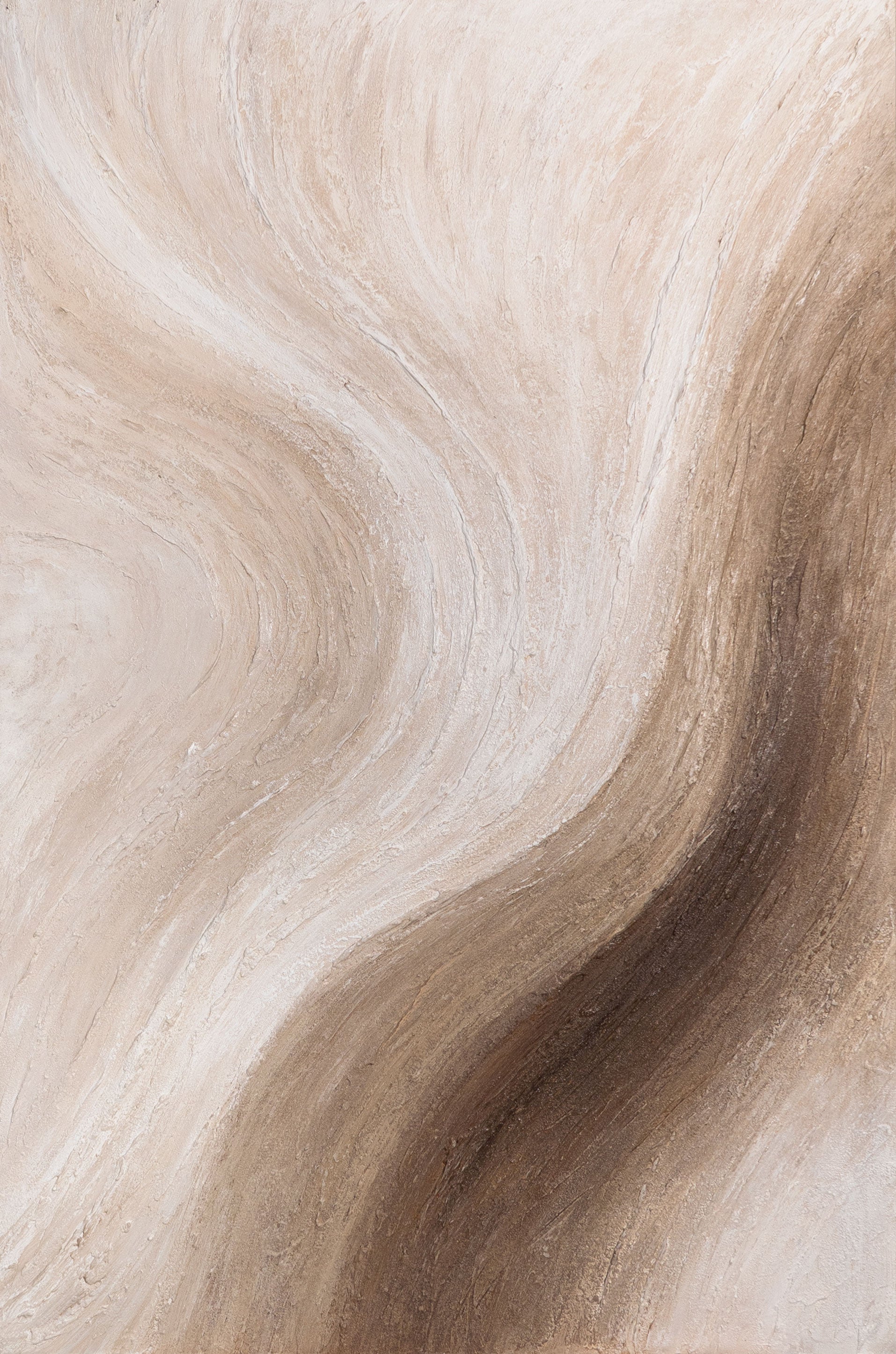 „Aavikon kuiskaus“ on käsinmaalattu akryylimaalaus, joka hurmaa pehmeillä, virtaavilla linjoillaan ja rauhoittavalla väripaletillaan beige- ja ruskeasävyissä. Rakenteinen pinta luo syvyyttä ja luonnollisuutta, kun taas orgaaniset liikkeet säteilevät meditatiivista rauhaa. Jokainen sävy muistuttaa aavikon hiekasta, joka aaltoilee harmonisissa kerroksissa.