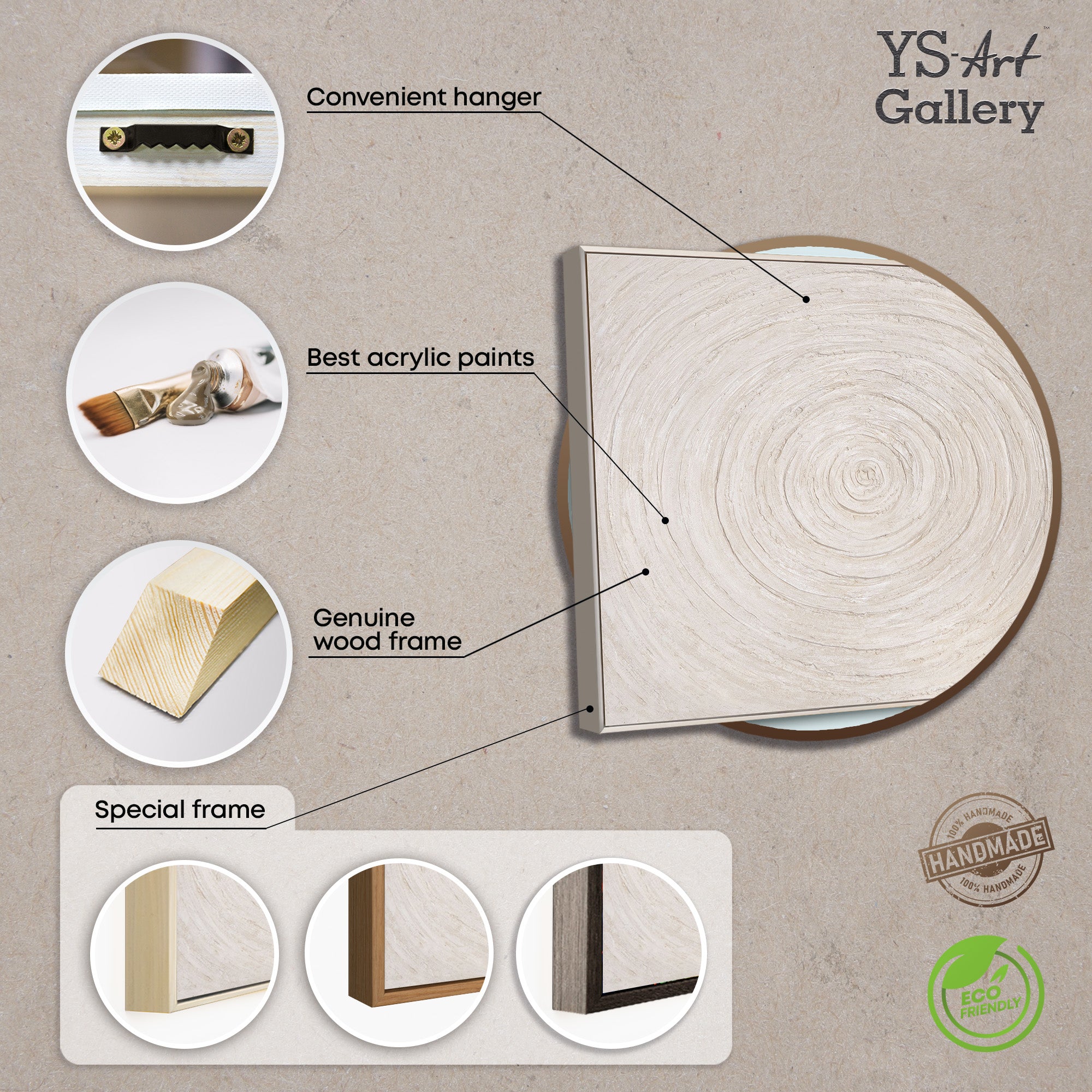 Tämä käsinmaalattu teksturoitu taideteos sulautuu harmonisesti moderneihin, minimalistisiin ja skandinaavisiin sisustuksiin. Sen rauhallinen väripaletti ja pyöreä sommittelu tekevät siitä luonnollisen ja rauhoittavan keskipisteen olohuoneissa, makuuhuoneissa, käytävillä tai toimistoissa. Korkealaatuinen käsityötaito ja hillitty eleganssi tekevät tästä maalauksesta ihanteellisen elementin hienostuneeseen sisustussuunnitteluun.