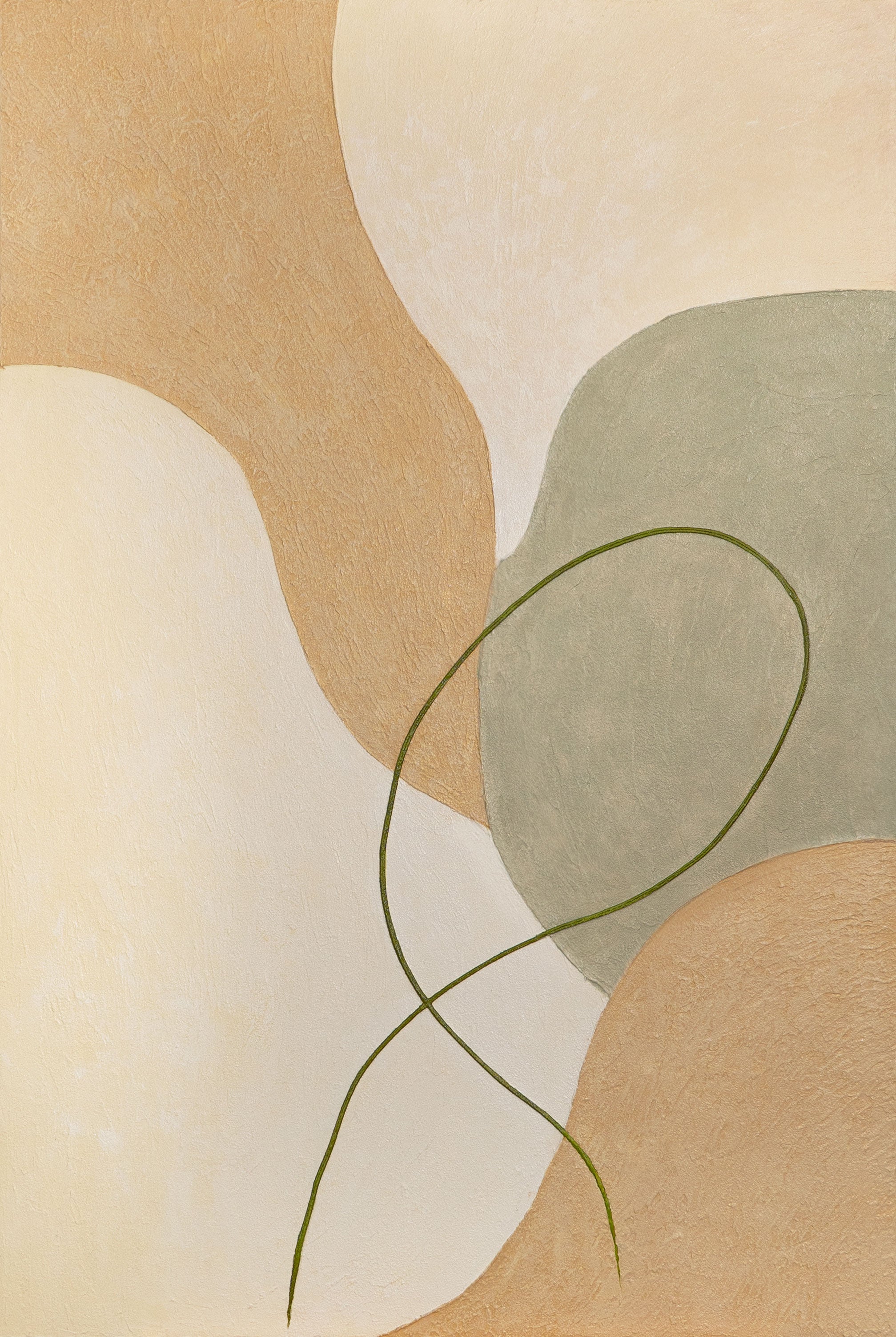 „Punoutuminen“ on käsinmaalattu akryylimaalaus, joka hurmaa pehmeillä linjoillaan ja harmonisella värikokonaisuudellaan. Hienovaraiset beigen ja kerman sävyt yhdistyvät lempeään vihreään kaareen, luoden rauhallisen ja orgaanisen liikkeen, joka on yhtä aikaa elegantti ja moderni.
