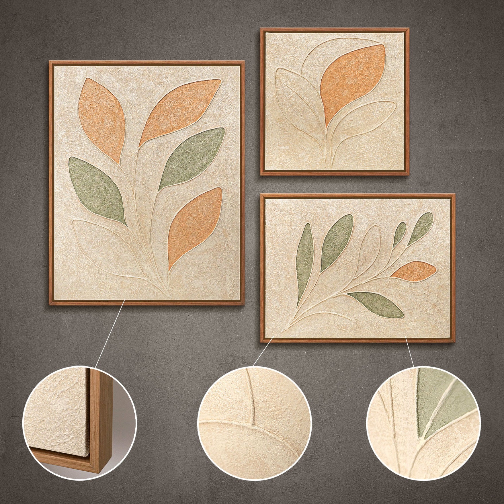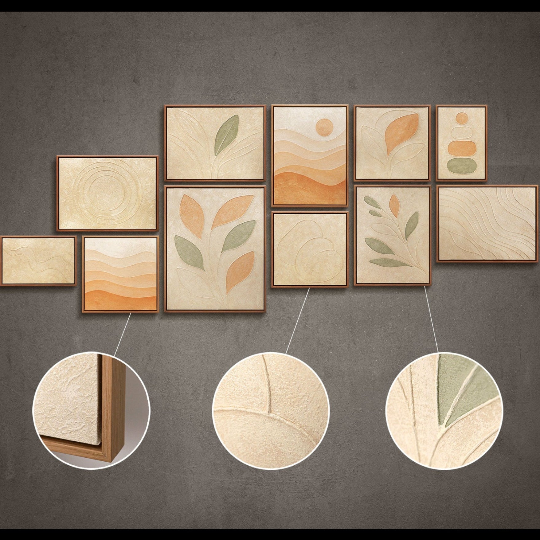 Hauchen Sie Ihrem Zuhause Leben und Abstraktion ein. Verwandeln Sie Ihre Wände in eine private Galerie mit unserem exklusiven Wandbilder Set aus drei strukturierten Kunstwerken. Jedes Werk ist ein 100%iges Unikat aus unserem Atelier YS-Art. Diese Kollektion verbindet moderne, minimalistische Ästhetik mit der Tiefe organischer Formen.