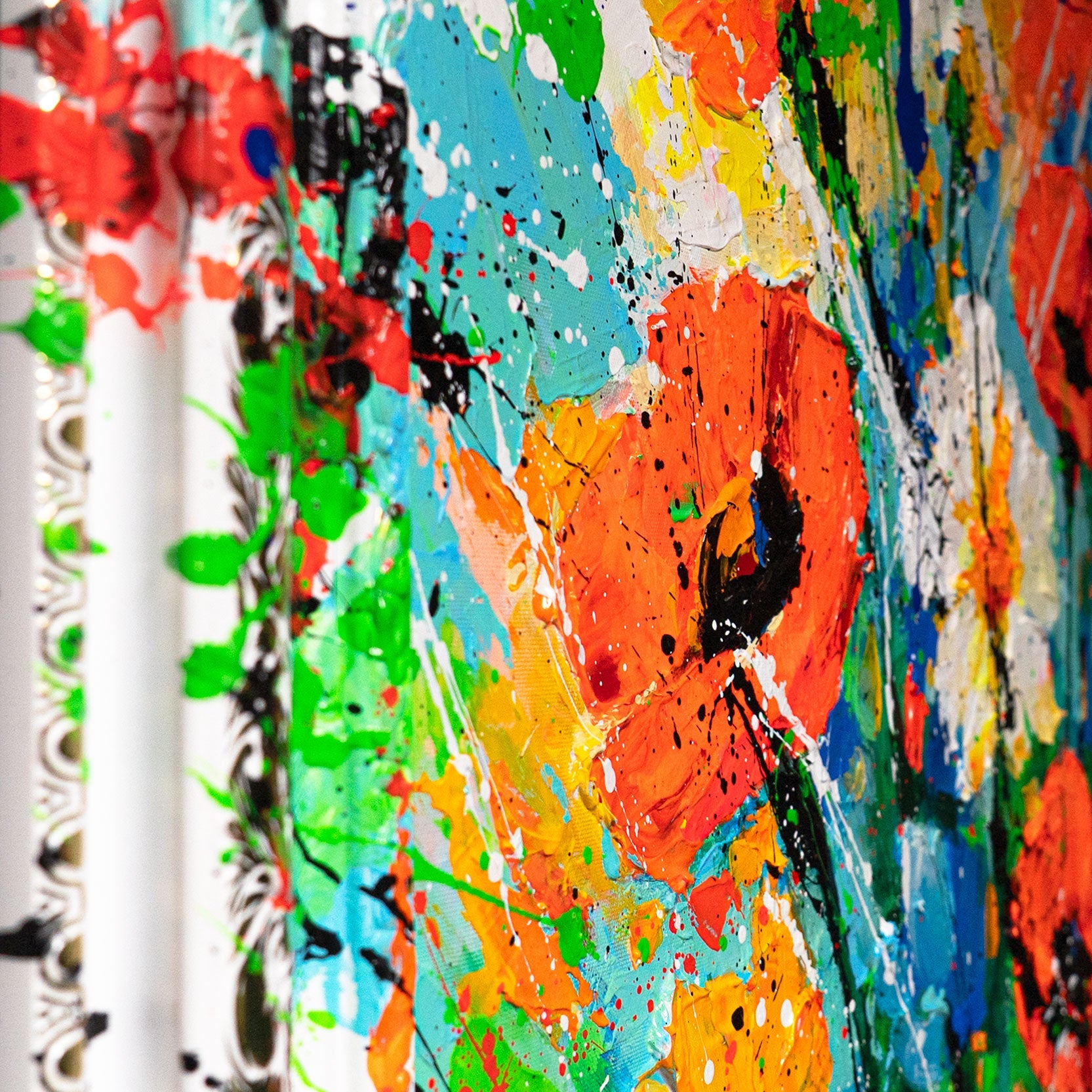 „Wärme der Blütenblätter“ zeigt einen explosiven Strauß aus Mohnblumen, Margeriten und Fantasieblüten – gemalt in leuchtendem Rot, Gelb, Orange, Grün und Blau. Die expressiven Farbspuren und Spritzer verleihen dem Werk Energie, Lebendigkeit und Tiefe. Jeder Pinselstrich ist handgemalt und bringt die Intensität der Natur auf die Leinwand.