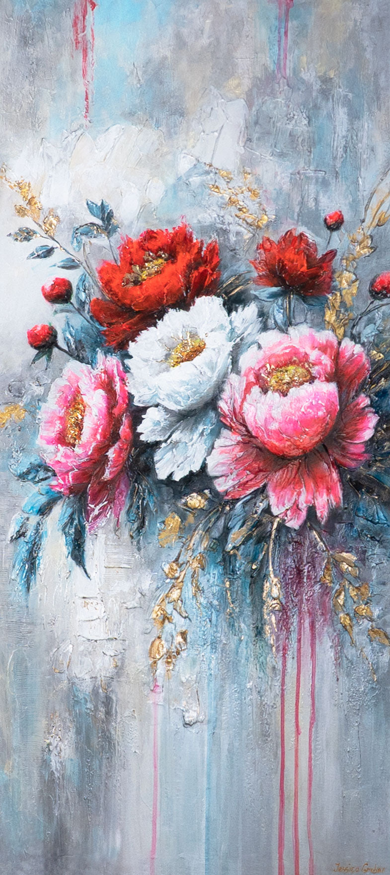 Akryylimaalaus „Kukkivat pionit“ ihastuttaa harmonisella värien intensiteetin, kukallisen eleganssin ja rakenteikkaan maalaustavan yhdistelmällä. Vahvat pionit punaisen, valkoisen ja vaaleanpunaisen sävyissä, yhdistettynä kultakorostuksiin ja viileään taustaan, näyttävät eläviltä ja samalla rauhoittavilta.