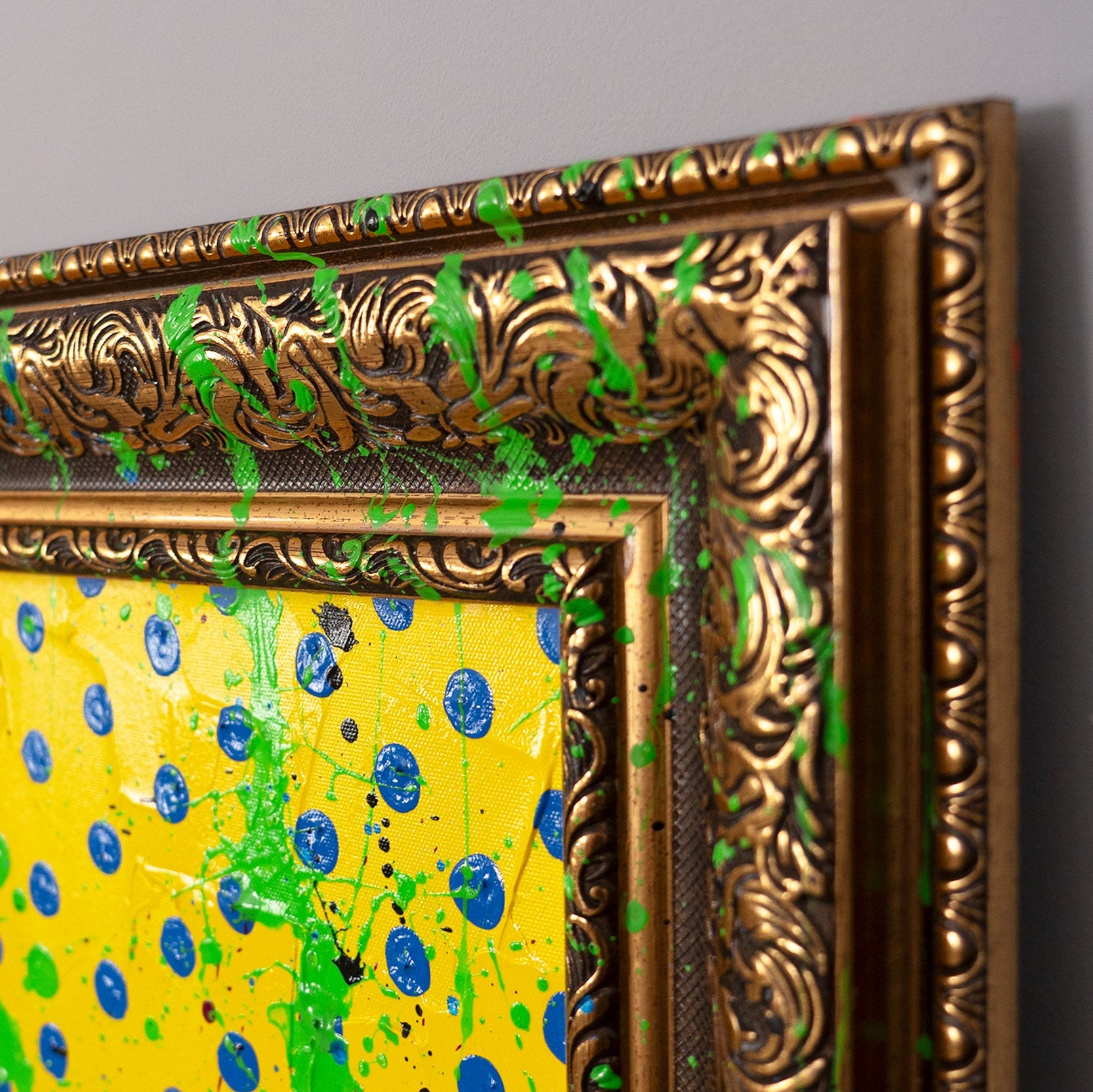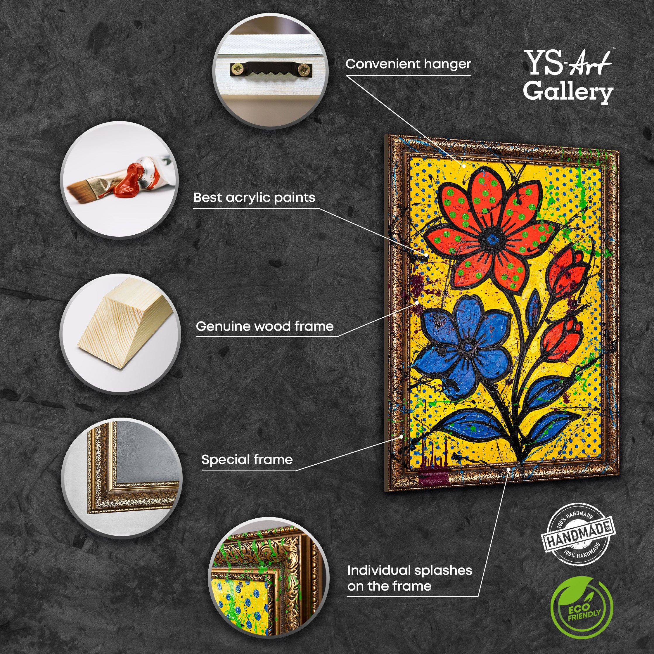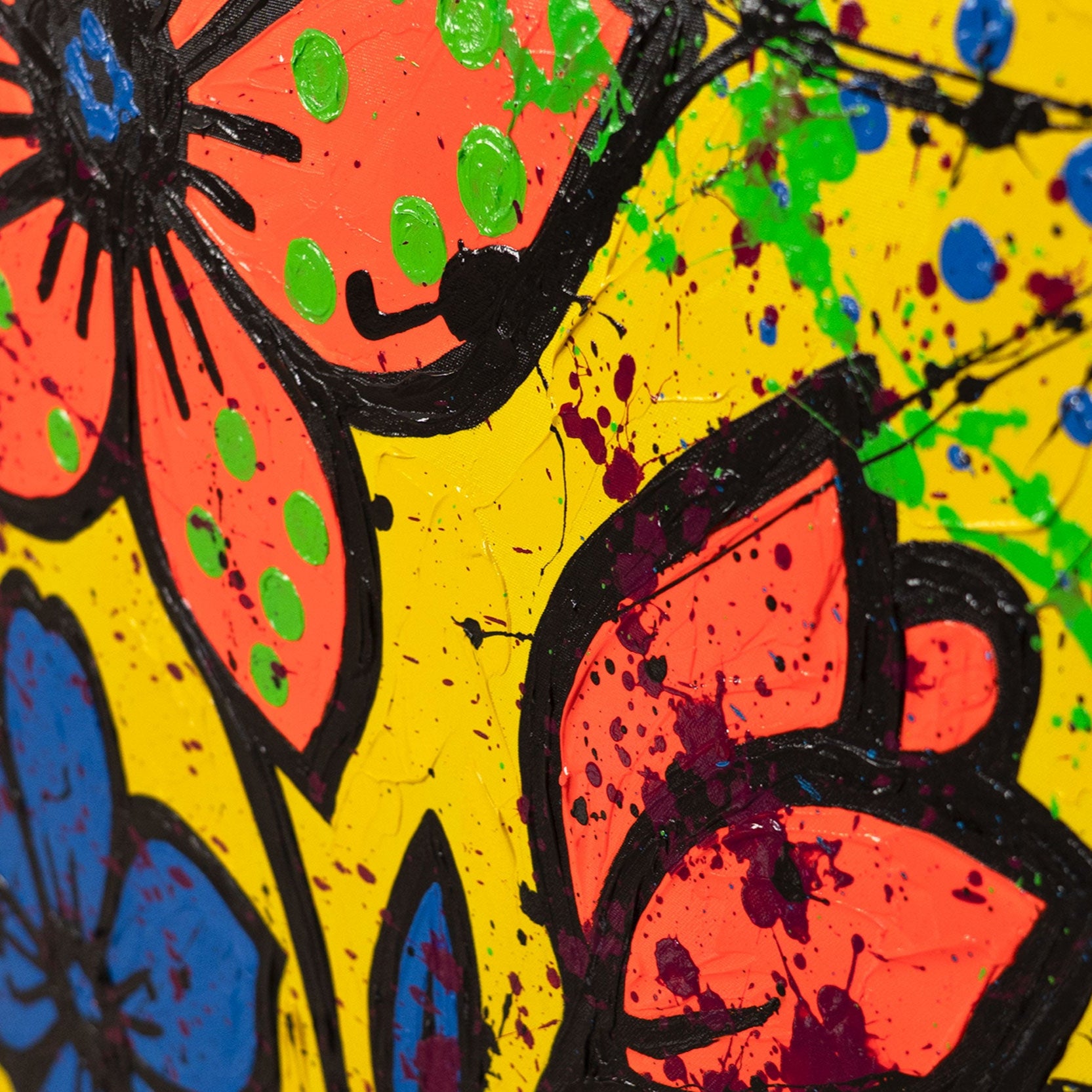 „Blütenrausch“ ist ein farbintensives Pop-Art Blumenbild, das Energie und Lebensfreude ausstrahlt. Der leuchtend gelbe Hintergrund, die roten und blauen Blüten mit grünen Akzenten und die dynamischen Farbspritzer machen dieses Werk zu einem expressiven Statement moderner Kunst. Jedes Detail ist handgemalt und einzigartig.
