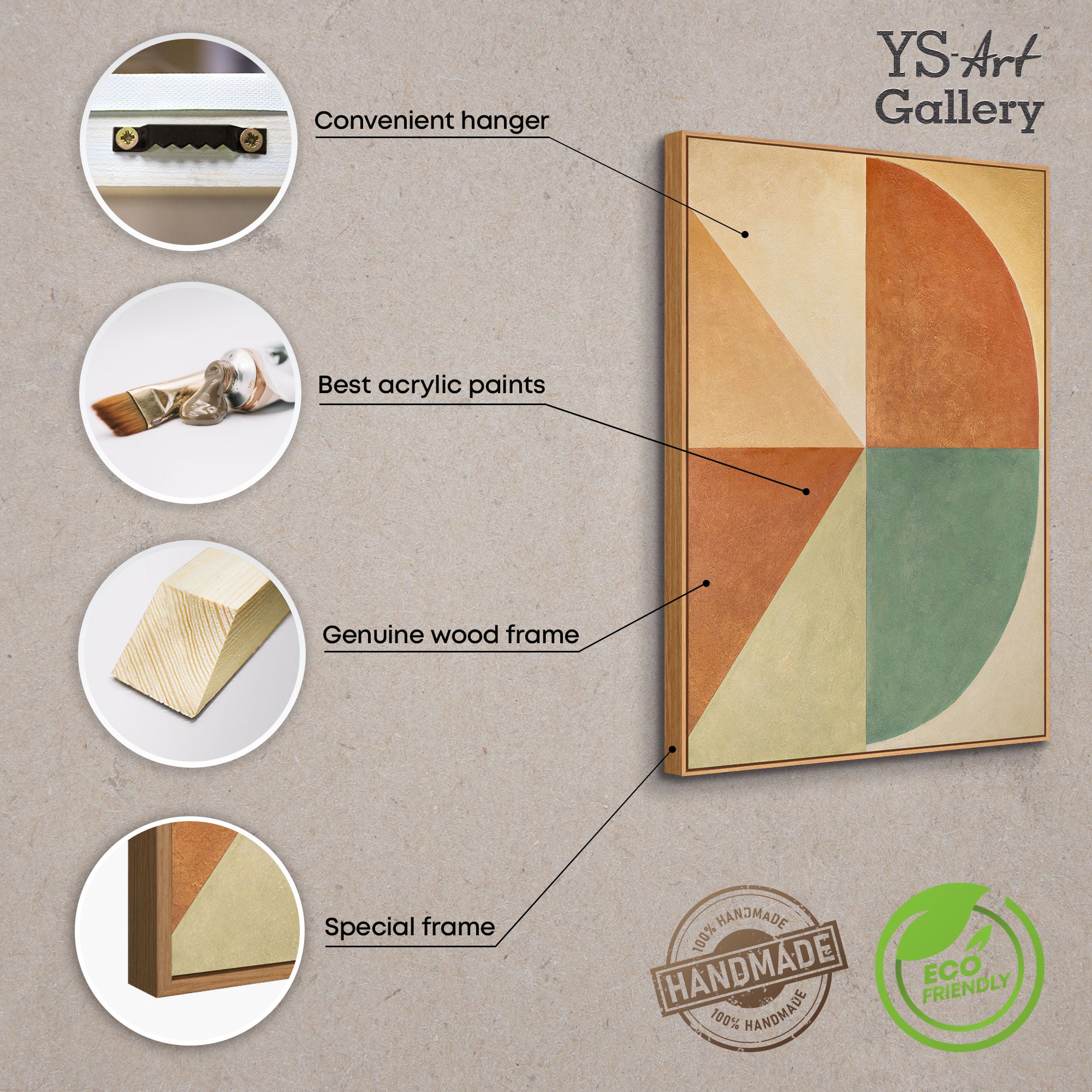 „Muotojen tasapaino“ on käsinmaalattu akryylimaalaus, joka ihastuttaa geometrisilla pinnoillaan ja harmonisella värijaollaan. Lämpimät oranssin ja beigen sävyt kohtaavat viileän vihreän ja pehmeän kerman, muodostaen tasapainoisen kokonaisuuden, joka huokuu rauhaa ja harmoniaa. Rakenteellinen pinta antaa teokselle syvyyttä ja korostaa taiteellista käsityötä.