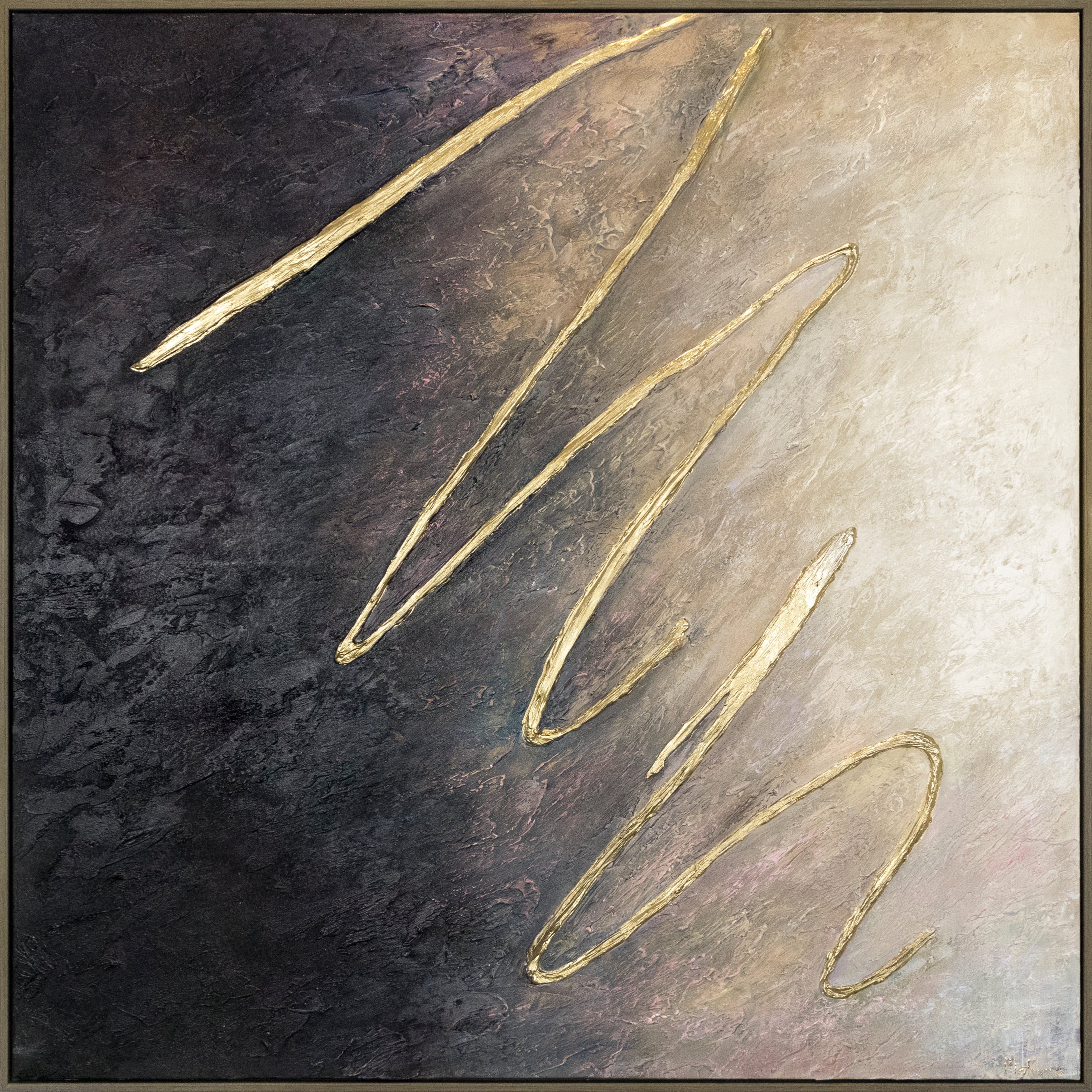 „Tähtiensä Välissä“ on vaikuttava, käsinmaalattu akryylimaalaus, joka erottuu dynaamisen komposition ja kultaisen korostuksen ansiosta. Hienovaraisessa liu’ussa tummasta mustaa harmaaseen ja kirkkaaseen valkoiseen kaarevat kultaiset linjat nousevat kolmiulotteisessa rakennessa voimakkaasti esiin. Korkealaatuinen tekstuuripinta antaa taideteokselle syvyyttä ja liikettä – todellinen katseenvangitsija moderniin interiööriin tyylillä.