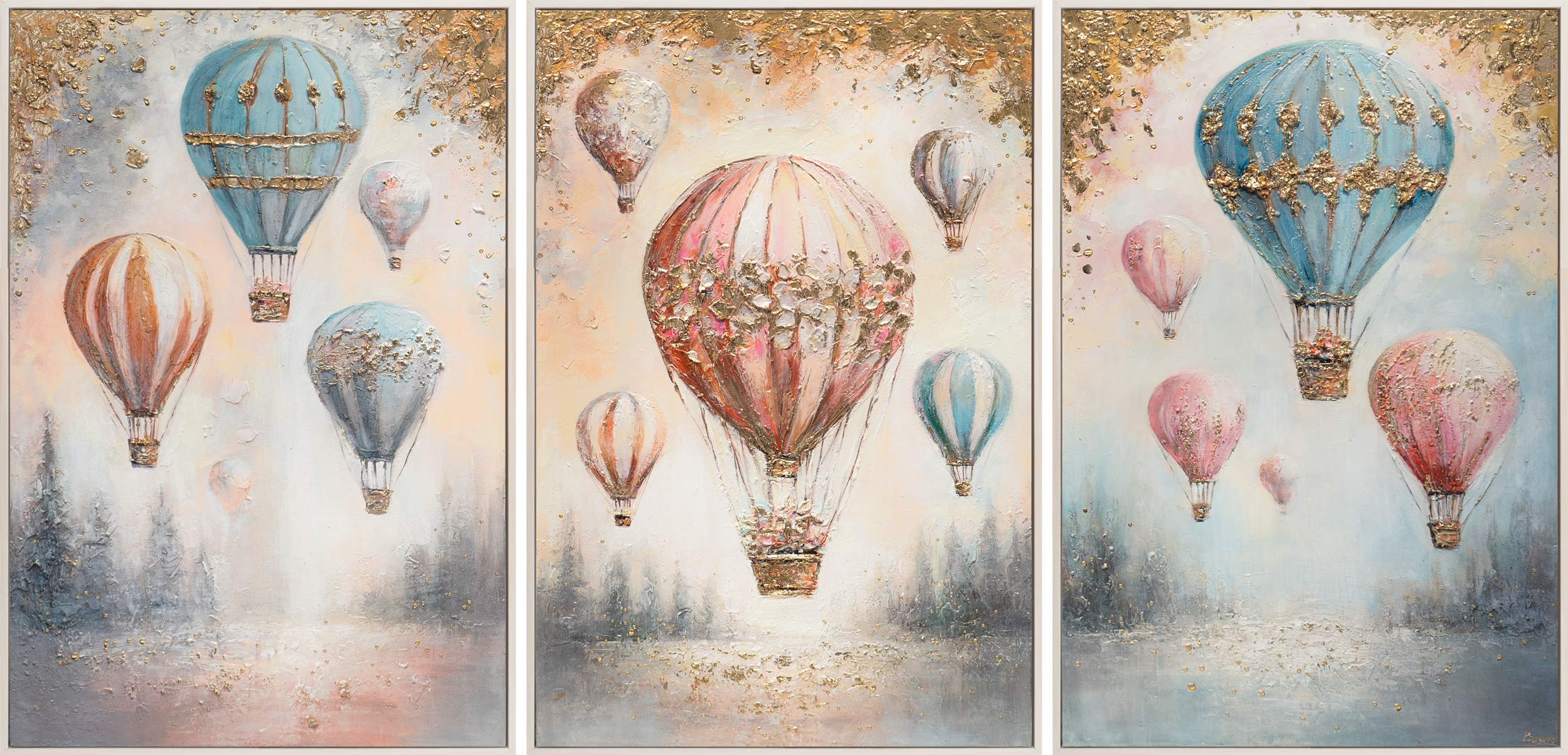 Muuta lastenhuone unenomaiseksi maailmaksi tällä taulut kotiin -seinäsomisteella. Tämä triptyykki esittää kauniita kuumailmapalloja pehmeissä pastelliväreissä, leijumassa unenomaisen metsän yllä. Täydellinen lastenhuoneen sisustukseen kodikkaan ja inspiroivan tunnelman luomiseksi!