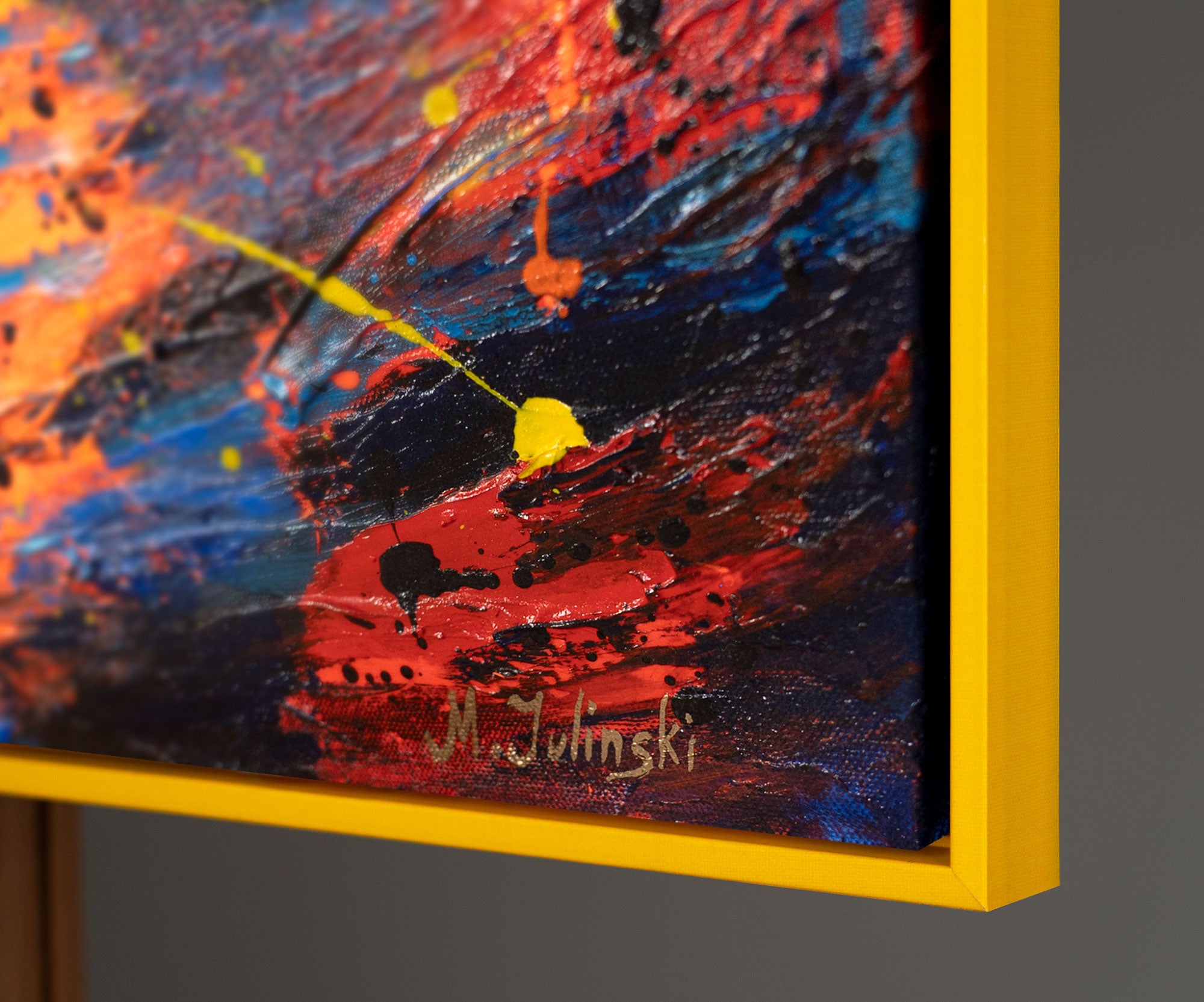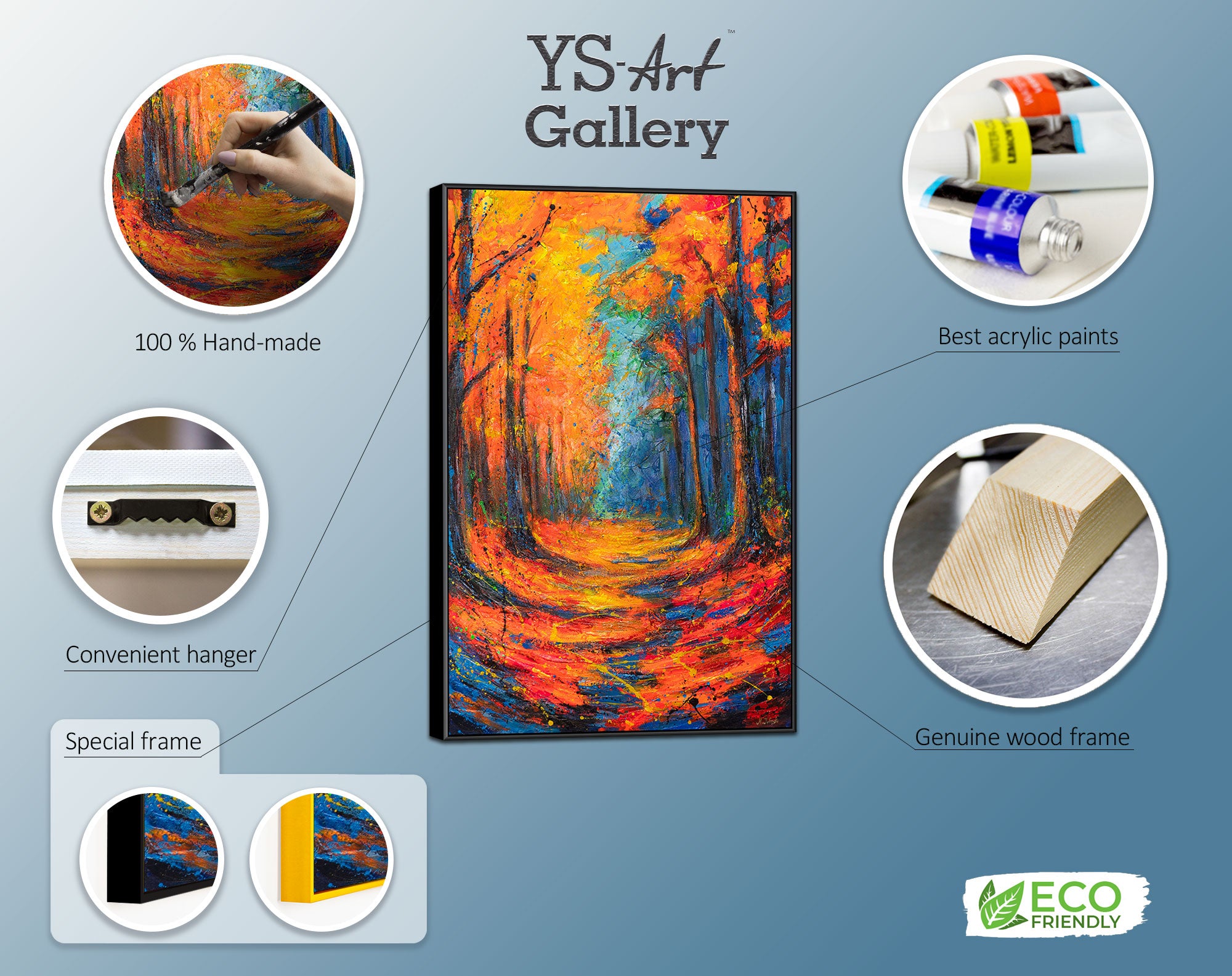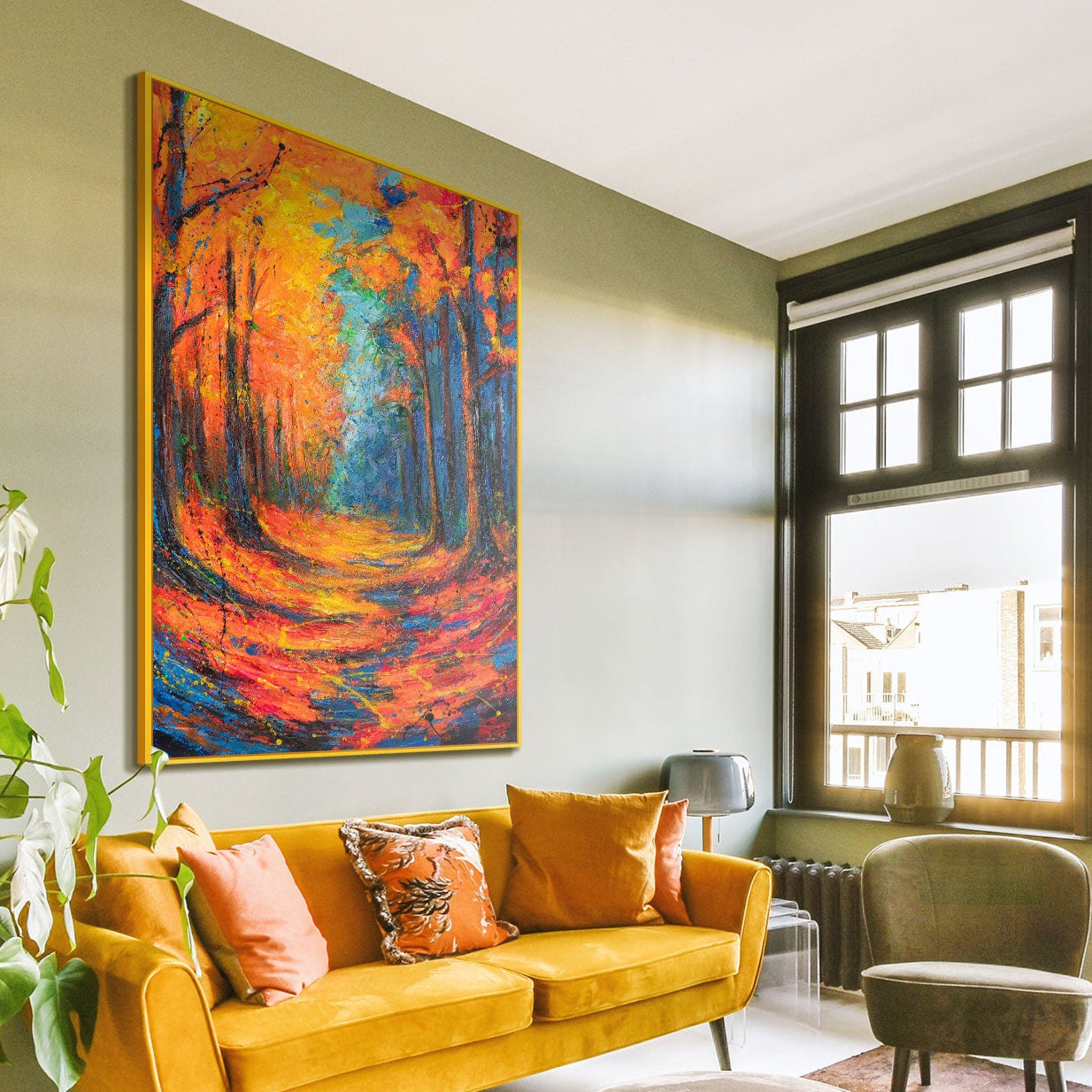 Värikäs taulu, jossa metsäpolku kulkee loistavan oranssin, punaisen ja sinisen meressä. Hohtava lehtikato peittää maan, kun korkeat ja hoikat puut sinisen ja mustan voimakkaissa sävyissä reunustavat polkua. Lämmin valo ja syvä tekstuuri luovat dynaamisen mutta samalla rauhoittavan tunnelman – kuin syksy olisi liekeissä.