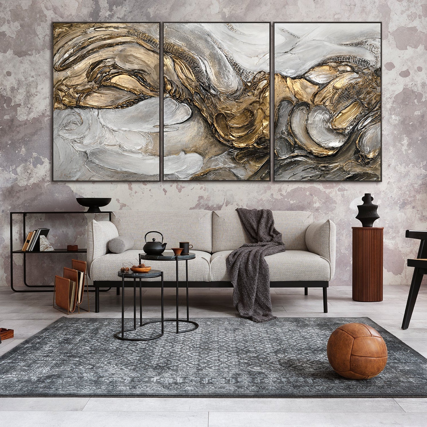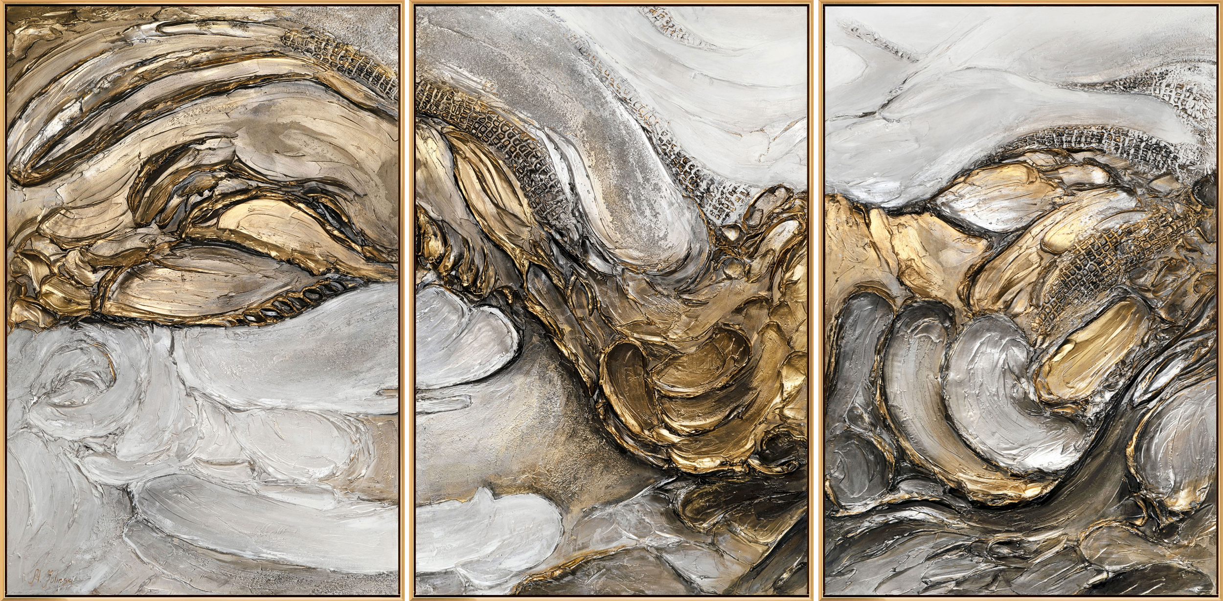 Tämä eksklusiivinen, käsinmaalattu Triptyykki tekee vaikutuksen dynaamisella rakenteellaan sekä jaloilla kulta- ja hopeasävyillä. Kolmiosainen sommitelma luo ilmeikkään taulu kankaalle ja tuo olohuoneeseesi ylellisen ja modernin tunnelman. Huolellisesti muotoiltu pinta antaa taideteokselle syvyyttä ja ainutlaatuisuutta.