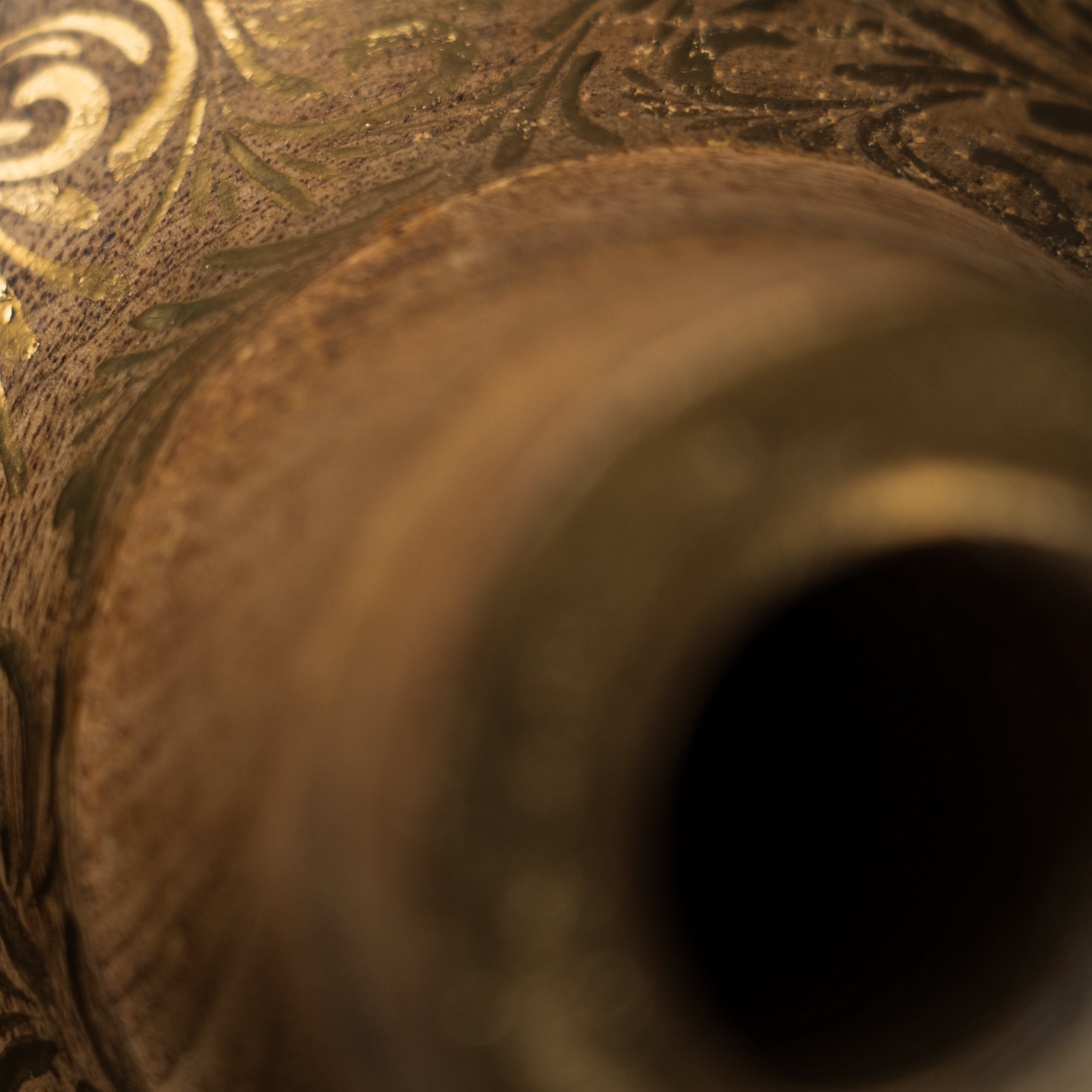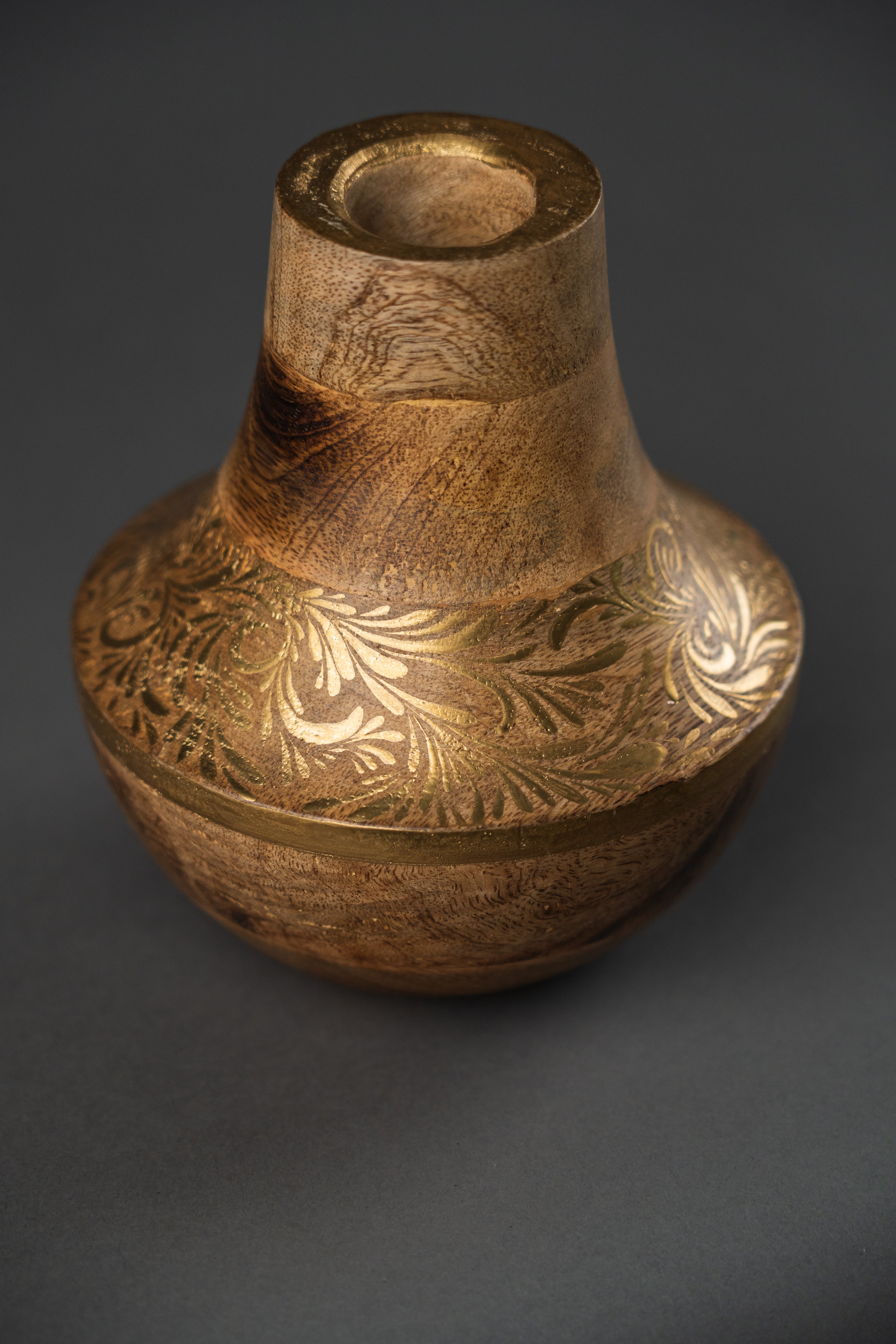 Tuo kotiisi tyyliä ja lämpöä eksklusiivisella puumaljakolla, joka yhdistää laadukkaan käsityön ja elegantin kultakoristelun.