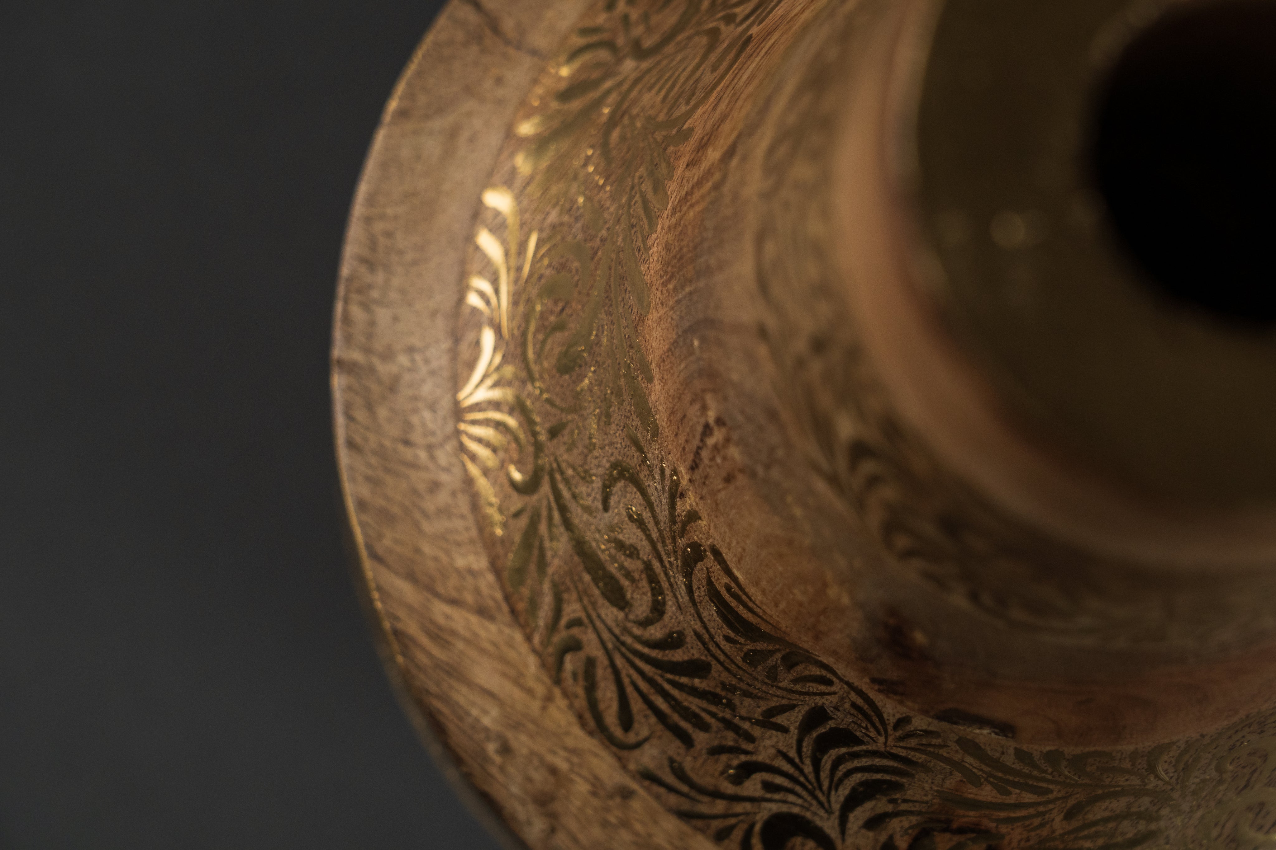 Tämä käsintehty puumaljakko yhdistää massiivipuun luonnollisen lämmön ja hienostuneen kultakoristelun. Jokainen kappale on uniikki, sorvattu ja käsin koristeltu, mikä tekee siitä taiteellisen katseenvangitsijan kodin sisustukseen.