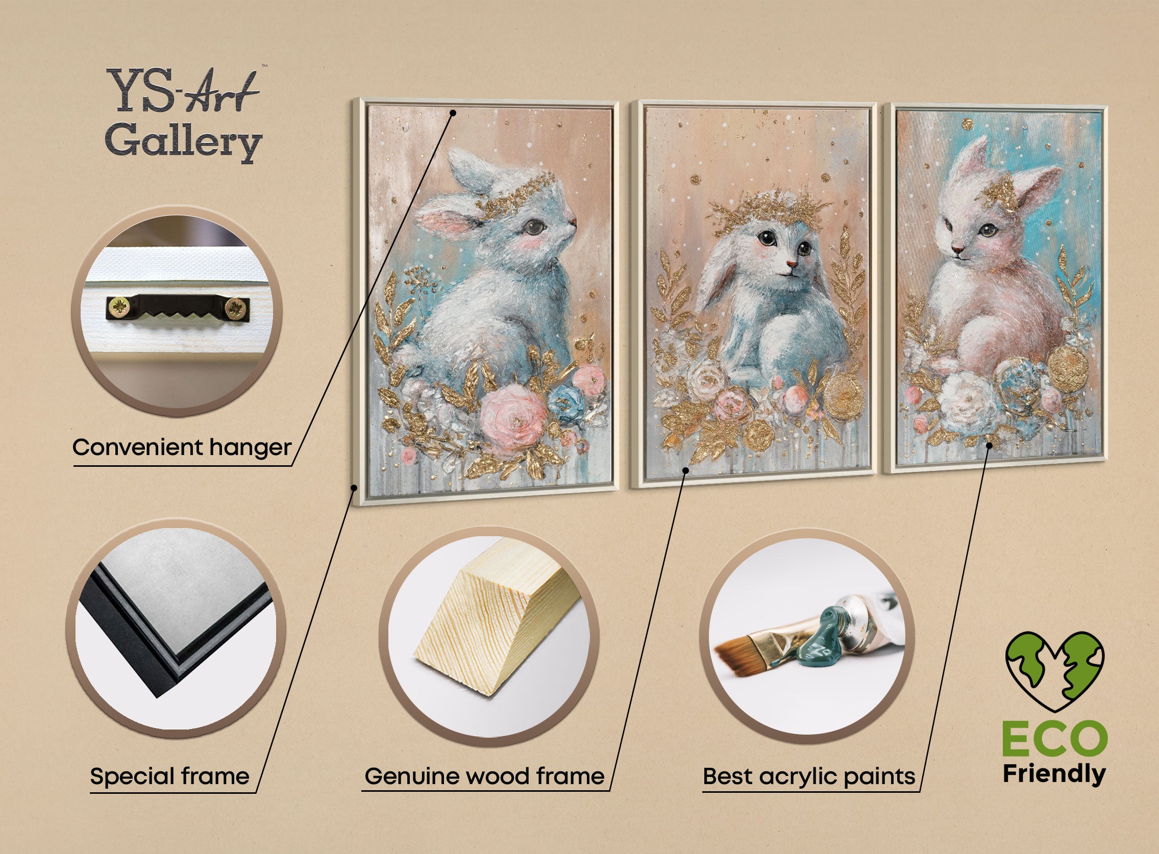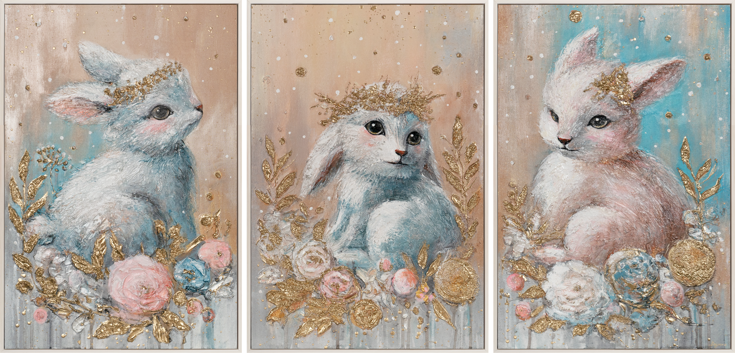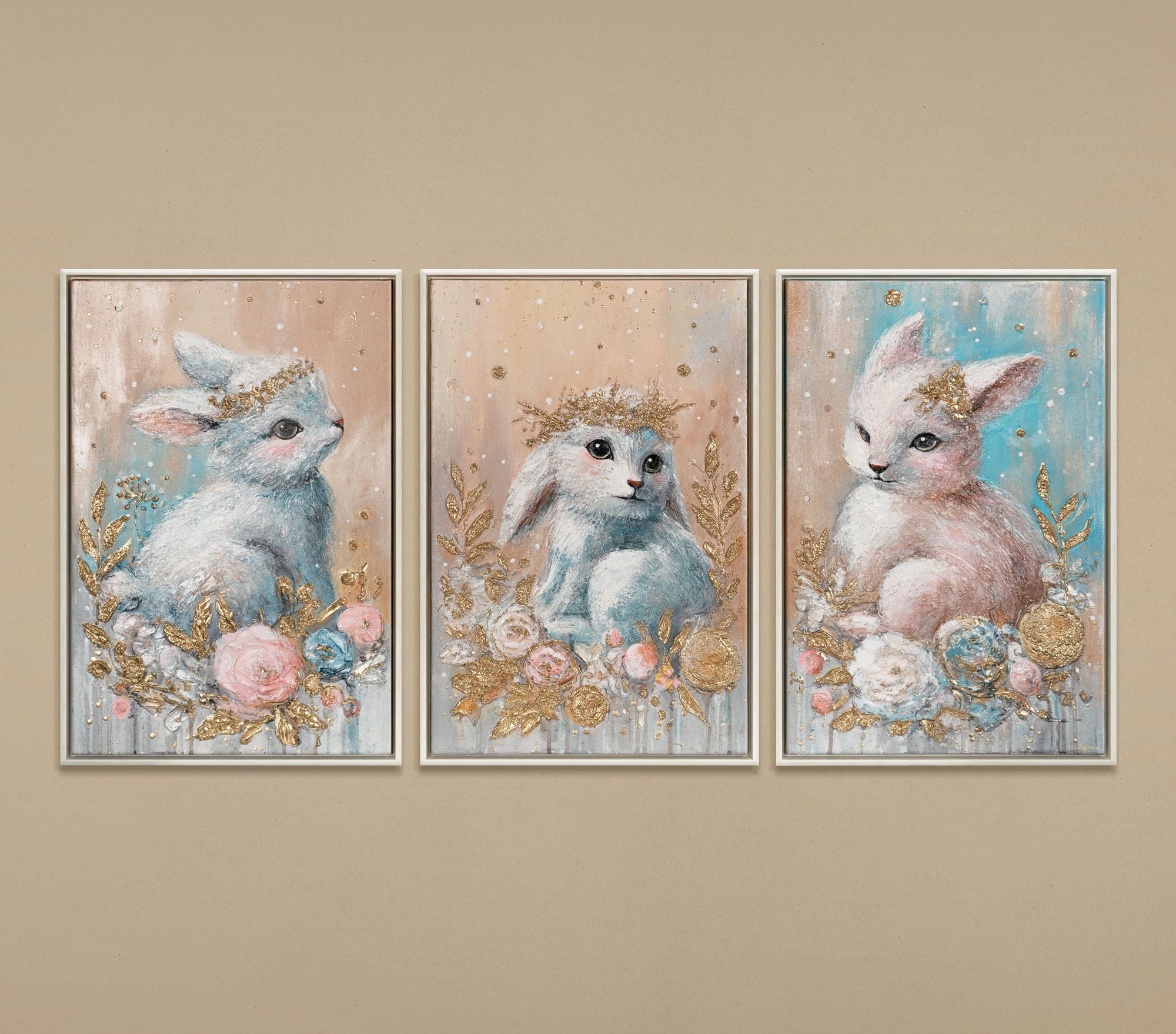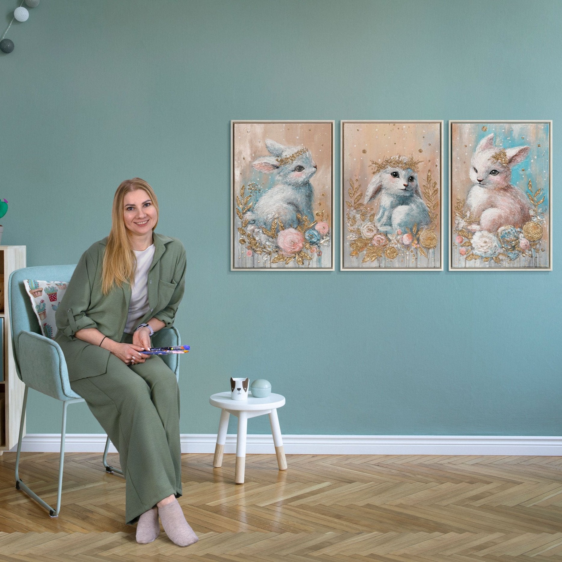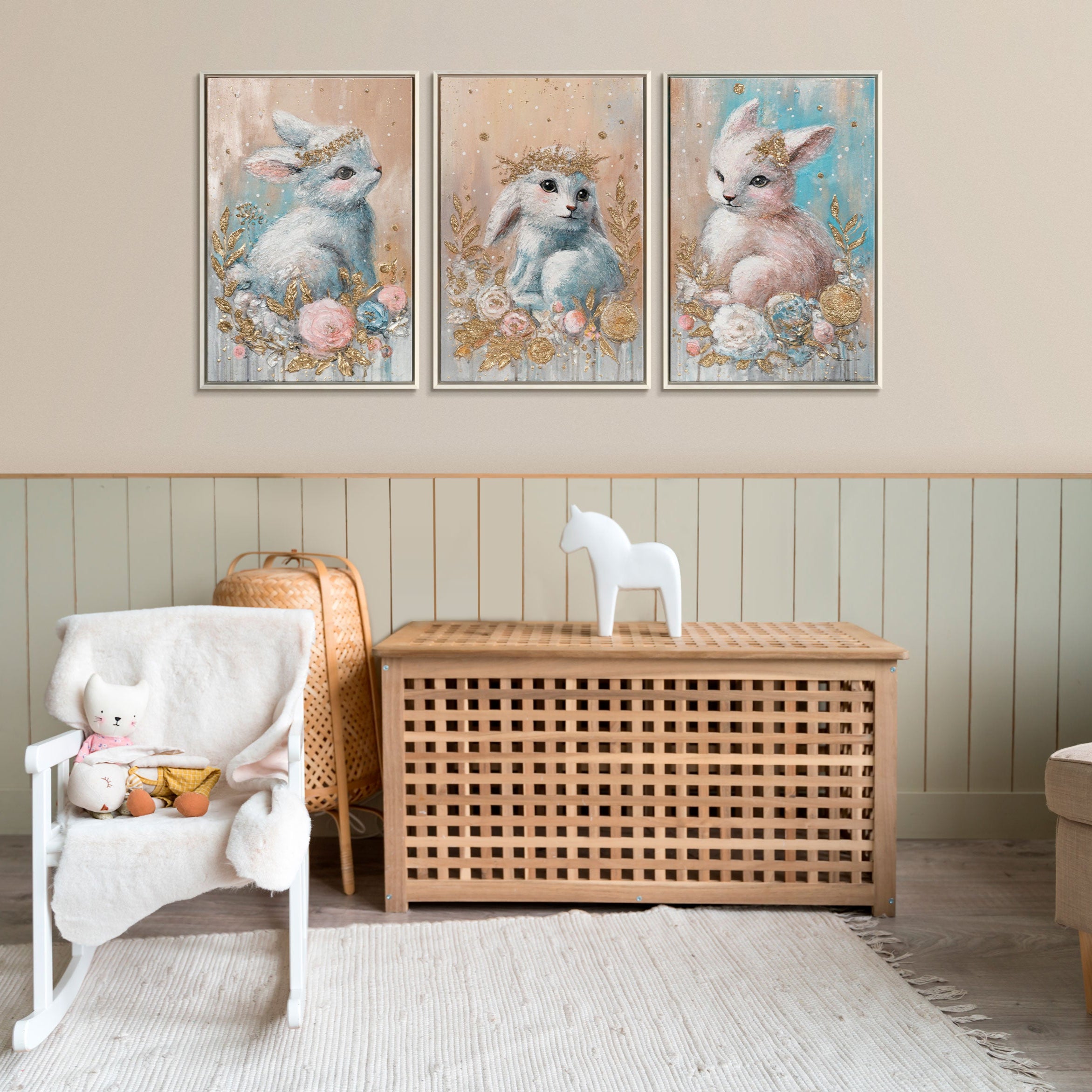 Akryylitriptyykki „Metsän lapset“ on viehättävä canvastaulu, joka esittää kolme rakkaudella toteutettua metsäeläin-aihetta pehmeissä pastellisävyissä. Käsinmaalattu, rakenteikas pinta korostaa yksityiskohtia ja antaa teokselle lämpimän, kutsuvan tunnelman. Tämä alkuperäinen triptyykki kankaalle tuo satumaisen ilmapiirin jokaiseen lastenhuoneeseen tai rauhalliseen oleskelutilaan.