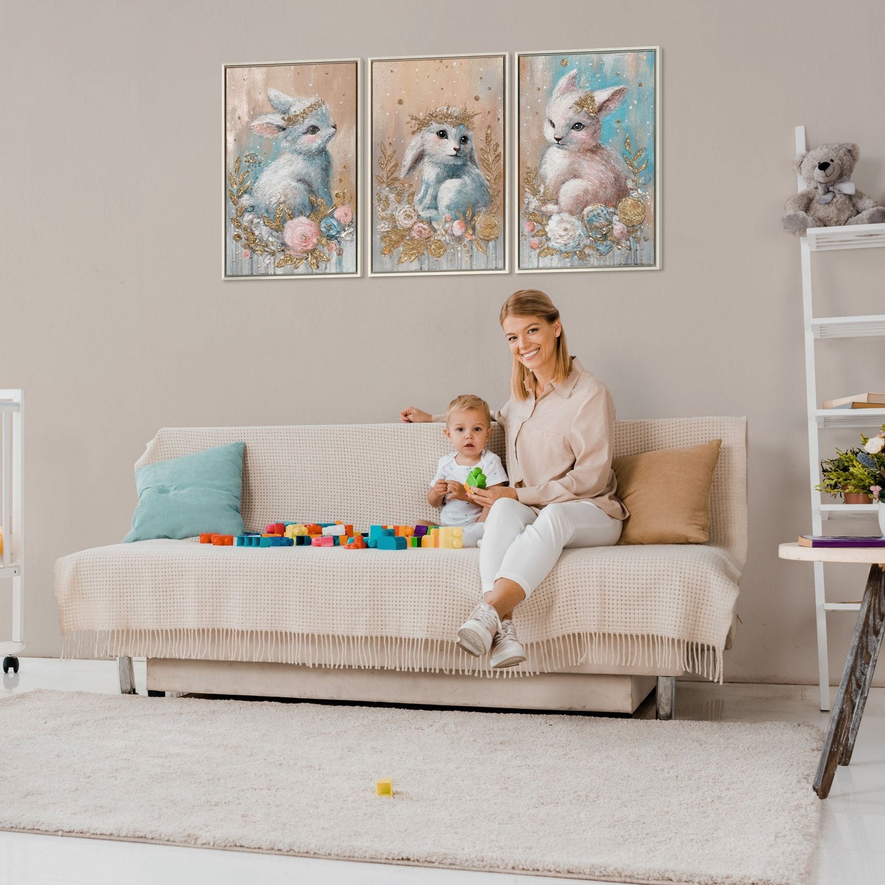 Tämä käsinmaalattu akryylimaalaus kankaalle sopii täydellisesti vauva- ja lastenhuoneisiin, luo ystävällisen ja rauhoittavan ympäristön sekä yhdistää taiteellisen omaperäisyyden ja huolella tehdyn suunnittelun. Suuri kokovalikoima tekee siitä monipuolisesti eri tiloihin sopivan.