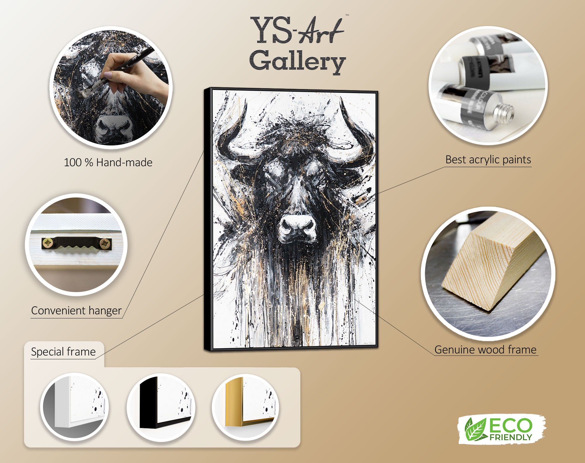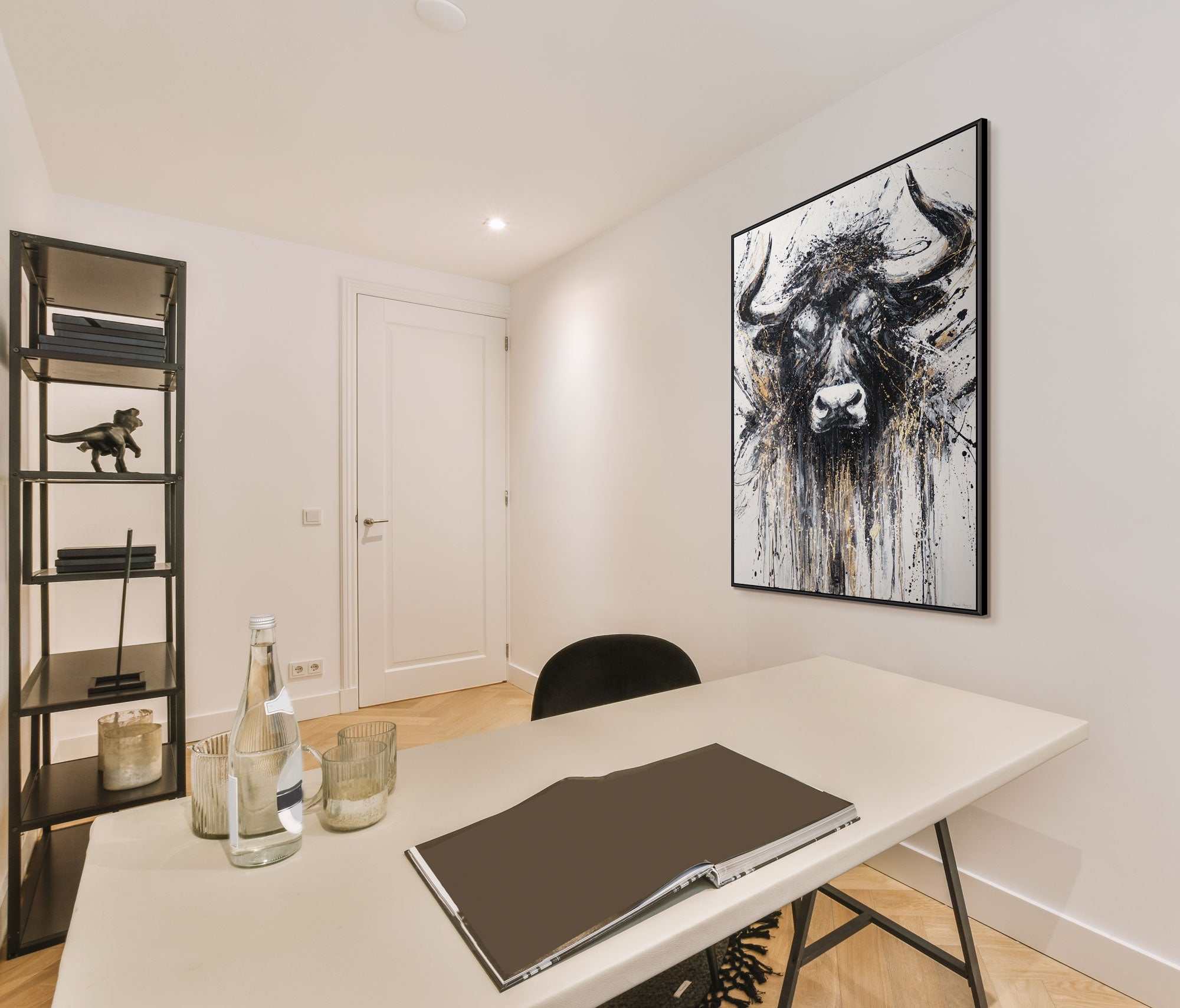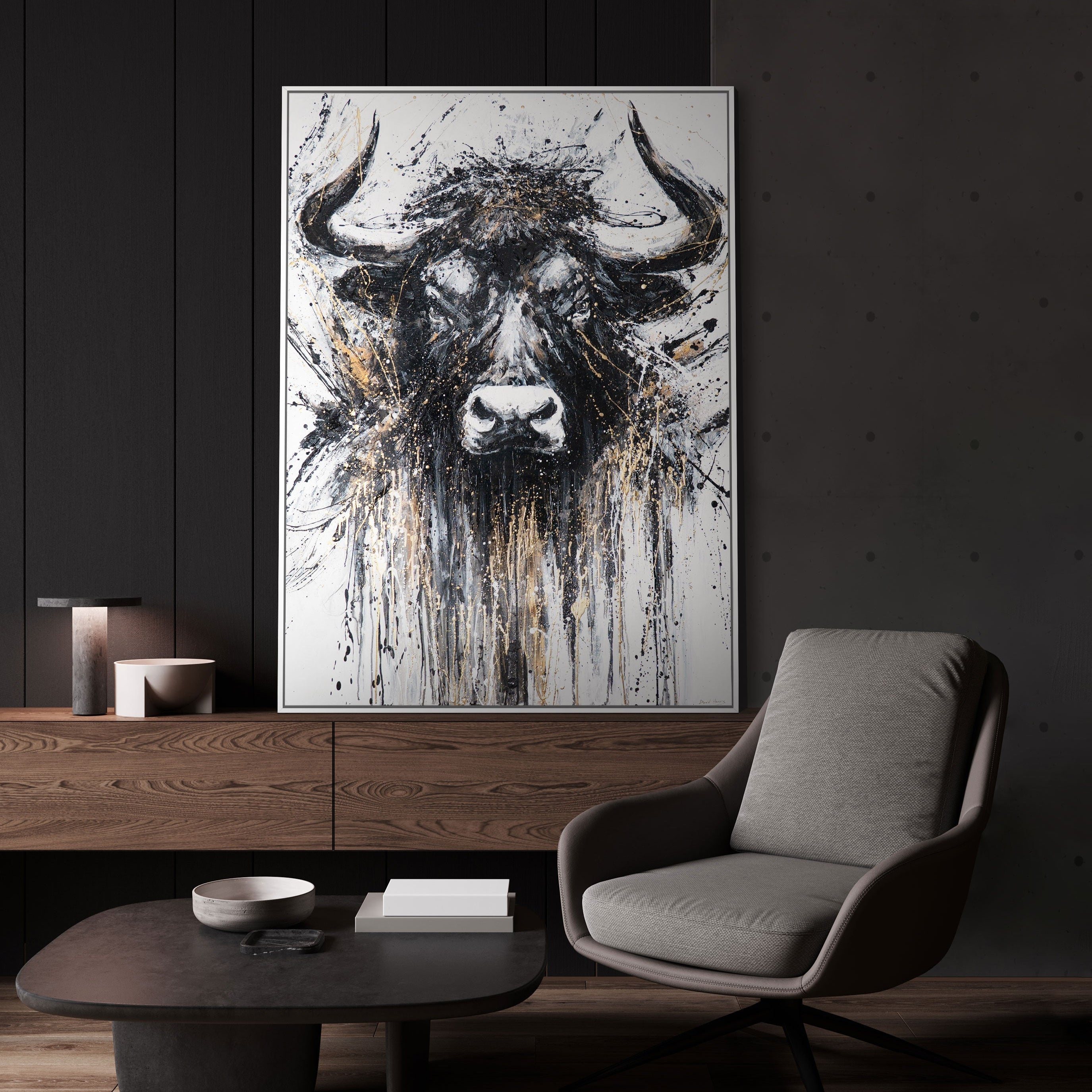 Tämä vaikuttava canvas taulu esittää suoraan katsojaa katsovan härän – majesteettinen, rauhallinen ja samalla täynnä sisäistä voimaa. Mustan, valkoisen ja kullan hillityllä väripaletilla taiteilija luo dynaamisen tekstuurin, jossa on energisiä siveltimenliikkeitä ja näyttäviä yksityiskohtia. Kultaiset roiskeet tuovat teokseen eleganssia ja jännitettä, kun taas eläimen ilmeikkäät silmät vangitsevat katsojan katseen.
