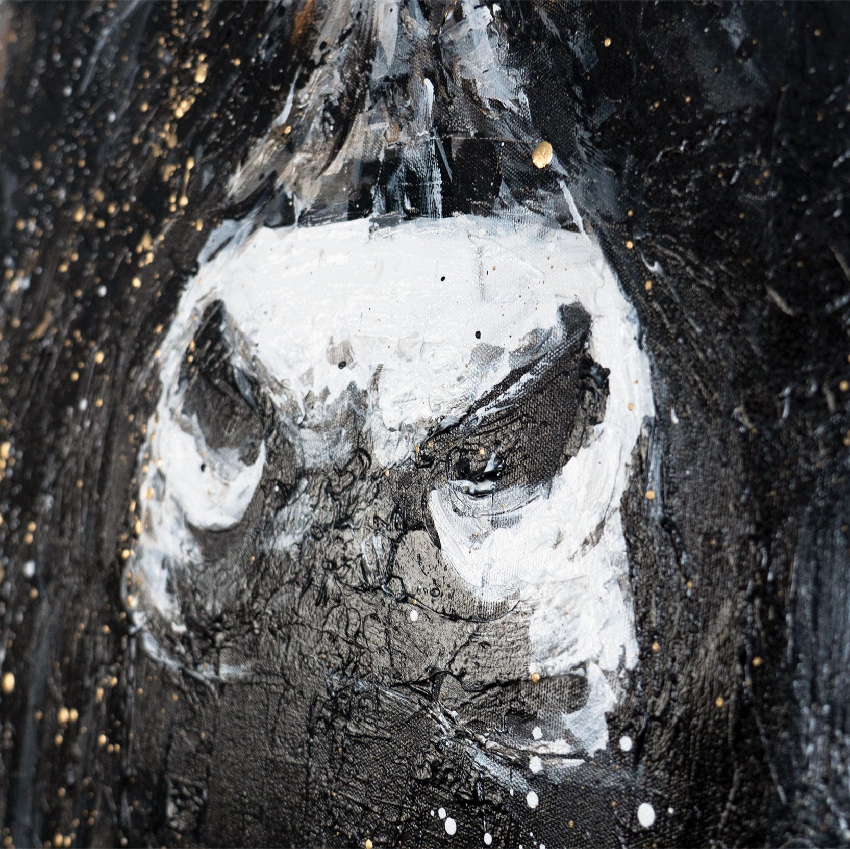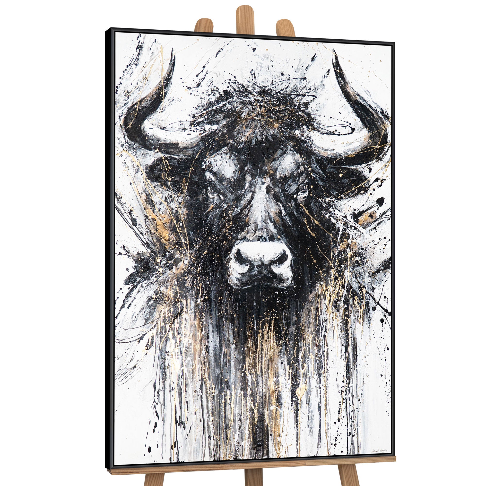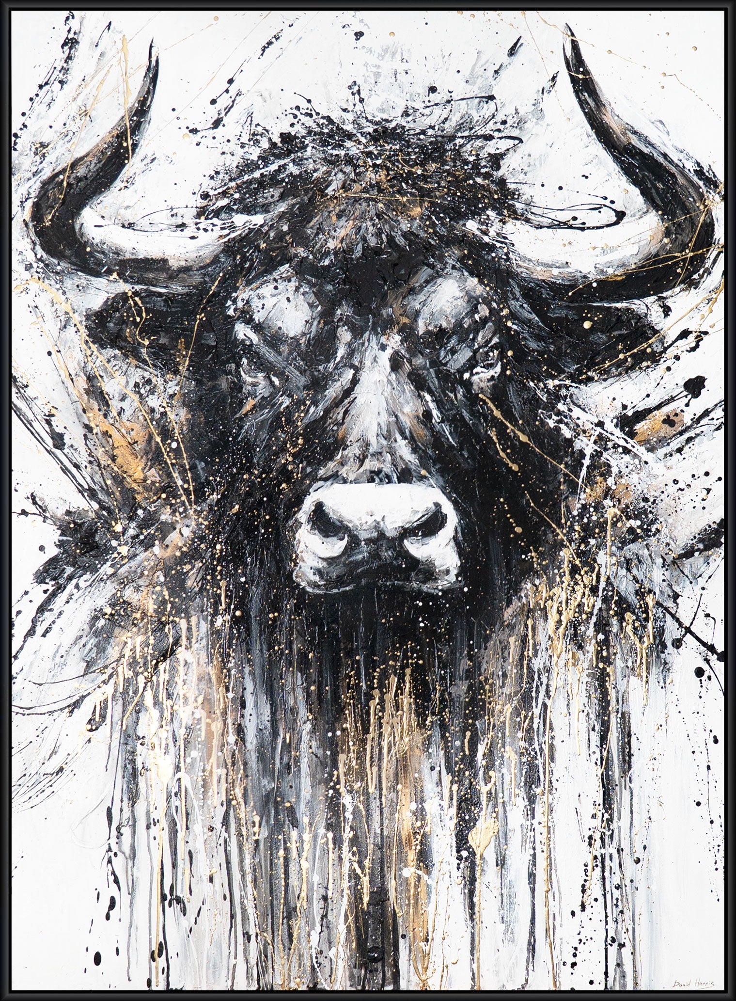 Tämä vaikuttava canvas taulu esittää suoraan katsojaa katsovan härän – majesteettinen, rauhallinen ja samalla täynnä sisäistä voimaa. Mustan, valkoisen ja kullan hillityllä väripaletilla taiteilija luo dynaamisen tekstuurin, jossa on energisiä siveltimenliikkeitä ja näyttäviä yksityiskohtia. Kultaiset roiskeet tuovat teokseen eleganssia ja jännitettä, kun taas eläimen ilmeikkäät silmät vangitsevat katsojan katseen.