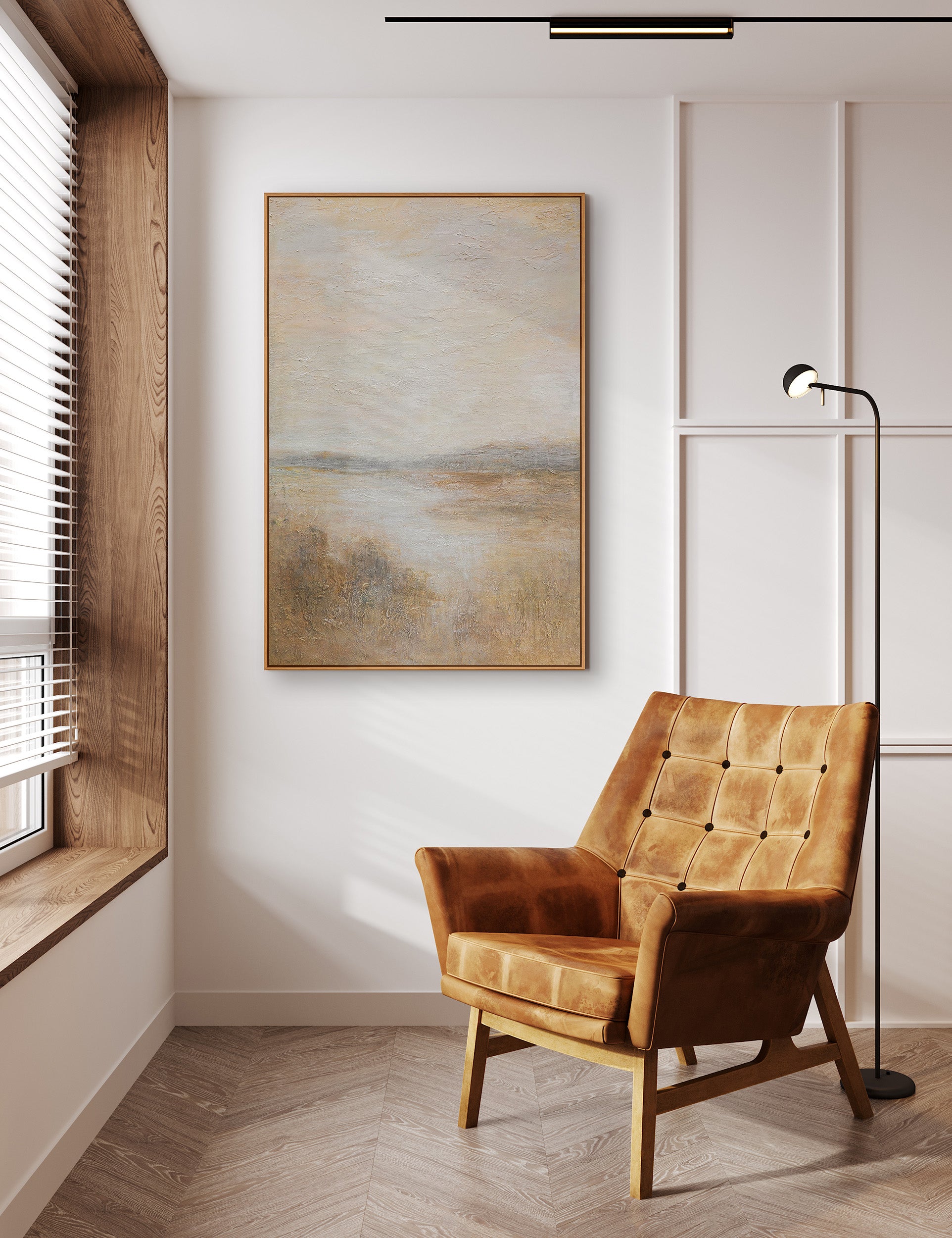 „Sumuinen aamu“ vangitsee heräävän päivän hiljaisen runollisuuden. Pehmeissä beigen sävyissä, hienovaraisissa harmaan vivahteissa ja kevyissä valonheijastuksissa syntyy tunnelmallinen maisema, joka välittää sekä rauhaa että syvyyttä. Rakenteellinen pinta antaa teokselle kosketettavan tuntuman – kuin sumu lipuisi laajan maiseman yli.