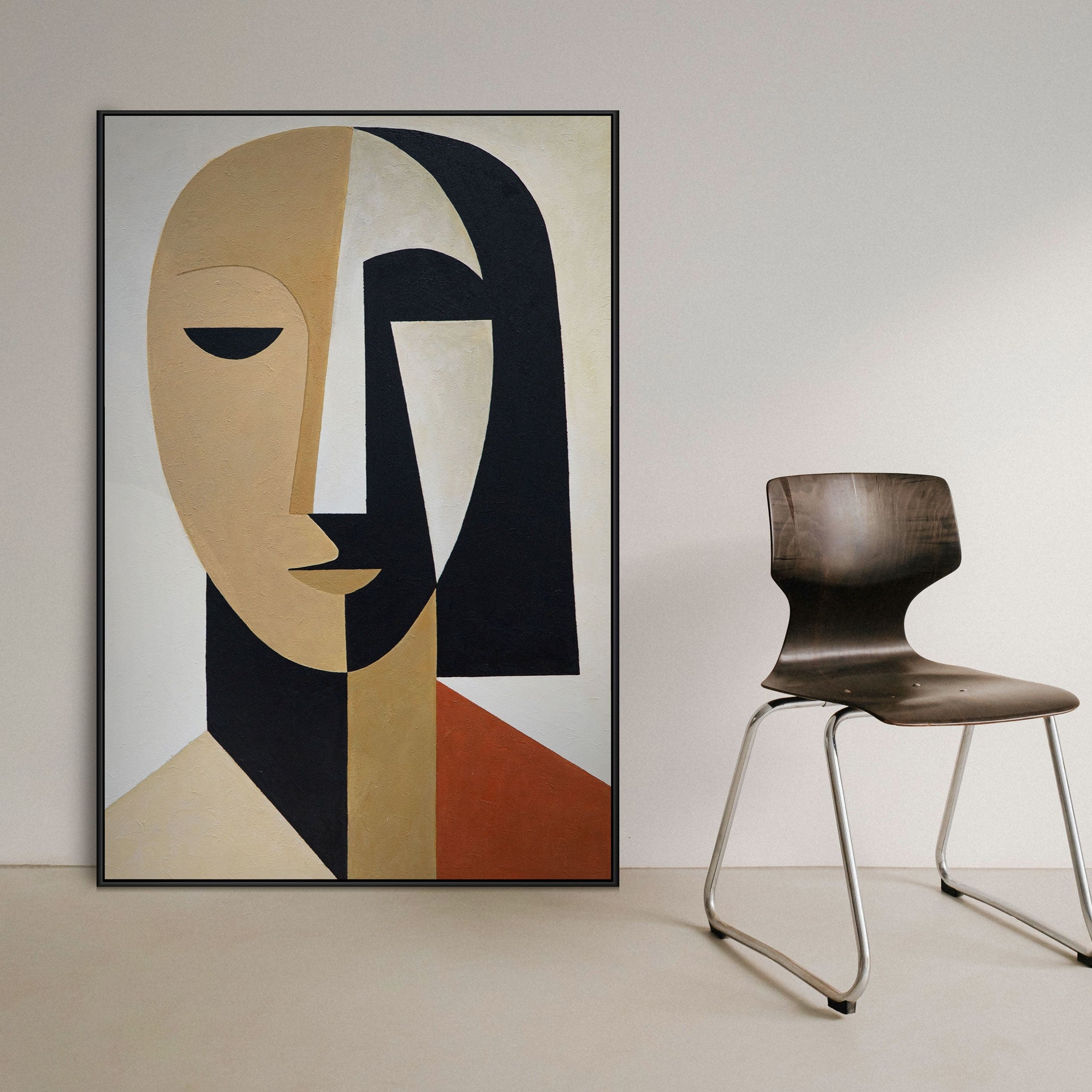 „Kasvojen geometria“ on kunnianosoitus muodon selkeydelle ja kubismin ilmaisulle. Pelkistetty kasvokuvio yhdistää geometrisia elementtejä beigen, mustan ja lämpimän terrakotan sävyissä. Jokainen pinta kertoo tarinan tasapainosta ja tunteesta – hiljaisesta harmoniasta abstraktion ja inhimillisyyden välillä.