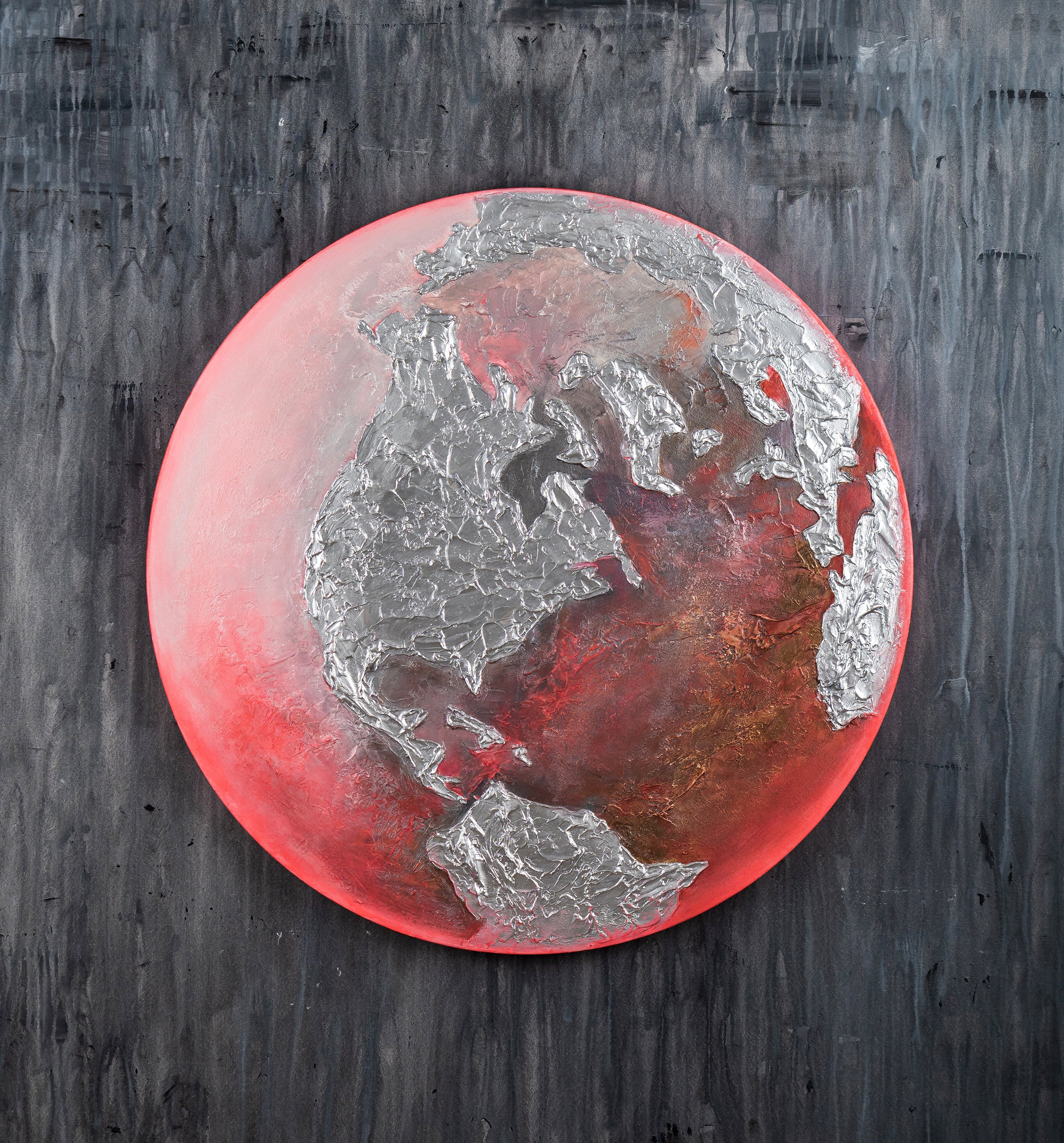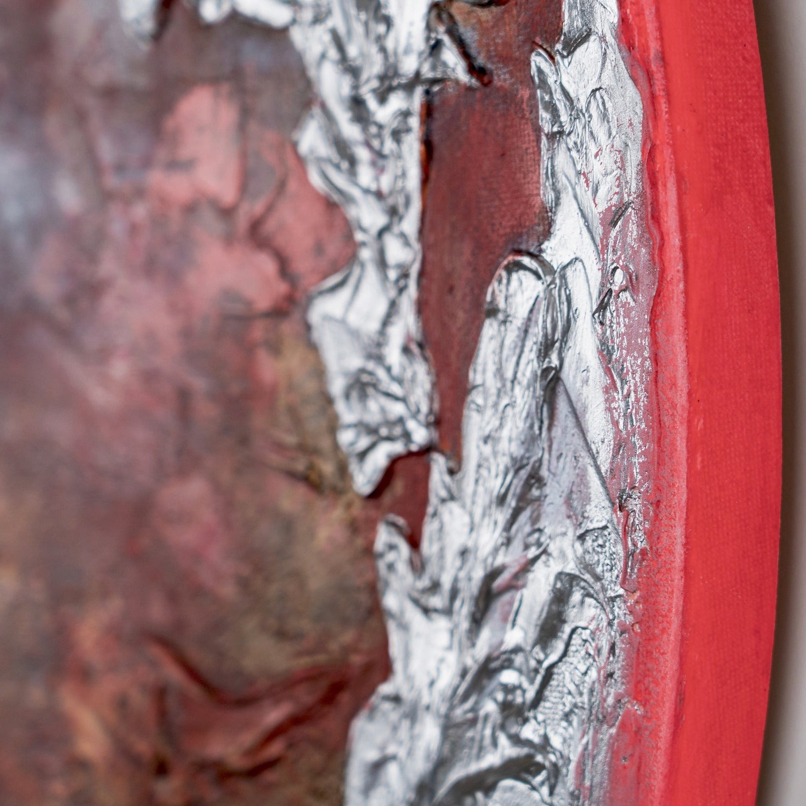 Rikastuttakaa Kotinne tai Toimiston tilaa elegantilla abstrakti maalaus "Maapallo" – pyöreällä Akryylimaalauksella Planeetan muodossa, joka hohtaa pimeässä erityisen Hohtavan Värin ansiosta. Tämä moderni Taide hurmaa punaisilla Sävyillä ja Hopeisilla Mantereilla, jotka luovat lämpimän ja dynaamisen Ilmeen. Maalaus on 100% käsinmaalattu ja korostuu elegantin Kehyksen avulla.