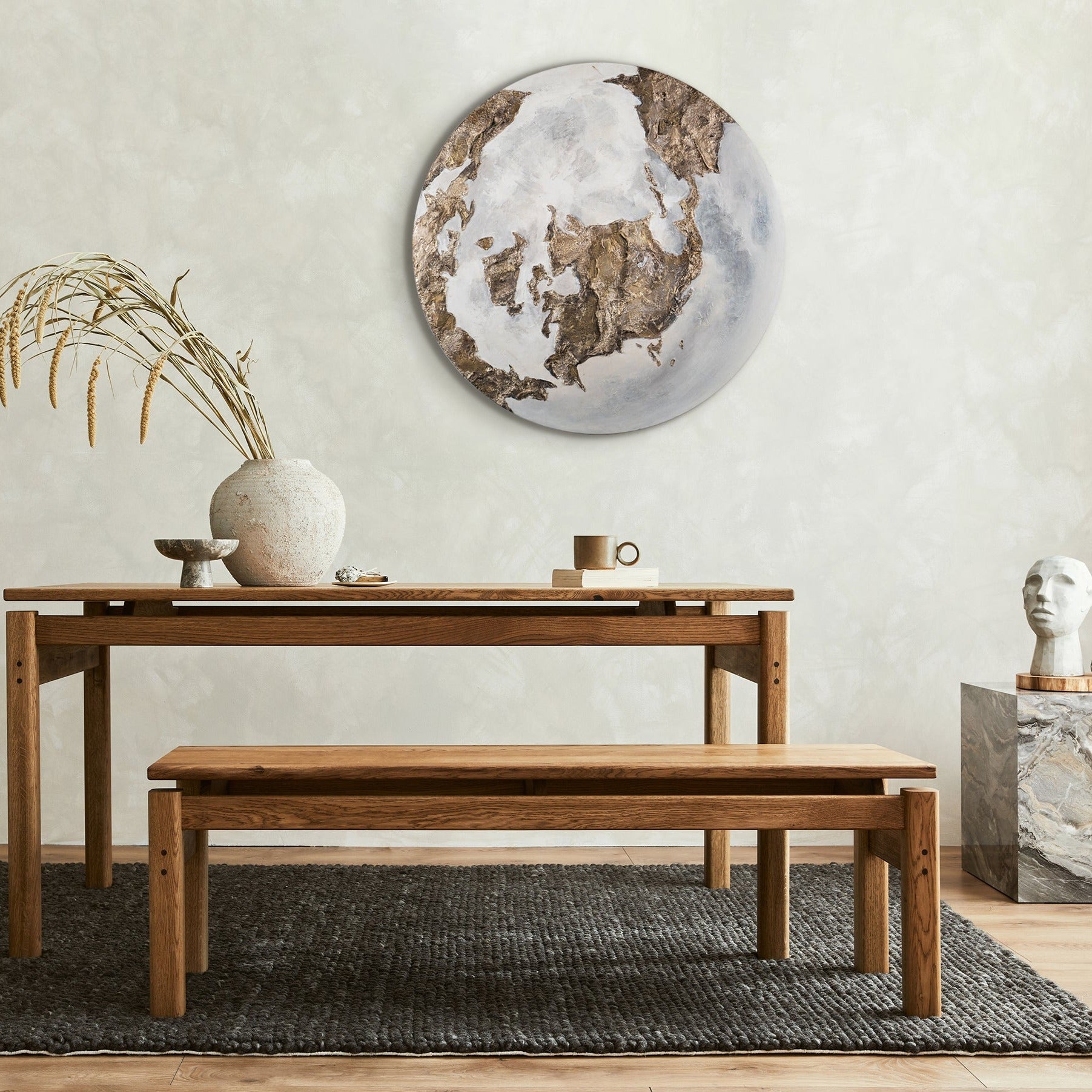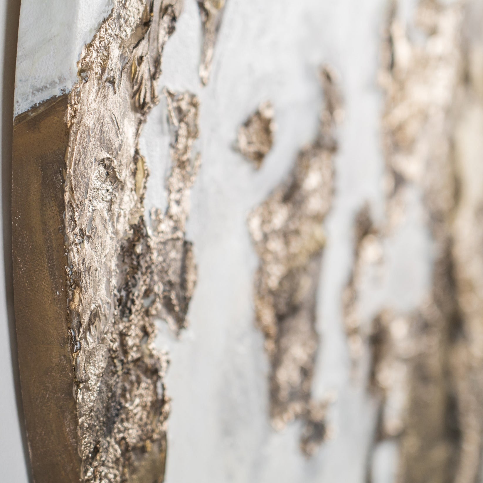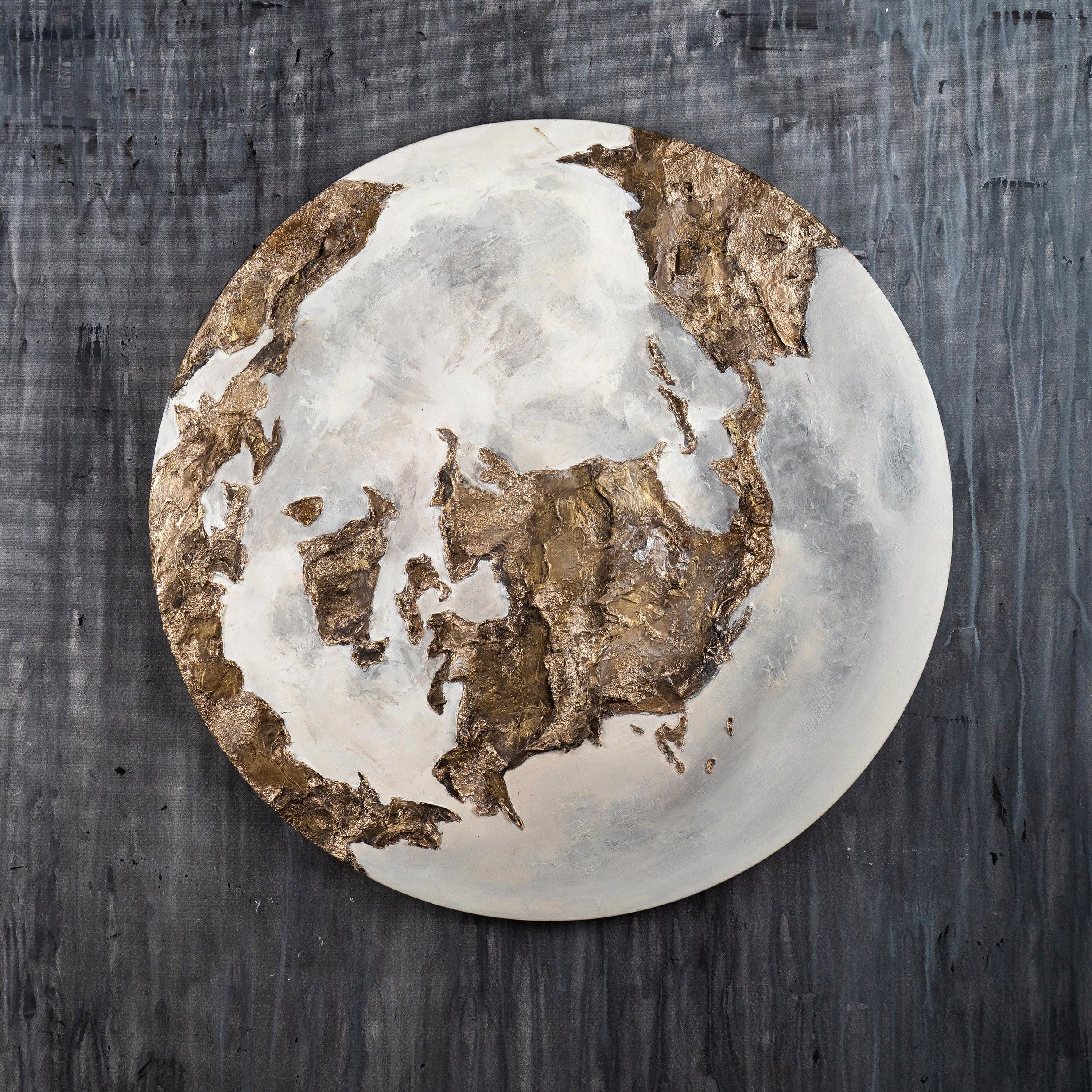 Rikastuttakaa Kotinne tai Toimiston tilaa elegantilla abstrakti maalaus "Kultainen Maapallo" – pyöreällä Akryylimaalauksella Planeetan muodossa, joka hohtaa pimeässä erityisen Hohtavan Värin ansiosta. Tämä moderni Taide hurmaa kultaisilla ja maamaisilla Sävyillä, jotka luovat lämpimän ja dynaamisen Ilmeen. Maalaus on 100% käsinmaalattu ja korostuu elegantin Kehyksen avulla.