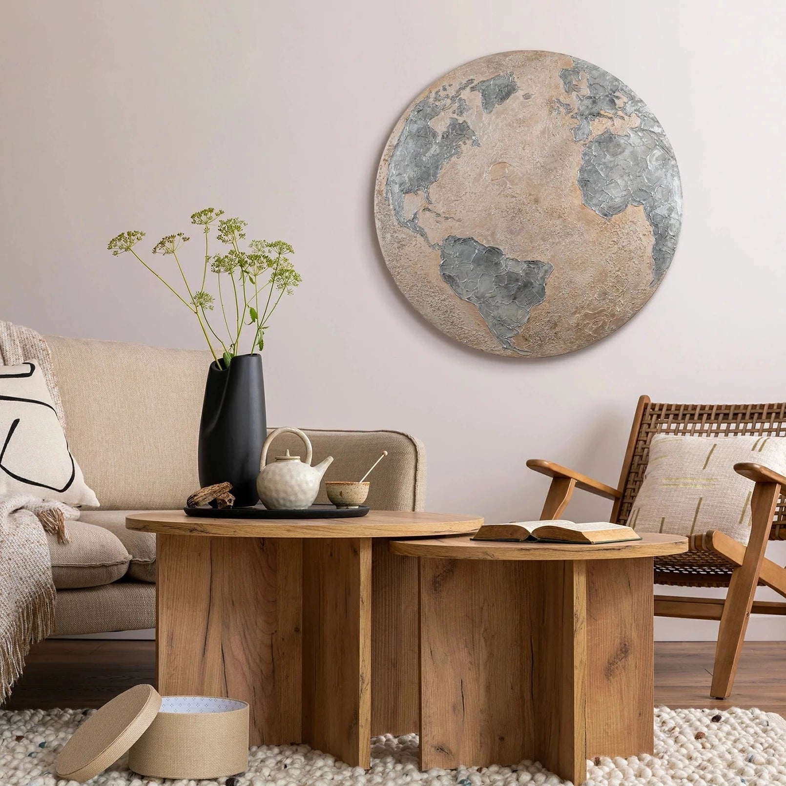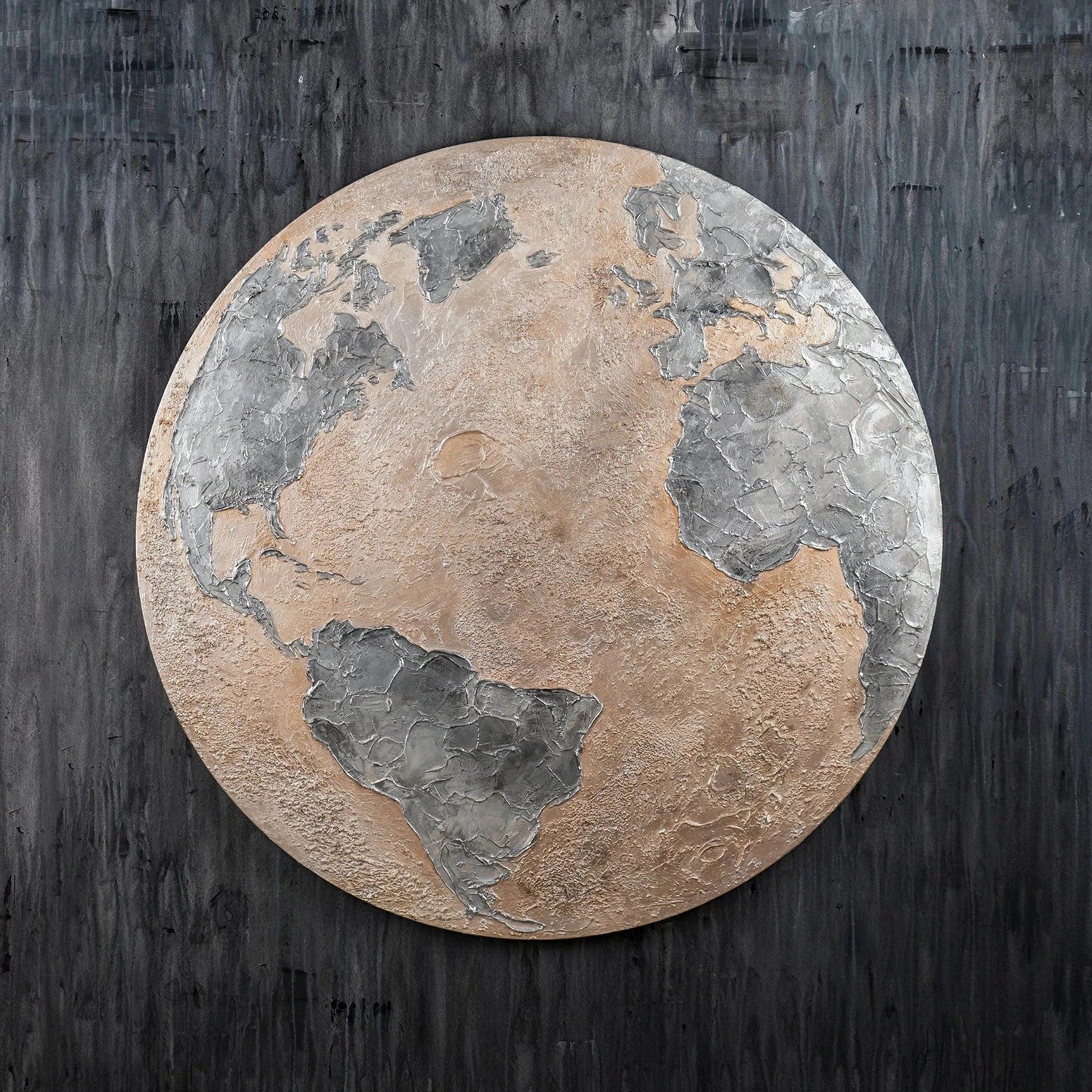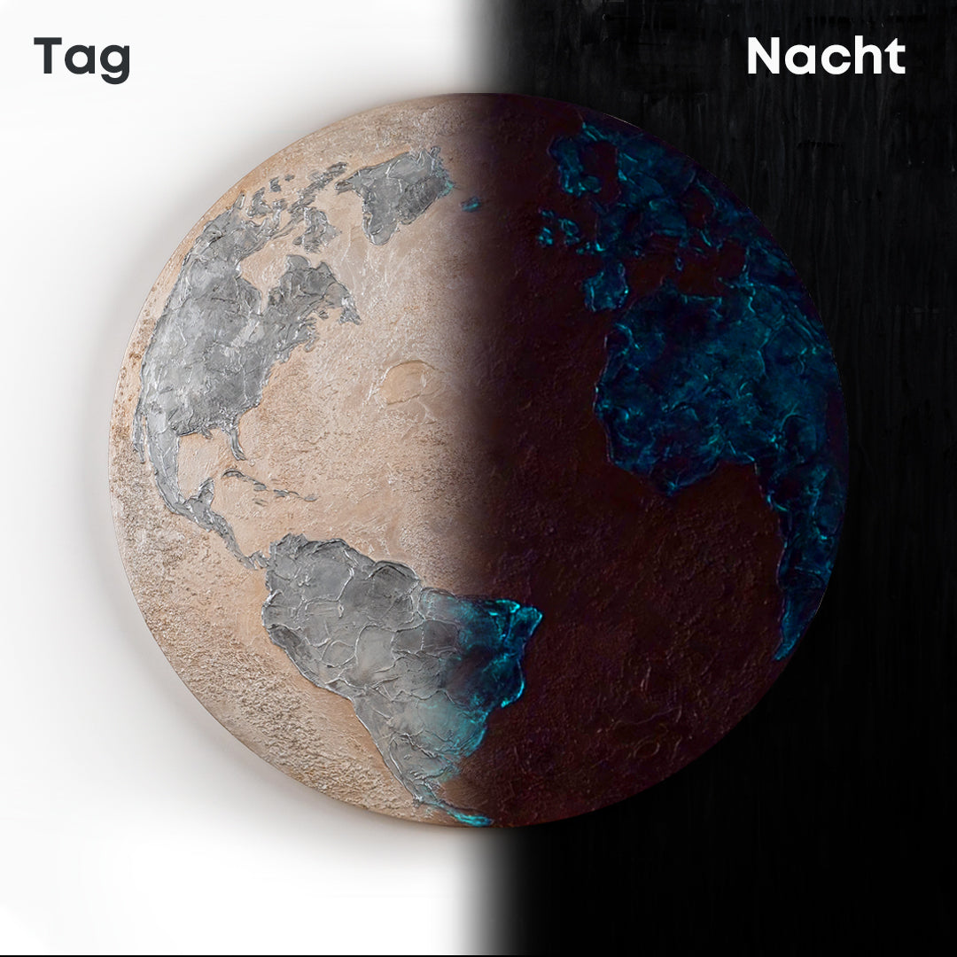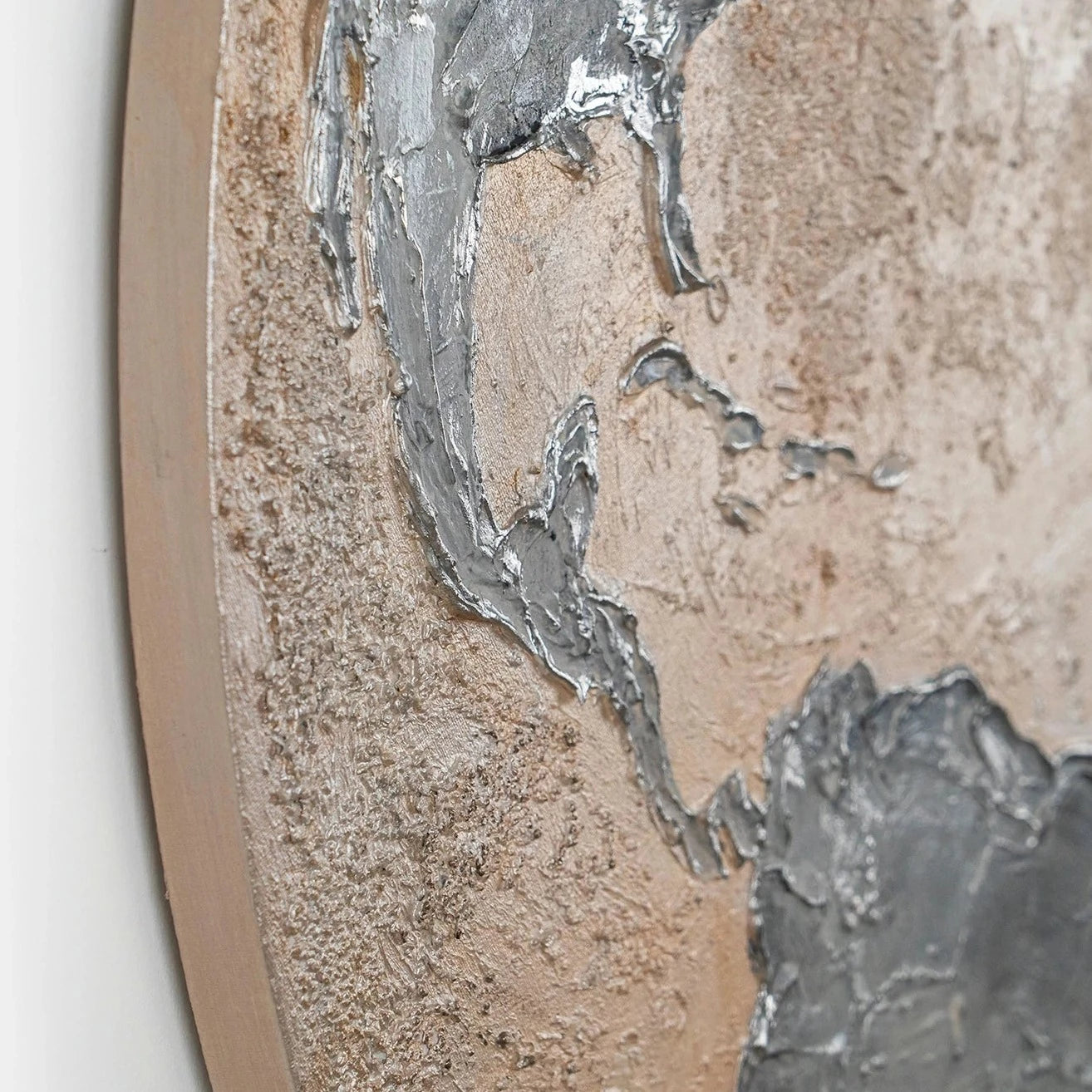 Rikastuttakaa Kotinne tai Toimiston tilaa elegantilla abstrakti maalaus "Hopeinen Planeetta" – pyöreällä Akryylimaalauksella Planeetan muodossa, joka hohtaa pimeässä erityisen Hohtavan Värin ansiosta. Tämä moderni Taide hurmaa yhdistelmällä Hopeisia ja Maamaisia Sävyjä, jotka luovat viileän ja samalla dynaamisen Ilmeen. Maalaus on 100% käsinmaalattu ja korostuu elegantin Kehyksen avulla.