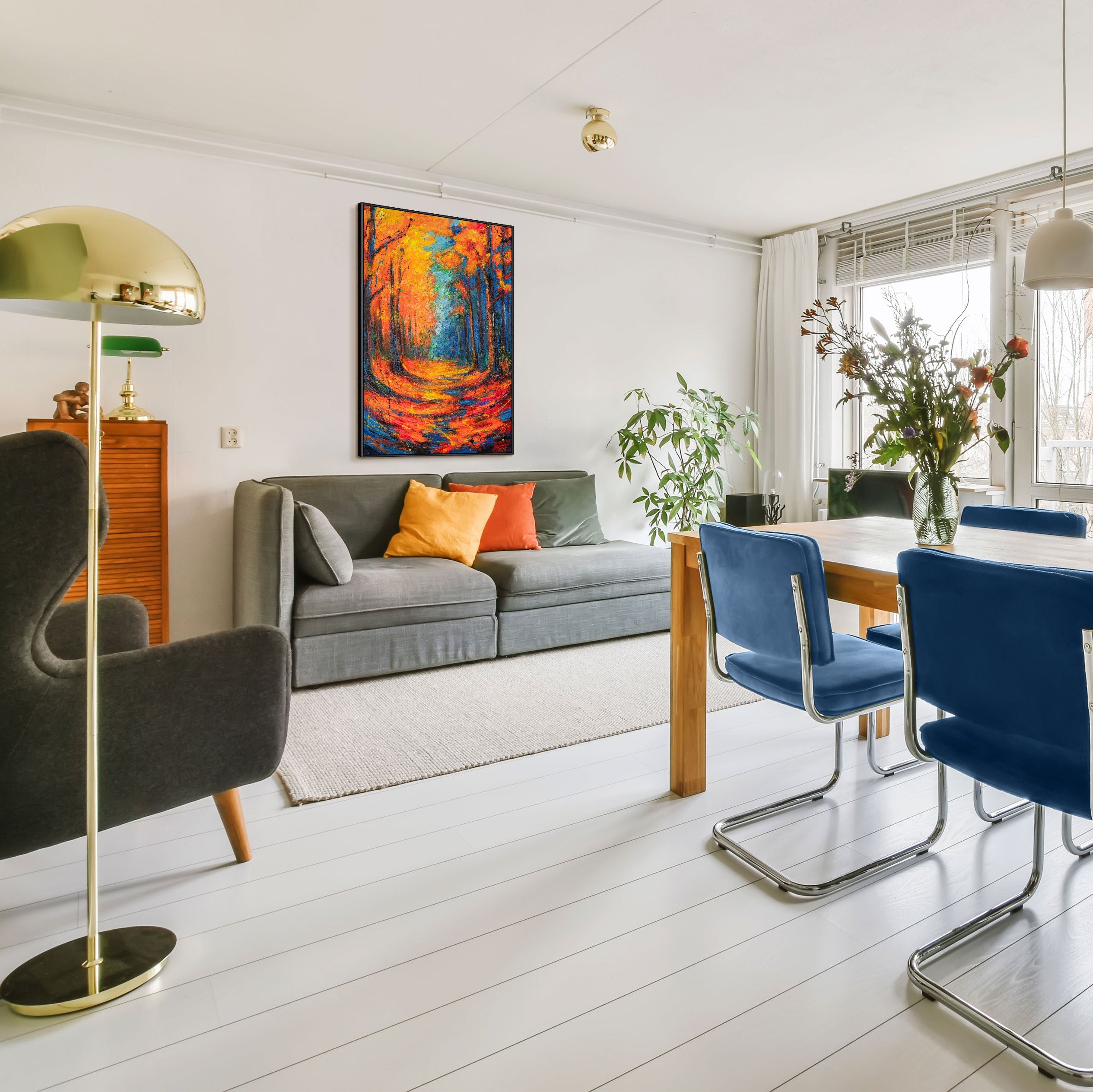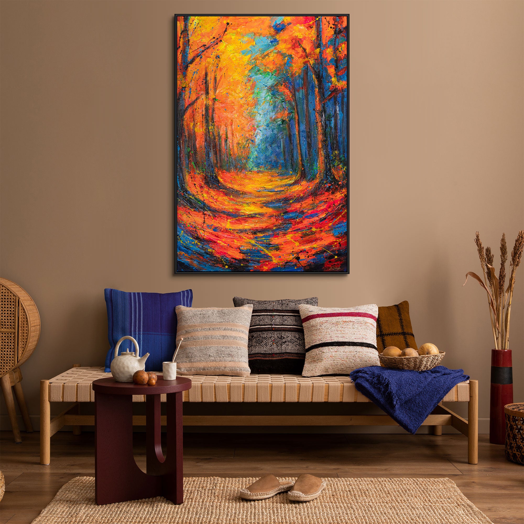 Värikäs taulu, jossa metsäpolku kulkee loistavan oranssin, punaisen ja sinisen meressä. Hohtava lehtikato peittää maan, kun korkeat ja hoikat puut sinisen ja mustan voimakkaissa sävyissä reunustavat polkua. Lämmin valo ja syvä tekstuuri luovat dynaamisen mutta samalla rauhoittavan tunnelman – kuin syksy olisi liekeissä.