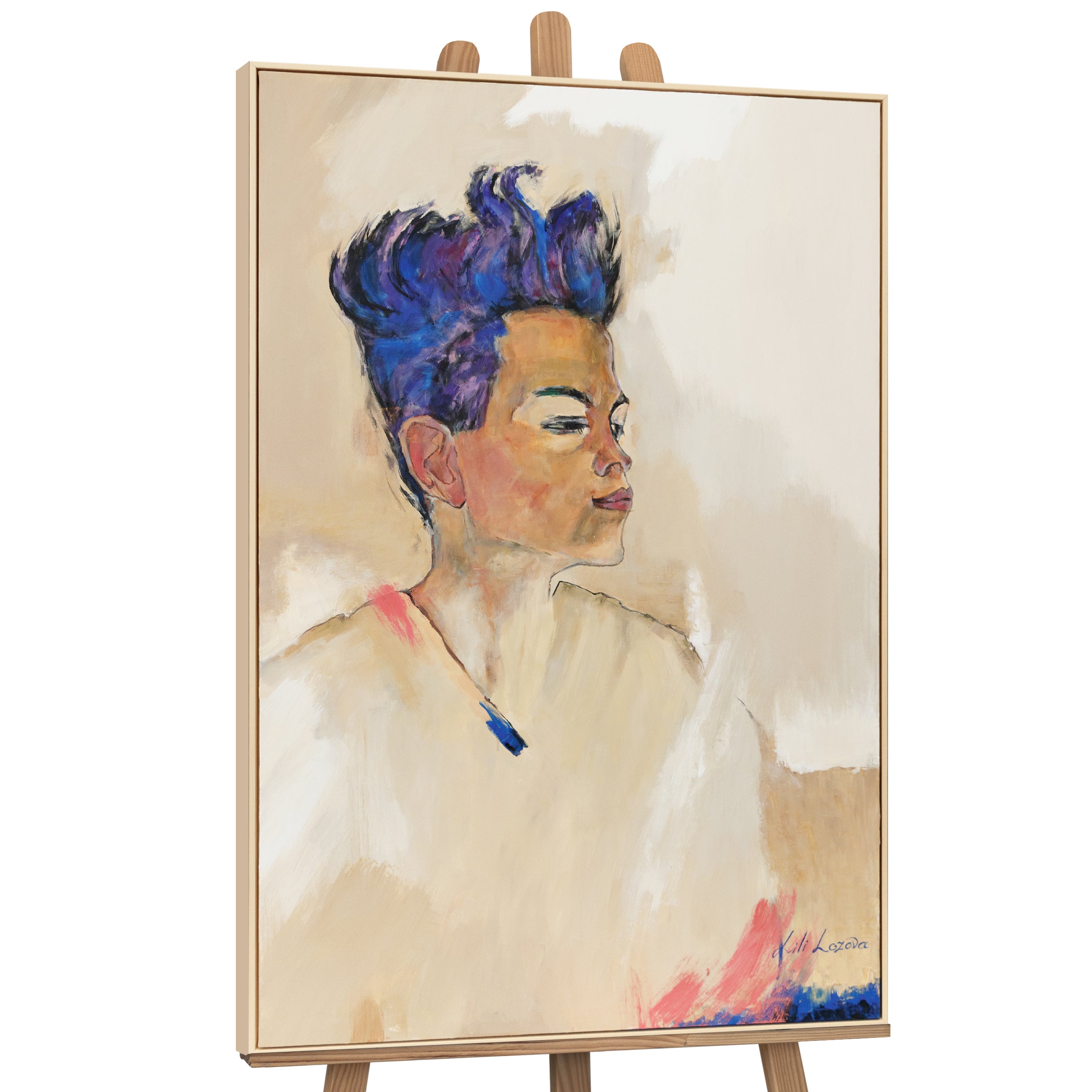 Tämä ilmeikäs taulu kankaalle vangitsee abstraktin muotokuvan intensiteetin elävillä väreillä ja dynaamisilla siveltimenvedoilla. Sinisen, beigen ja roosan sävyjen yhdistelmä antaa teokselle modernin ja samalla tunteikkaan syvyyden. Todellinen katseenvangitsija taiteellisissa olohuoneissa, gallerioissa tai toimistoissa.