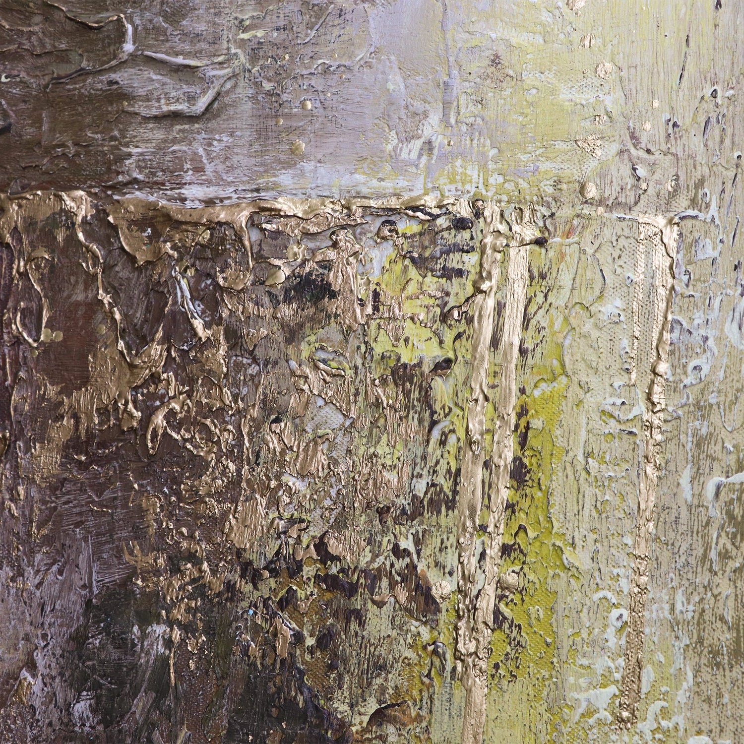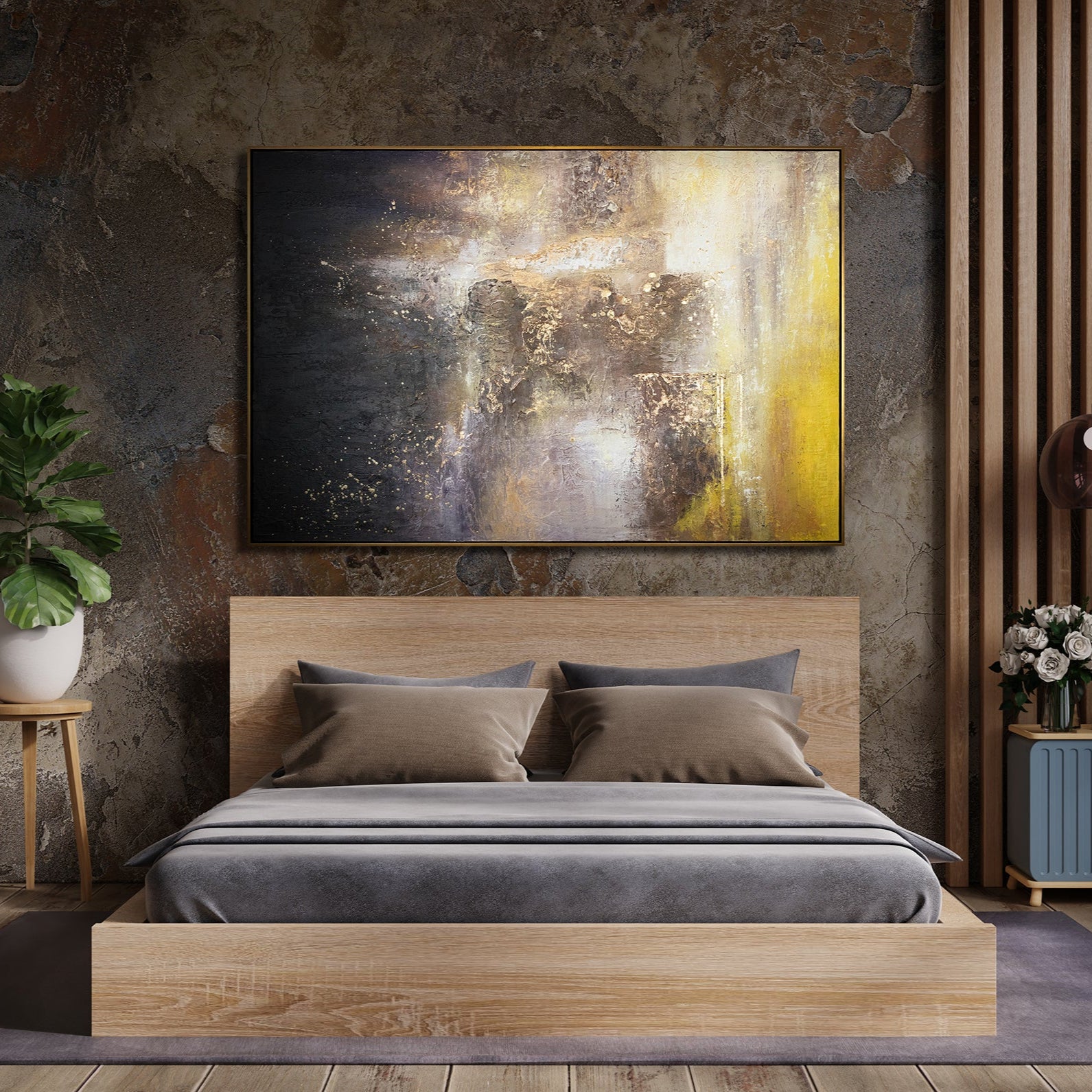 Tämä kiehtova abstrakti kankaalle maalattu taideteos yhdistää modernin estetiikan taiteellisiin kultaisiin ja tummiin aksentteihin, luoden jokaiselle huoneelle erityistä syvyyttä ja eleganssia. Hienostunut värikoostumus ja havaittava tekstuuri tekevät siitä poikkeuksellisen maalaukset taulut katseenvangitsijan.