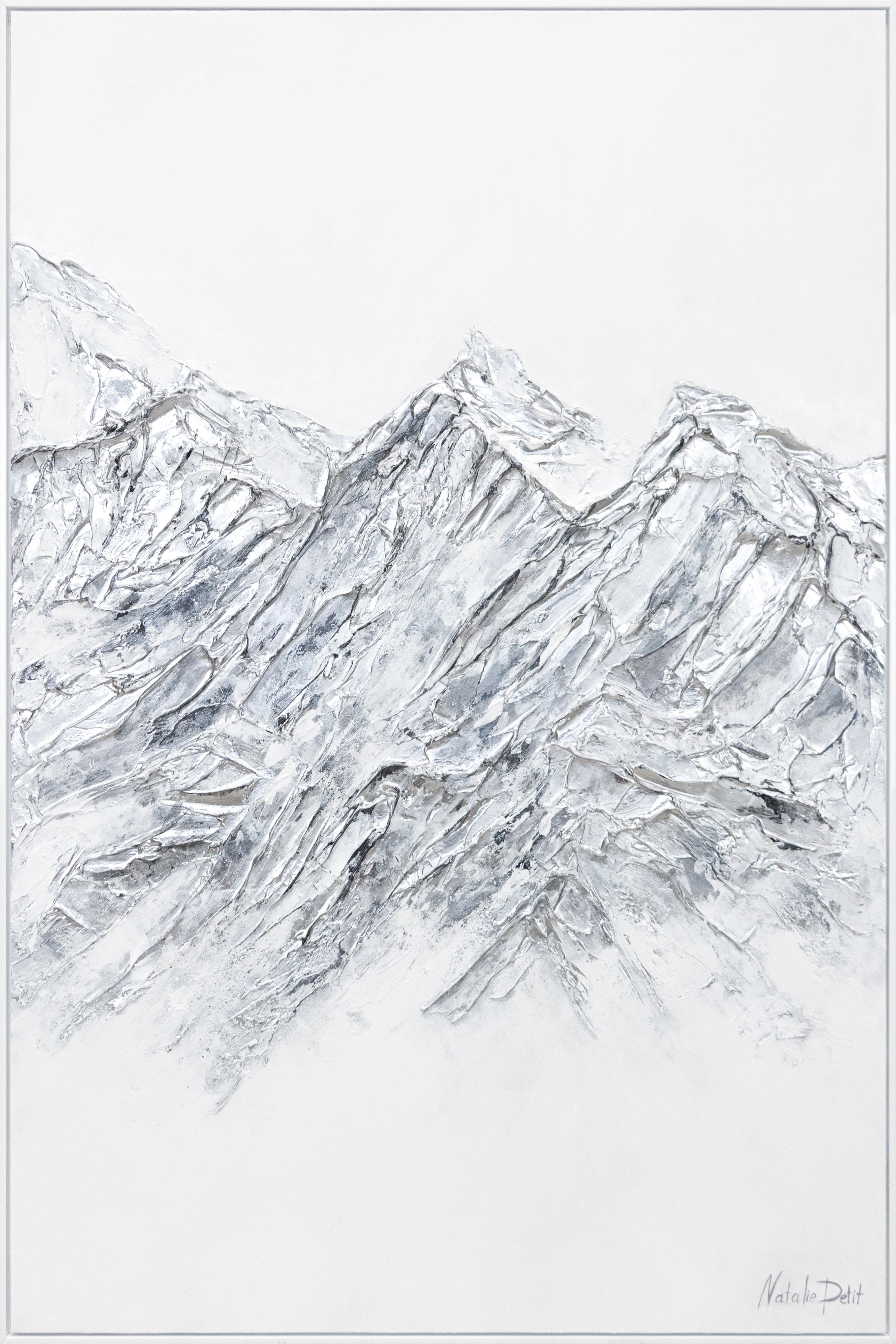 Tämä vaikuttava akryylimaalaus esittää majesteettisia vuoria yksityiskohtaisella ja teksturoidulla tavalla. Valkoisten ja harmaiden sävyjen rauhallinen kontrasti luo seesteisen ilmapiirin ja tekee tästä teoksesta erinomaisen valinnan niin kotiin kuin toimistoon.