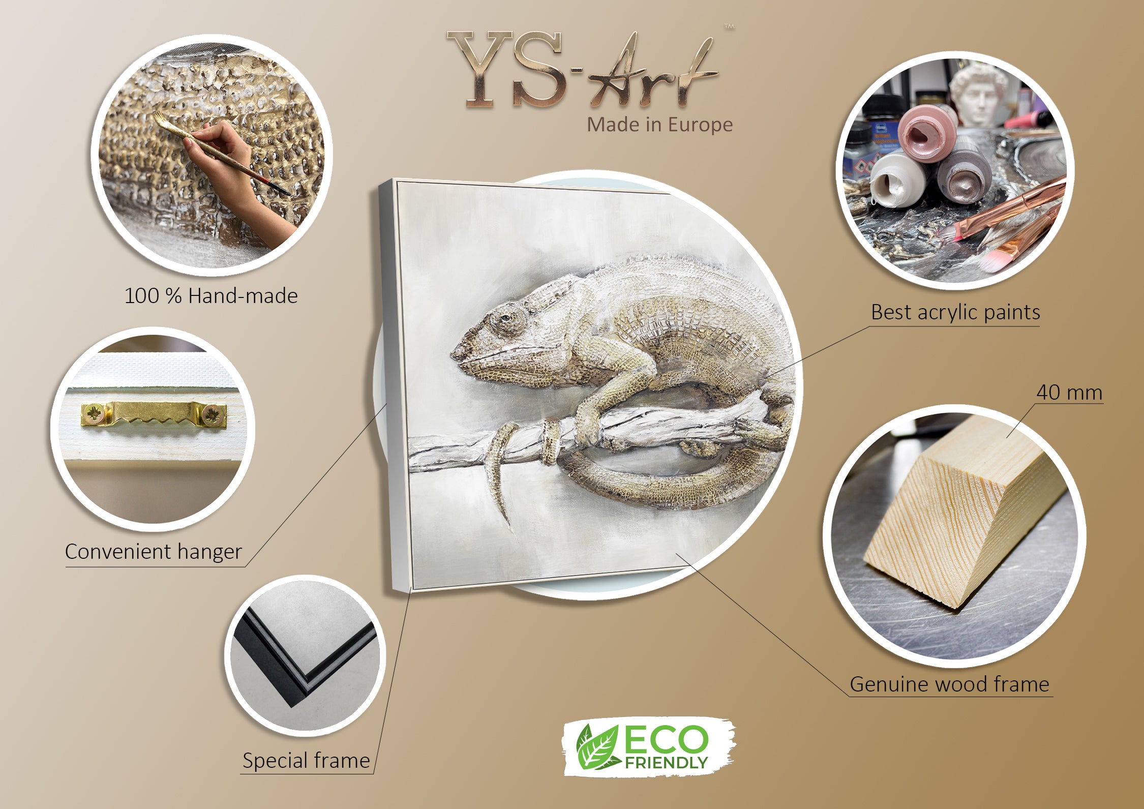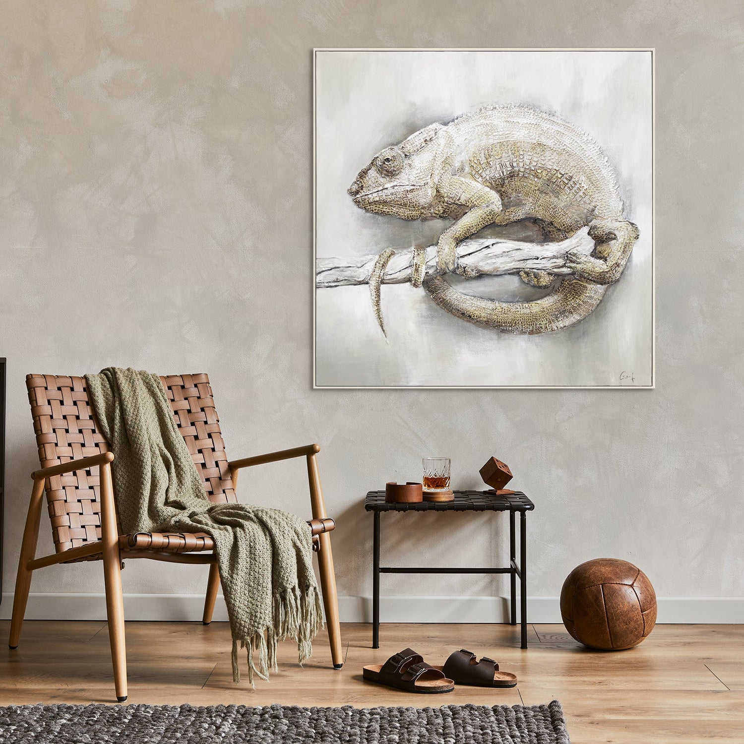 Tämä lumoava käsinmaalattu maalaus abstrakti taideteos esittää yksityiskohtaisen kameleontin, joka lepää oksalla. Hienostunut tekstuuri ja luonnolliset maanläheiset sävyt – beige, harmaa ja valkoinen – antavat kuvalle elegantin ja rauhoittavan ilmeen. Täydellinen moderniin, minimalistiseen sisustukseen, tämä maalaukset taulut luo harmonisen yhteyden luonnon ja muotoilun välille.