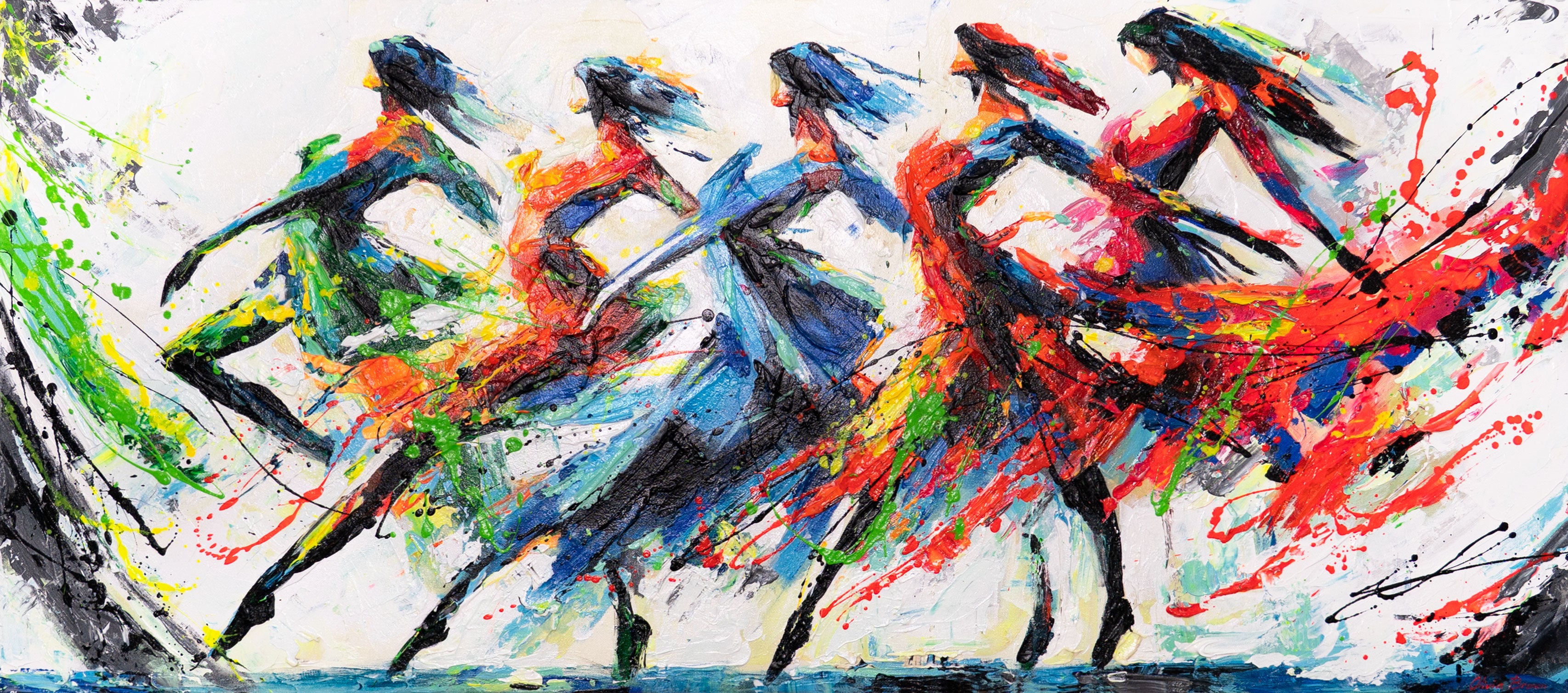 Tämä taiteellinen akryylimaalaus vangitsee tanssivien naisten eleganssin ja elinvoimaisuuden räiskyvissä väreissä. Abstrakti taulu siveltimenvetojen muodot punaisessa, vihreässä, sinisessä ja keltaisessa antavat teokselle dynaamisen liikkeen ja voimakkaan emotionaalisen ilmaisun.
