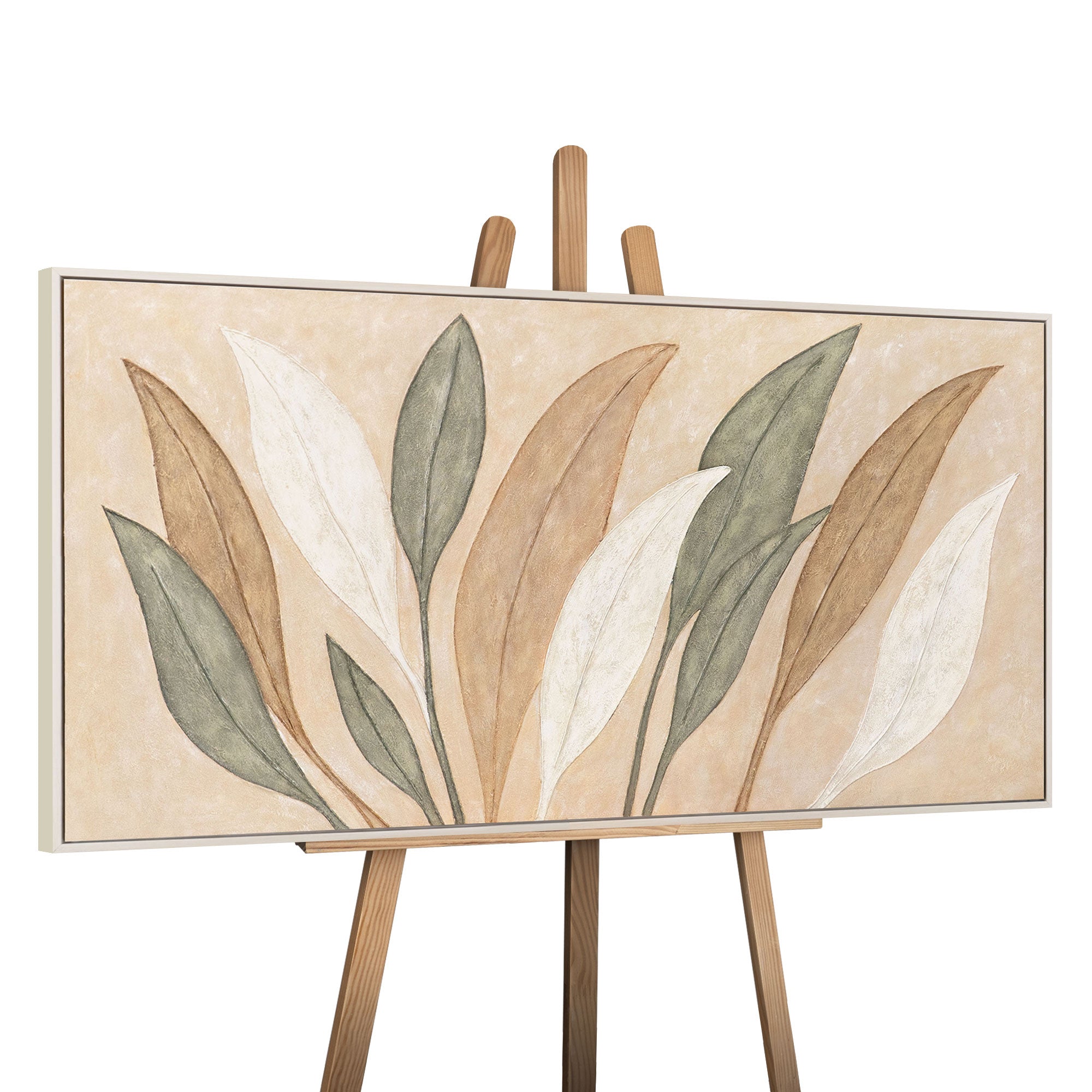 Tuo luonnon kauneus kotiisi käsinmaalatun canvas taulu "Lehtien tanssi" avulla. Pehmeät maanläheiset sävyt beigessä, ruskeassa ja vihreässä sulautuvat harmonisesti selkeisiin linjoihin ja rakenteelliseen pintaan. Elegantti sommitelma välittää rauhaa ja luonnollisuutta, kun taas orgaaniset lehtimuodot säteilevät ajatonta keveyttä.