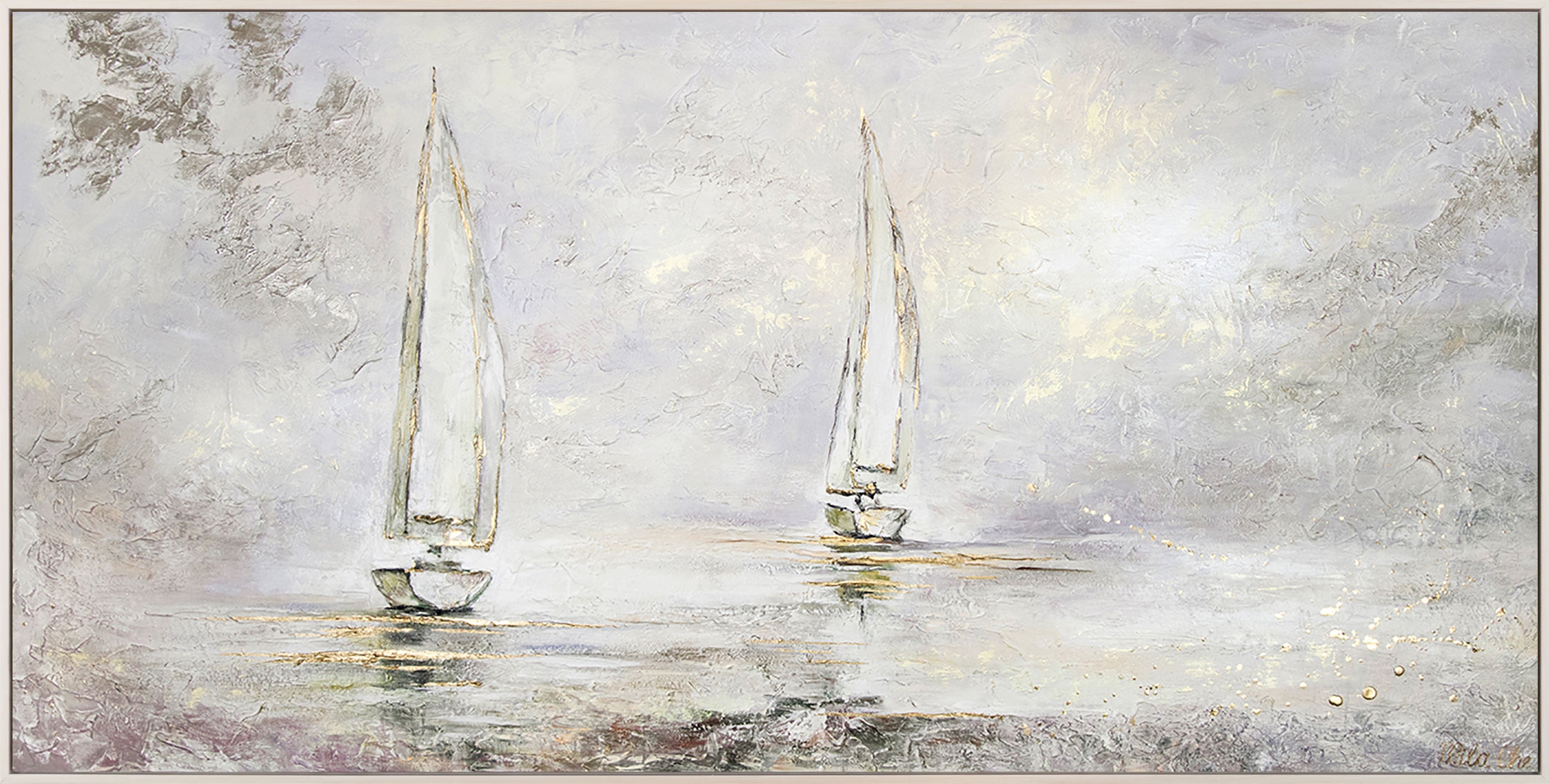 Tämä ainutlaatuinen vaakasuuntainen abstrakti maalaus vangitsee myrskyisen Meren hiljaisen ja mystisen Tunnelman sumuisena aamuna. Elegantit Purjeveneet, toteutettu hienoissa Valkoisen ja Harmaan sävyissä, liukuvat äänettömästi Vesipinnan yli. Hienovaraiset Kulta-korostukset antavat taululle ripauksen Ylellisyyttä ja Eksklusiivisuutta.
