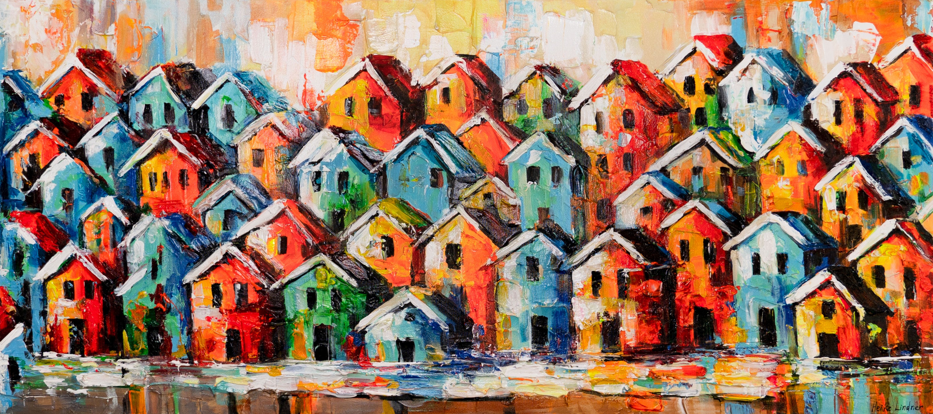 "Värikäs Kaupunki" on eläväinen käsinmaalattu akryylimaalaus kankaalle, jossa moniväriset talot luovat dynaamisen ja iloisen vaikutelman. Syvät värit ja energiset siveltimenvedot tekevät siitä täydellisen abstraktin seinätaiteen moderneihin olohuoneisiin, käytäville tai luoviin työtiloihin. Jokainen kappale on uniikki teos huolellisella rakenteella ja säteilevällä värimaailmalla.