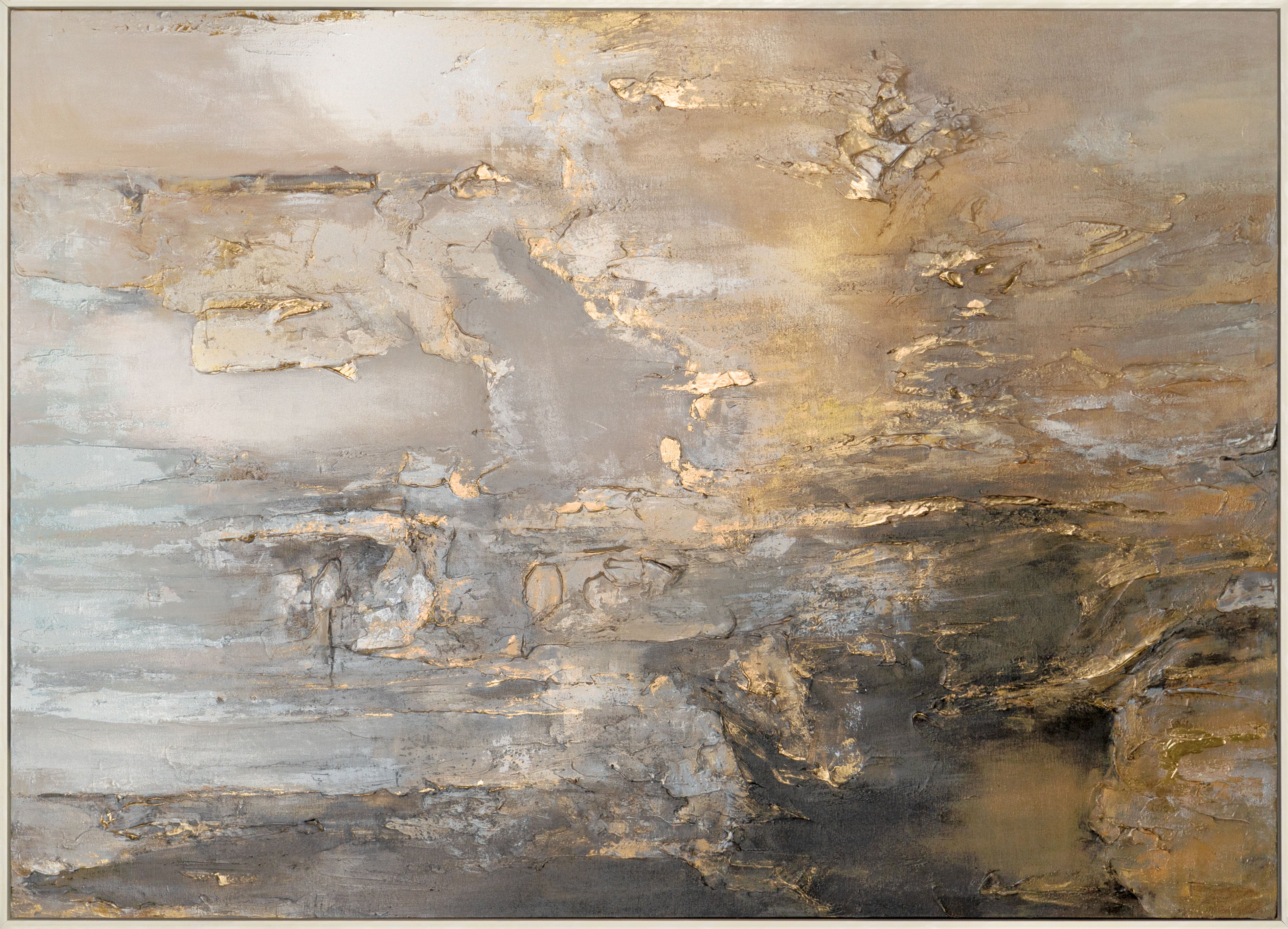 Tutustu abstraktin Taiteen kiehtovaan maailmaan teoksen ""Kultainen Harmonia"" kautta. Tämä käsinmaalattu Taideteos kankaalle tuo ripauksen Eleganssia ja Modernia Olohuoneeseesi. Harmoninen yhdistelmä kultaisia ja beigejä Sävyjä luo rauhoittavan ja tyylikkään Tunnelman.
