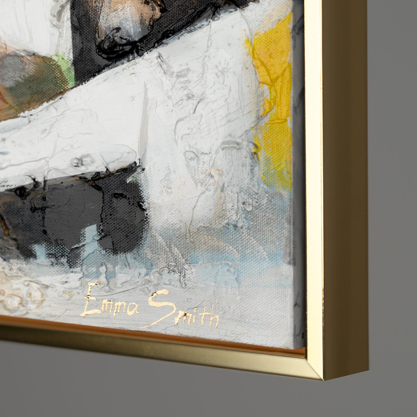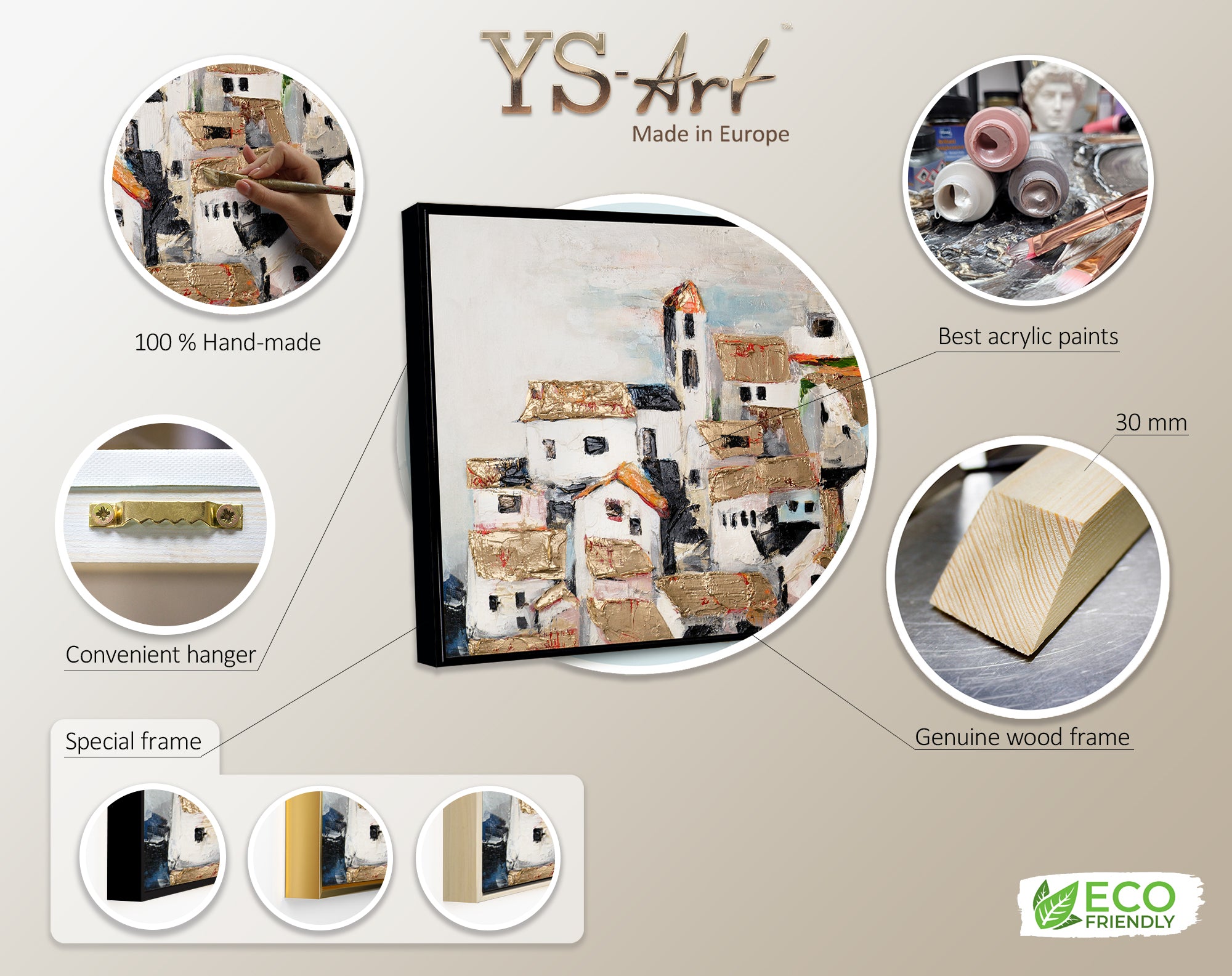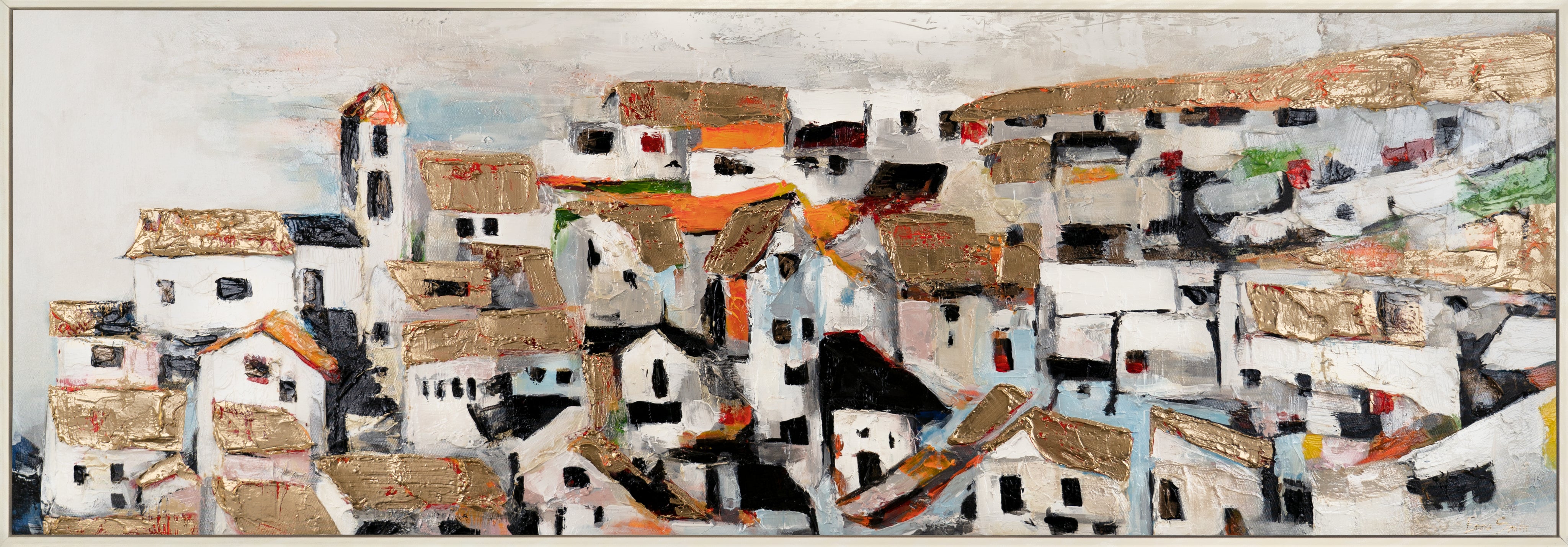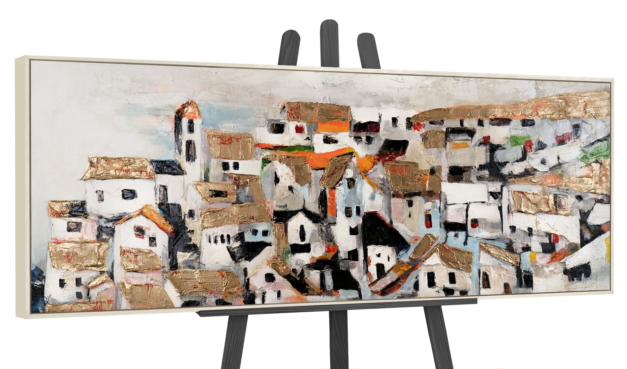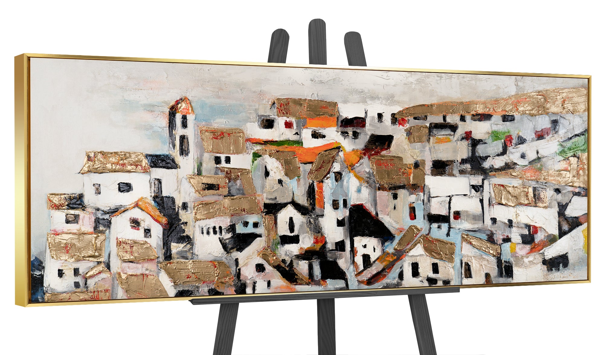 Tämä käsinmaalattu canvas taulu kankaalle – Maalaus „Aurinkotalot“ vangitsee lumoavan kaupunkinäkymän abstraktilla esitystavalla. Lämpimät valkoiset ja kultaiset sävyt sulautuvat eläväksi sommitelmaksi, jonka runsaasti rakenteellinen pinta luo erityistä syvyyttä. Kultaiset korostukset antavat taideteokselle hienostuneen loisteen, joka tuo tilaan lämpöä ja eleganssia.