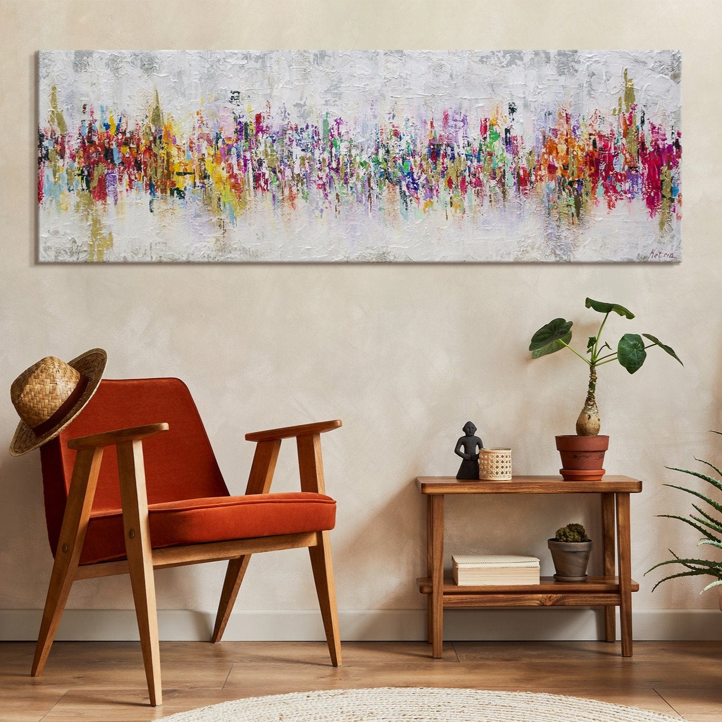 Käsinmaalattu akryylimaalaus „Abstraktio II“ on ainutlaatuinen abstrakti taulu, jossa yhdistyvät elävät värit ja dynaaminen tekstuuri. Harmoninen sekoitus vahvoja ja pastellisia sävyjä tekee tästä värikkäästä taulusta täydellisen katseenvangitsijan olohuoneeseen, toimistoon tai luovaan työtilaan. Canvas taulu on heti ripustettavissa ja tuo tilaan modernia taidetta sekä persoonallista tunnelmaa.