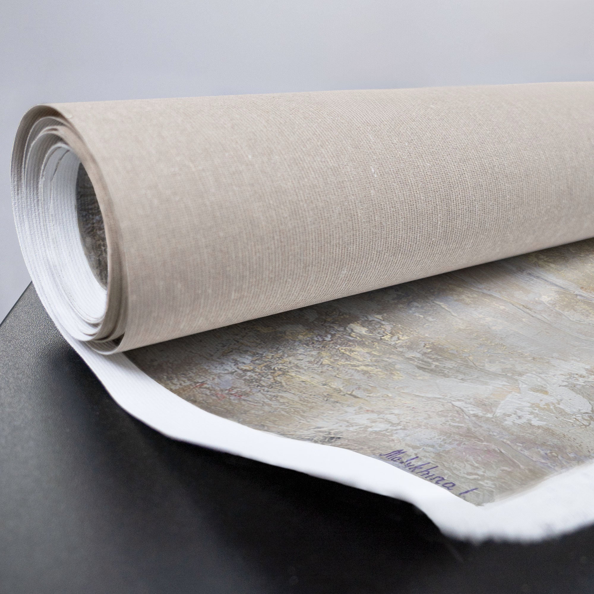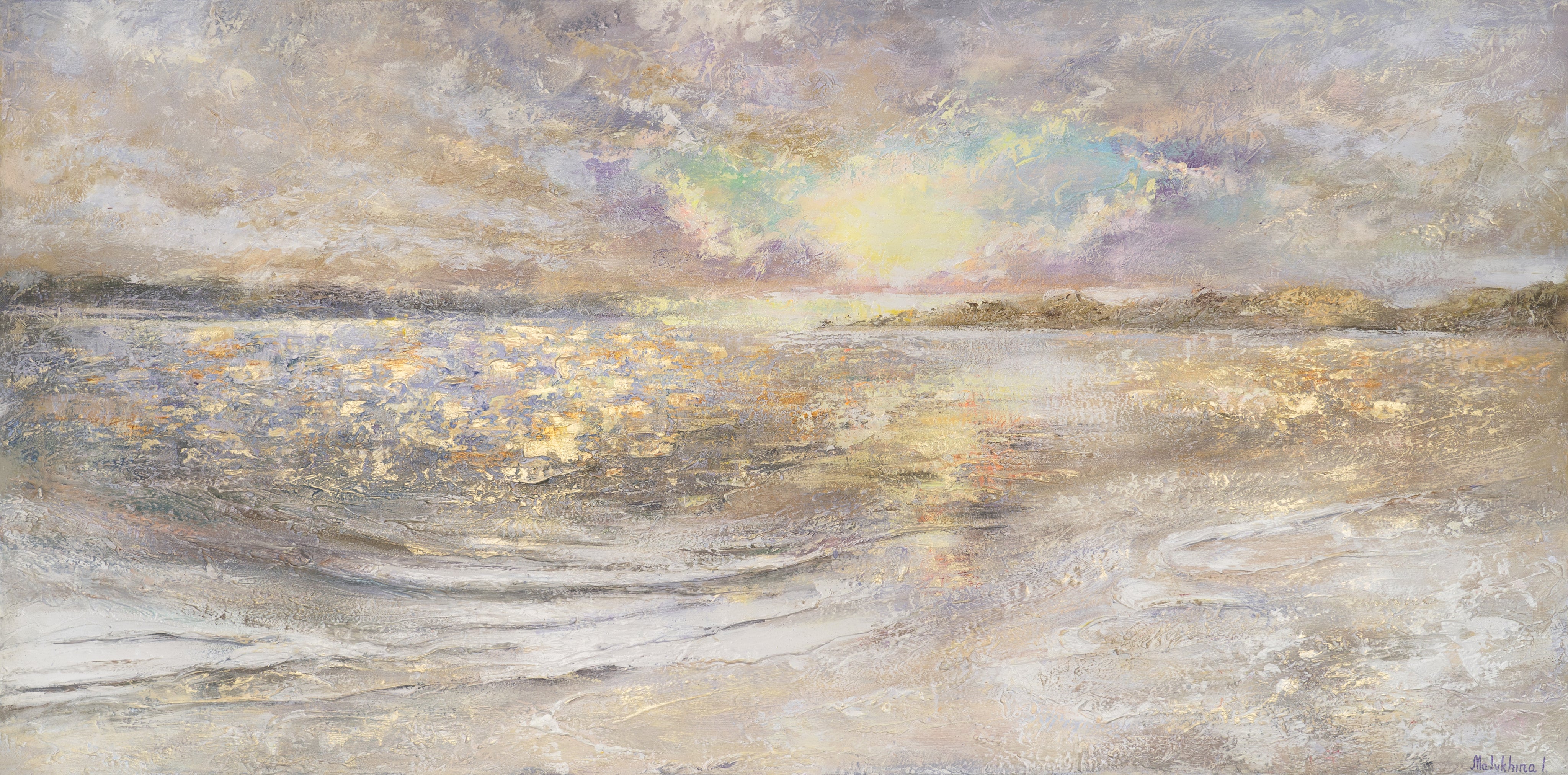 Käsinmaalattu akryylimaalaus „Meren Hämärä“ vangitsee merenrannan rauhallisen ja lempeän tunnelman hämärässä. Vaalea pastellisävyinen väripaletti hentojen kultakorostusten kera luo harmonisen ilmapiirin, joka täyttää tilan rauhalla ja eleganssilla. Kankaan teksturoitu pinta antaa sommittelulle syvyyttä ja elävyyttä, herättäen meren eloon.
