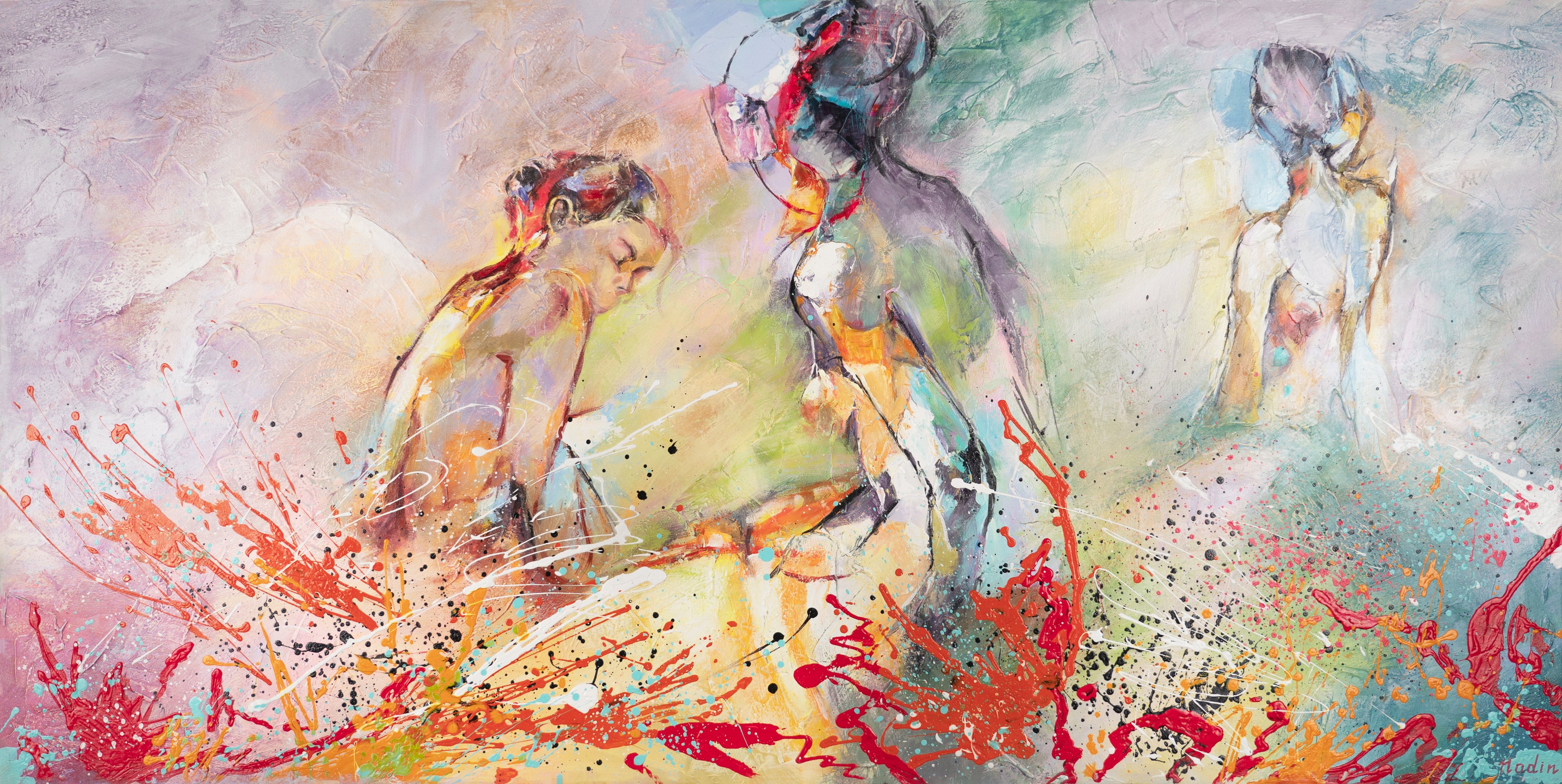 Tämä käsinmaalattu abstrakti akryylitaulu kankaalle tuo seinällesi puhdasta energiaa ja kesän hehkua. Kolme naisellista siluettia – hetkellisiä, aistillisia ja samalla voimakkaita – nousevat esiin värikylläisestä, teksturoidusta taustasta. Hehkuvan punainen, syvä oranssi ja viileä liila yhdistyvät dynaamisissa siveltimenvedoissa, kun eloisat roisketekniikat korostavat ilmeikästä sommitelmaa.